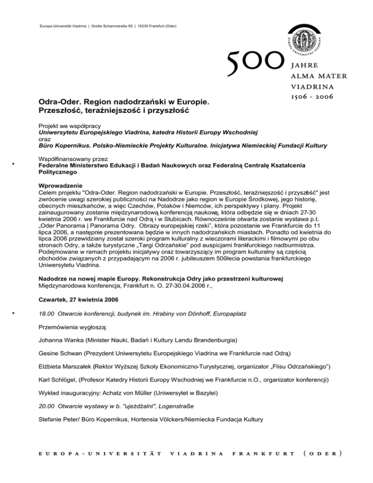 Europa-Universität Viadrina | Große Scharrnstraße 59 | 15230 Frankfurt (Oder) Odra- Uniwersytetu Europejskiego Viadrina, katedra Historii Europy Wschodniej oraz Büro Kopernikus. Polsko-Niemieckie Projekty Kulturalne. Inicjatywa Niemieckiej Fundacji Kultury Politycznego Wprowadzenie Celem projektu "Odra- " jest -30 „Oder Panorama | Panorama Odry. Obrazy europejskiej rzeki”, która pozostanie we Frankfurcie do 11 furckiego nadburmistrza. -lecia powstania frankfurckiego Uniwersytetu Viadrina. Nadodrze na nowej mapie Europy. Rekonstrukcja Odry jako przestrzeni kulturowej -30.04.2006 r., Czwartek, 27 kwietnia 2006 18.00 Otwarcie konferencji, budynek im. Hrabiny von Dönhoff, Europaplatz Johanna Gesine Schwan (Prezydent -Turystycznej, Karl Schlögel, (Profesor Katedry Historii Europy Wschodniej we Frankfurcie n.O., organizator konferencji) Achatz von Müller (Uniwersytet w Bazylei) Stefanie Peter/ Büro Kopernikus, Hortensia Völckers/Niemiecka Fundacja Kultury I. Odra a dyskursy o rzece Moderacja: Karl Schlögel 9.00 – Odra odkrywana na nowo Die Tageszeitung): 9.20 – 9.40 Andrzej Piskozub (Instytut Historii Jakiej monografii Odry nam potrzeba? 9.40 – 10.0010.20Niemiecko-francuskie dyskursy o Renie 10.40-11.00 Marek Zybura (Centrum im. Uwagi do literackiej biografii Odry ): 11.00-11.20 Tatjana Reitmann (Uniwersytet w Ostrawie): O etymologii nazw: Viadrus, Oder, Odra 11.20-12.00 Dyskusja 12.00-14.00 Przerwa obiadowa II. Elementy przestrzeni kulturowej Odry Moderacja: Beata Halicka 14.00-14.2 Walory przyrodnicze Odry 14.20-14.40 Eike Gringmuth-Dallmer (Berlin): Odra w czasach pra- i wczesnodziejowych 14.40-15.00 Horst Wernicke (Instytut Historii, Uniwersytet w Greifswaldzie): - Szczecin-Frankfurt– próba porównania 15.00-15.20 15.20-15.40 15.40-16.00 Stephan Kaiser (Haus Schlesien, Königswinter-Heisterbacherrott) Odra w muzeum ? 15.30 – 16.10 Dyskusja 16.10 – Odrze Moderacja: Marek Zawadka 16.30-16.50 Uwe Müller -europejskiej sieci szlaków komunikacyjnych a prusko-niemiecka polityka dróg wodnych 16.50-17.10 Horst 17.10- Fundacja Otwartego Muzeum Techniki, : Dziedzictwo kultury technicznej 17.30-18.00 Dyskusja 18.00-19.30 Kolacja Sobota, 29 kwietnia 2006 IV. Destrukcja Nadodrza jako przestrzeni kulturowej i próby jej odtworzenia Moderacja. Ruth Henning 9.00-9.20 Markus Krzoska (Uniwersytet w Moguncji): podczas i po drugiej 9.20-9.40 Bernadetta Nitschke (Instytut Politologii, Uniwersytet Zielonogórski): 9.40-10.00 Beata Halicka (Uniwersytet Viadrina we „Mòj dom nad Odr – 10.00Gospodarcze wykorzystanie Odry po1945 10.20-10.40 Prze - ): 10.40Niemiecko-polsko11.00Autoportret z . 11.40-12.30 Dyskusja 12.30-14.00 Przerwa obiadowa V. Nowe drogi na Odrze i w Nadodrzu Moderacja: Mariusz Urbanek (czasopismo „Odra”) 14.00-14.20 Historia Nadodrza – razem czy osobno? cinie): 14.20-14.40 Ruth Henning (Towarzystwo Polsko-Niemieckie w Poczdamie): Nadodrze -stara i nowa ojczyzna 14.40-15.00 Krzysztof Smolnicki ( Ekologia i turystyka rowerowa w dolinie Odry 15.00Program dla Odry 2006 - : . 15.2015.40Zagospodarowa -Turystyczna): – 16.40Rekonstrukcja europejskiej przestrzeni kulturowej - uwagi 17.00- 17.30 Dyskusja 17.30Europie – Od 19.00 Kolacja Niedziela, 30 kwietnia 2006 Wycieczka statkiem po Odrze z Frankfurtu do Kostrzyna, zwiedzanie kos Kierownik naukowy: prof. dr hab. Karl Schlögel Koordynacja: Wioletta Musekamp