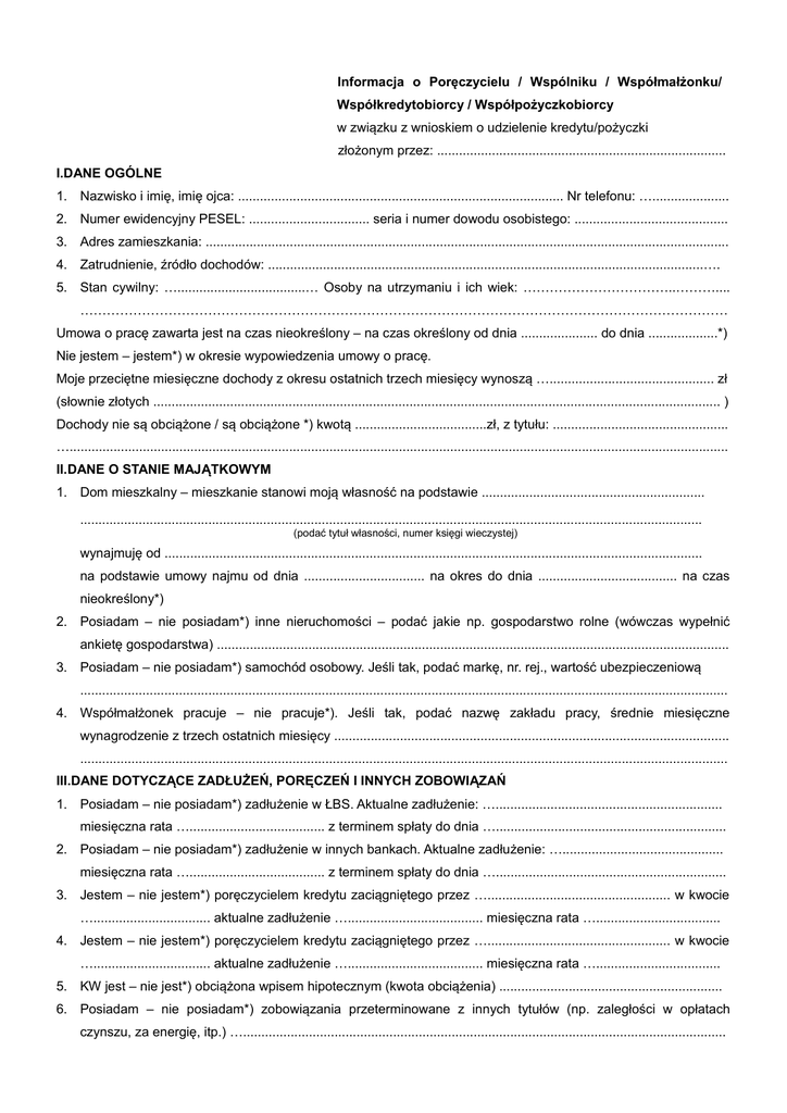 Informacja o Poręczycielu / Wspólniku / Współmałżonku/ Współkredytobiorcy / Współpożyczkobiorcy w związku z wnioskiem o udzielenie kredytu/pożyczki złożonym przez: ............................................................................... I.DANE OGÓLNE 1. Nazwisko i imię, imię ojca: ......................................................................................... Nr telefonu: …..................... 2. Numer ewidencyjny PESEL: ................................. seria i numer dowodu osobistego: .......................................... 3. Adres zamieszkania: ............................................................................................................................................... 4. Zatrudnienie, źródło dochodów: .......................................................................................................................…. 5. Stan cywilny: …...................................… Osoby na utrzymaniu i ich wiek: ……………………………..……….... ………………………………………………………………………………………………………………………………… Umowa o pracę zawarta jest na czas nieokreślony – na czas określony od dnia ..................... do dnia ...................*) Nie jestem – jestem*) w okresie wypowiedzenia umowy o pracę. Moje przeciętne miesięczne dochody z okresu ostatnich trzech miesięcy wynoszą …............................................. zł (słownie złotych ........................................................................................................................................................... ) Dochody nie są obciążone / są obciążone *) kwotą ....................................zł, z tytułu: ................................................ ….................................................................................................................................................................................... II.DANE O STANIE MAJĄTKOWYM 1. Dom mieszkalny – mieszkanie stanowi moją własność na podstawie ............................................................. .......................................................................................................................................................................... (podać tytuł własności, numer księgi wieczystej) wynajmuję od ................................................................................................................................................... na podstawie umowy najmu od dnia ................................. na okres do dnia ...................................... na czas nieokreślony*) 2. Posiadam – nie posiadam*) inne nieruchomości – podać jakie np. gospodarstwo rolne (wówczas wypełnić ankietę gospodarstwa) ............................................................................................................................................ 3. Posiadam – nie posiadam*) samochód osobowy. Jeśli tak, podać markę, nr. rej., wartość ubezpieczeniową ................................................................................................................................................................................. 4. Współmałżonek pracuje – nie pracuje*). Jeśli tak, podać nazwę zakładu pracy, średnie miesięczne wynagrodzenie z trzech ostatnich miesięcy ............................................................................................................ ................................................................................................................................................................................. III.DANE DOTYCZĄCE ZADŁUŻEŃ, PORĘCZEŃ I INNYCH ZOBOWIĄZAŃ 1. Posiadam – nie posiadam*) zadłużenie w ŁBS. Aktualne zadłużenie: ….............................................................. miesięczna rata …..................................... z terminem spłaty do dnia …............................................................... 2. Posiadam – nie posiadam*) zadłużenie w innych bankach. Aktualne zadłużenie: …............................................ miesięczna rata …..................................... z terminem spłaty do dnia …............................................................... 3. Jestem – nie jestem*) poręczycielem kredytu zaciągniętego przez ….................................................. w kwocie …................................ aktualne zadłużenie …..................................... miesięczna rata ….................................. 4. Jestem – nie jestem*) poręczycielem kredytu zaciągniętego przez ….................................................. w kwocie …................................ aktualne zadłużenie …..................................... miesięczna rata ….................................. 5. KW jest – nie jest*) obciążona wpisem hipotecznym (kwota obciążenia) ............................................................. 6. Posiadam – nie posiadam*) zobowiązania przeterminowane z innych tytułów (np. zaległości w opłatach czynszu, za energię, itp.) ….................................................................................................................................... IV.OŚWIADCZENIE 1. Wiarygodność podanych we wniosku danych stwierdzam własnoręcznym podpisem pod rygorem odpowiedzialności karnej z art. 297 § 1 Kodeksu Karnego. 2. 2. Niniejszym wyrażam zgodę na włączenie moich danych osobowych, do zbioru danych przetwarzanych w Banku w związku z ubieganiem się o kredyt a następnie w związku z ewentualną realizacją umowy kredytowej, na warunkach określonych w ustawie z dnia 29.08.1997r. o ochronie danych osobowych (Dz. U. z 2016 r., poz. 922). Administratorem danych jest Łącki Bank Spółdzielczy, z siedzibą w 33-390 Łącko 814. 3. 3. Na podstawie art. 24