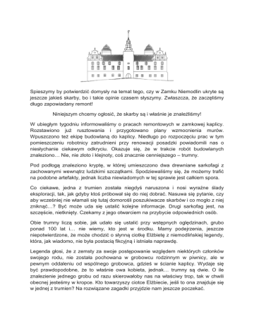 Spieszymy by potwierdzić domysły na temat tego, czy w Zamku Niemodlin ukryte są jeszcze jakieś skarby, bo i takie opinie czasem słyszymy. Zwłaszcza, że zaczęliśmy długo zapowiadany remont! Niniejszym chcemy ogłosić, że skarby są i właśnie je znaleźliśmy! W ubiegłym tygodniu informowaliśmy o pracach remontowych w zamkowej kaplicy. Rozstawiono już rusztowania i przygotowano plany wzmocnienia murów. Wpuszczono też ekipę budowlaną do kaplicy. Niedługo po rozpoczęciu prac w tym pomieszczeniu robotnicy zatrudnieni przy renowacji posadzki powiadomili nas o niesłychanie ciekawym odkryciu. Okazuje się, że w trakcie robót budowlanych znaleziono… Nie, nie złoto i klejnoty, coś znacznie cenniejszego – trumny. Pod podłogą znaleziono kryptę, w której umieszczono dwa drewniane sarkofagi z zachowanymi wewnątrz ludzkimi szczątkami. Spodziewaliśmy się, że możemy trafić na podobne artefakty, jednak liczba niewiadomych w tej sprawie jest całkiem spora. Co ciekawe, jedna z trumien została niegdyś naruszona i nosi wyraźne ślady eksploracji, tak, jak gdyby ktoś próbował się do niej dobrać. Nasuwa się pytanie, czy aby wcześniej nie włamali się tutaj domorośli poszukiwacze skarbów i co mogło z niej zniknąć…? Być może uda się ustalić kolejne informacje. Drugi sarkofag jest, na szczęście, nietknięty. Czekamy z jego otwarciem na przybycie odpowiednich osób. Obie trumny liczą sobie, jak udało się ustalić przy wstępnych oględzinach, grubo ponad 100 lat i… nie wiemy, kto jest w środku. Mamy podejrzenia, jeszcze niepotwierdzone, że może chodzić o słynną ciotkę Elżbietę z niemodlińskiej legendy, która, jak wiadomo, nie była postacią fikcyjną i istniała naprawdę. Legenda głosi, że z zemsty za swoje postępowanie względem niektórych członków swojego rodu, nie została pochowana w grobowcu rodzinnym w piwnicy, ale w pewnym oddaleniu od wspólnego grobowca, gdzieś w ścianie kaplicy. Wydaje się być prawdopodobne, że to właśnie owa kobieta, jednak… trumny są dwie. O ile znalezienie jednego grobu od razu skierowałoby nas na właściwy trop, tak w chwili obecnej jesteśmy w kropce. Kto towarzyszy ciotce Elżbiecie, jeśli to ona znajduje się w jednej z trumien? Na rozwiązane zagadki przyjdzie nam jeszcze poczekać. O naszym znalezisku, jak już pisaliśmy, w trybie pilnym został poinformowany Wojewódzki Konserwator Zabytków. Miejsce odkrycia trumien zostało przez nas starannie zabezpieczone, tak, by nie uszkodzić grobowca. Czekamy na specjalistów, którzy mają się zająć otwarciem grobu, oględzinami znajdujących się tam szczątków, datowaniem oraz ewentualnym badaniem mającym ustalić tożsamość pochowanych osób. O wszelkich szczegółach w toczącym się postępowaniu informować będziemy na bieżąco. Na szczęście znalezisko nie opóźniło dalszych prace renowacyjnych, które kontynuowane są w innych rejonach kaplicy. Informujemy również, iż mimo remontu Zamku, obiekt jest dostępny dla zwiedzających. Rusztowania i plac budowy zostały stosownie zabezpieczone i oznaczone.