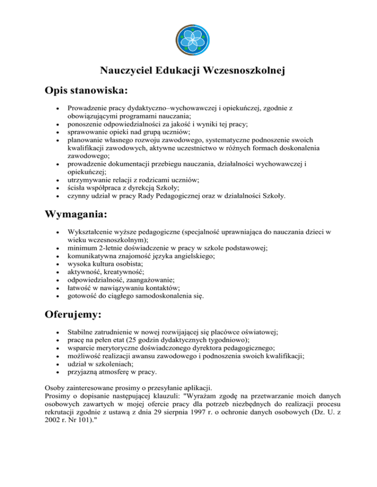 Nauczyciel Edukacji Wczesnoszkolnej Opis stanowiska: Wymagania