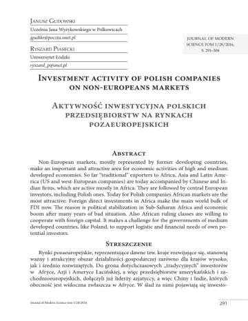 Janusz Gudowski Uczelnia Jana Wyżykowskiego w Polkowicach [email protected] Journal of Modern Science tom 1/28/2016, Ryszard Piasecki s. 291–304 Uniwersytet Łódzki [email protected] Investment activity of polish companies on non-europeans markets Aktywność inwestycyjna polskich przedsiębiorstw na rynkach pozaeuropejskich Abstract Non-European markets, mostly represented by former developing countries, make an important and attractive area for economic activities of high and medium developed economies. So far “traditional” exporters to Africa, Asia and Latin America (US and west-European companies) are today accompanied by Chinese and Indian firms, which are active mostly in Africa. They are followed by central European investors, including Polish ones. Today for Polish companies African markets are the most attractive. Foreign direct investments in Africa make the main world bulk of FDI now. The reason is political stabilization in Sub-Saharan Africa and economic boom after many years of bad situation. Also African ruling classes are willing to cooperate with foreign capital. It makes a challenge for the governments of medium developed countries, like Poland, to support logistic and financial needs of own potential investors. Streszczenie Rynki pozaeuropejskie, reprezentujące dawne tzw. kraje rozwijające się, stanowią ważny i atrakcyjny obszar działalności gospodarczej zarówno dla krajów wysoko, jak i średnio rozwiniętych. Do grona dotychczasowych „tradycyjnych” inwestorów w Afryce, Azji i Ameryce Łacińskiej, a więc przedsiębiorstw amerykańskich i zachodnioeuropejskich, dołączyli już liderzy azjatyccy, a więc Chiny i Indie, których obecność jest widoczna zwłaszcza w Afryce. W ślad za nimi pojawiają się inwestoJournal of Modern Science tom 1/28/2016 291 JANUSZ GUDOWSKI, RYSZARD PIASECKI rzy ze średnio rozwiniętych gospodarek, w tym z Polski. Najbardziej obiecujące dla polskiego kapitału, jak się wydaje w obecnej sytuacji światowej, są dziś rynki afrykańskie. Inwestycje zagraniczne w Afryce to obecnie trend ogólnoświatowy. Przyczynia się do tego coraz bardziej stabilna sytuacja polityczna w Afryce Subsaharyjskiej oraz ożywienie gospodarcze po wielu latach rozlicznych problemów. Nowa sytuacja w tej części świata uwidacznia się w postawie tutejszych rządów, które są skłonne, jak nigdy dotąd, współpracować z zagranicznymi partnerami. To także wyzwania dla rządzących w krajach średnio rozwiniętych, których działania powinny uwzględniać potrzeby logistyczne i finansowe potencjalnych inwestorów w celu udanej ekspansji. Keywords: direct foreign investment, non-Europeans markets, theoretical approach, institutional limitations, Polish investors Słowa kluczowe: bezpośrednie inwestycje zagraniczne, rynki krajów pozaeuropejskich, ujęcie teoretyczne, ograniczenia instytucjonalne, polscy inwestorzy Wprowadzenie Polskie przedsiębiorstwa, tak jak przedsiębiorstwa z innych krajów o zbliżonym lub wyższym poziomie rozwoju, poszukują rynków trzecich dla podjęcia działalności gospodarczej, w tym zwłaszcza korzystnego zainwestowania kapitału. Zainwestowanie to odbywa się różnymi drogami. Łatwiejsza jest droga zakupu istniejącego przedsiębiorstwa (ang. brownfield investment) bądź stworzenie z partnerem zagranicznym joint venture (o ile partner okaże się wiarygodny), za to ambitniejszą, ale trudną i bardziej ryzykowną drogą są inwestycje typu greenfield, czyli stworzenie od podstaw przedsiębiorstwa, które z reguły daje w długim okresie lepsze wyniki finansowe. Trudności gospodarcze w krajach wysoko rozwiniętych wzmogły swoisty wyścig potencjalnych inwestorów w poszukiwaniu nowych obszarów działalności. Niewykluczone, że ten wyścig ulegnie wkrótce dalszemu nasileniu w związku ze spowolnieniem wzrostu gospodarczego Chin, głównego inwestora w ostatnich latach w Afryce. Miejsce Chin, jako głównego inwestora, prawdopodobnie zajęłyby Indie. Wiodącą rolę w bezpośrednich inwestycjach odgrywają wielkie koncerny. Jednakże dla średnio rozwiniętej gospodarki, w której istnieje niewiele rodzimych koncernów, a narodowy kapitał jest mało konkurencyjny, istotniejsza byłaby ekspansja przedsiębiorstw o mniejszym potencjale. Czy 292 Journal of Modern Science tom 1/28/2016 AKTYWNOŚĆ INWESTYCYJNA POLSKICH PRZEDSIĘBIORSTW NA RYNKACH... jednak w warunkach gospodarki typu polska taka ekspansja kapitałowa jest możliwa bez wsparcia instytucjonalnego, logistycznego, a nawet finansowego (na przykład kredytowego) ze strony państwa? Zdaniem autorów takie wsparcie jest nieodzowne. To stwierdzenie stanowi tezę przyjętą na potrzeby tekstu. Przegląd teoretycznych uwarunkowań bezpośrednich inwestycji zagranicznych Teoria dotycząca bezpośrednich inwestycji zagranicznych (uwarunkowań; możliwości efektywnego wykorzystania itd.) korzysta z różnych wątków, wypracowanych niejako przy okazji rozważań nad cyklem inwestycyjnym czy starzeniem się inwestycji. Prace teoretyczne na temat tych zagadnień powstały blisko 50 lat temu, stąd ich uniwersalność i możliwości zastosowania w warunkach dzisiejszej sytuacji gospodarki światowej są podważane. W latach 60. XX w. Amerykanin Raymond Vernon opisał prawidłowości cyklu życia produktu. Polegają one na przemieszczaniu się produkcji: w miarę starzenia się produktu pod względem technologicznym jego wytwarzanie zostaje przeniesione, gdzie występują niższe koszty produkcji, a rynki są najmniej wymagające. W późniejszej fazie dochodzi do jego powrotu (importu) na rynek pierwotny (Vernon, 1966). Z kolei Brytyjczyk John Harry Dunning analizował czynniki skłaniające przedsiębiorstwa do podejmowania inwestycji zagranicznych. Na podstawie opracowanego przez siebie wskaźnika Dunning określił fazy zaawansowania gospodarczego. Wskaźnik ten opisuje aktywność inwestycyjną rodzimego kapitału oraz intensywność napływu i