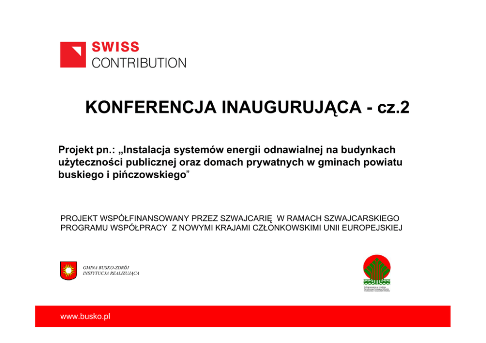 KONFERENCJA INAUGURUJĄCA - cz.2 Projekt pn.: „Instalacja systemów energii odnawialnej na budynkach użyteczności publicznej oraz domach prywatnych w gminach powiatu buskiego i pińczowskiego” PROJEKT WSPÓŁFINANSOWANY PRZEZ SZWAJCARIĘ W RAMACH SZWAJCARSKIEGO PROGRAMU WSPÓŁPRACY Z NOWYMI KRAJAMI CZŁONKOWSKIMI UNII EUROPEJSKIEJ GMINA BUSKO-ZDRÓJ INSTYTUCJA REALIZUJĄCA www.busko.pl Instalacja systemów energii odnawialnej na budynkach użyteczności publicznej oraz domach prywatnych w gminach powiatu buskiego i pińczowskiego GENEZA PROJEKTU PROJEKT WSPÓŁFINANSOWANY PRZEZ SZWAJCARIĘ W RAMACH SZWAJCARSKIEGO PROGRAMU WSPÓŁPRACY Z NOWYMI KRAJAMI CZŁONKOWSKIMI UNII EUROPEJSKIEJ GMINA BUSKO-ZDRÓJ INSTYTUCJA REALIZUJĄCA www.busko.pl Geneza projektu Cel projektu: • poprawa stanu środowiska; • poprawa bilansu energetycznego; • poprawa jakości życia mieszkańców; • promocja ekologicznych nośników energii GMINA BUSKO-ZDRÓJ INSTYTUCJA REALIZUJĄCA www.busko.pl Geneza projektu • • • • • List intencyjny – marzec 2009 r. Zarys Projektu – kwiecień 2009 r. Porozumienie międzygminne – styczeń 2011 r. Kompletna Propozycja Projektu – marzec 2011 r. Umowa o dofinansowanie projektu – styczeń/luty 2012 r. GMINA BUSKO-ZDRÓJ INSTYTUCJA REALIZUJĄCA www.busko.pl List intencyjny W marcu 2009 roku samorządy powiatu buskiego i pińczowskiego, zainteresowane wspólną realizacją projektu o roboczej nazwie “Kolektory słoneczne”, podpisały list intencyjny w sprawie przygotowania i wdrożenia projektu oraz pozyskania na ten cel zewnętrznych środków finansowych. GMINA BUSKO-ZDRÓJ INSTYTUCJA REALIZUJĄCA www.busko.pl Geneza projektu • Lider projektu ‐ Gmina Busko‐Zdrój. • Gminy partnerskie: Gnojno, Nowy Korczyn, Pacanów, Solec‐Zdrój, Stopnica, Tuczępy, Wiślica, Pińczów i Kije GMINA BUSKO-ZDRÓJ INSTYTUCJA REALIZUJĄCA www.busko.pl Zarys Projektu W dniu 17 kwietnia 2009 roku w siedzibie Władzy Wdrażającej Programy Europejskie (WWPE) w Warszawie został złożony Zarys Projektu pn.: „Instalacja systemów energii odnawialnej na budynkach użyteczności publicznej oraz domach prywatnych w gminach powiatu buskiego i pińczowskiego” GMINA BUSKO-ZDRÓJ INSTYTUCJA REALIZUJĄCA www.busko.pl Zarys Projektu W ramach trwającego wówczas naboru dla obszaru tematycznego „Odbudowa, remont, przebudowa i rozbudowa podstawowej infrastruktury oraz poprawa stanu środowiska” oraz celu 2: „Zwiększenie wydajności energii i redukcji emisji, w szczególności gazów cieplarnianych i niebezpiecznych substancji poprzez wprowadzenie systemów energii odnawialnej” złożonych zostało 75 Zarysów Projektów. GMINA BUSKO-ZDRÓJ INSTYTUCJA REALIZUJĄCA www.busko.pl 2 Zarys Projektu • Uzupełnienie Zarysu Projektu po ocenie formalnej ‐ maj 2009 r.; • Zakończenie oceny merytorycznej i skierowanie Zarysu Projektu do oceny przez stronę szwajcarską ‐ sierpień 2009 r. • Wizyta przedstawicieli Biura Szwajcarsko‐ Polskiego Programu Współpracy jako element oceny Zarysu Projektu – czerwiec 2010 r. GMINA BUSKO-ZDRÓJ INSTYTUCJA REALIZUJĄCA www.busko.pl Wizyta przedstawicieli Biura SzwajcarskoPolskiego Programu Współpracy GMINA BUSKO-ZDRÓJ INSTYTUCJA REALIZUJĄCA www.busko.pl Zarys Projektu Zarys projektu został ostatecznie zaakceptowany przez stronę szwajcarską w sierpniu 2010 roku a Gmina Busko‐Zdrój, jako Instytucja Realizująca, została wezwana do złożenia Kompletnej Propozycji Projektu (KPP). GMINA BUSKO-ZDRÓJ INSTYTUCJA REALIZUJĄCA www.busko.pl Kompletna Propozycja Projektu Kompletna Propozycja Projektu to szczegółowy wniosek wraz z załącznikami – m.in. studium wykonalności projektu. Jest ona sporządzona w języku polskim i angielskim. Dokument ten został złożony w dniu 14 marca 2011 roku. GMINA BUSKO-ZDRÓJ INSTYTUCJA REALIZUJĄCA www.busko.pl Kompletna Propozycja Projektu Wizyta eksperta ds. energetyki solarnej w dniu 1 kwietnia 2011 r. GMINA BUSKO-ZDRÓJ INSTYTUCJA REALIZUJĄCA www.busko.pl Kompletna Propozycja Projektu Wizyta eksperta ds. energetyki solarnej w dniu 1 kwietnia 2011 r. GMINA BUSKO-ZDRÓJ INSTYTUCJA REALIZUJĄCA www.busko.pl Kompletna Propozycja Projektu • Weryfikacja KPP przez Instytucję Zarządzającą (WWPE) – kwiecień 2011 r. • Weryfikacja KPP orzez Krajową Instytucję Koordynującą (MRR) – maj 2011 r. • Przekazanie KPP stronie szwajcarskiej – maj 2011 r. • Ostateczna akceptacja KPP przez stronę szwajcarską – listopad 2011 r. GMINA BUSKO-ZDRÓJ INSTYTUCJA REALIZUJĄCA www.busko.pl Umowa o dofinansowanie projektu • Umowa w sprawie projektu między stroną polską (MRR) i stroną szwajcarską została podpisana w dniu 16 stycznia 2012 r. • W dniu 20 lutego 2012 r. Gmina Busko‐Zdrój, jako Instytucja Realizująca, podpisała umowę w sprawie realizacji projektu z WWPE. GMINA BUSKO-ZDRÓJ INSTYTUCJA REALIZUJĄCA www.busko.pl Dziękujemy za uwagę. PROJEKT WSPÓŁFINANSOWANY PRZEZ SZWAJCARIĘ W RAMACH SZWAJCARSKIEGO PROGRAMU WSPÓŁPRACY Z NOWYMI KRAJAMI CZŁONKOWSKIMI UNII EUROPEJSKIEJ PROJEKT WSPÓŁFINANSOWANY PRZEZ NARODOWY FUNDUSZ OCHRONY ŚRODOWISKA I GOSPODARKI WODNEJ GMINA BUSKO-ZDRÓJ INSTYTUCJA REALIZUJĄCA www.busko.pl