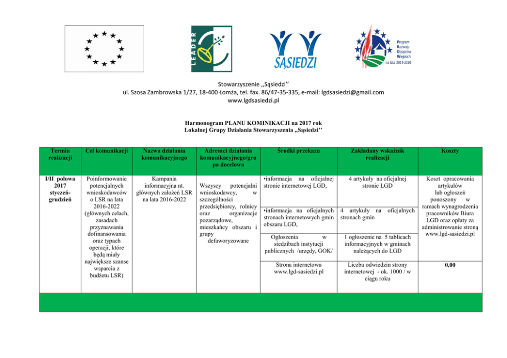 Stowarzyszenie ,,Sąsiedzi’’ ul. Szosa Zambrowska 1/27, 18-400 Łomża, tel. fax. 86/47-35-335, e-mail: [email protected] www.lgdsasiedzi.pl Harmonogram PLANU KOMINIKACJI na 2017 rok Lokalnej Grupy Działania Stowarzyszenia ,,Sąsiedzi’’ Termin realizacji Cel komunikacji Nazwa działania komunikacyjnego I/II połowa 2017 styczeńgrudzień Poinformowanie potencjalnych wnioskodawców o LSR na lata 2016-2022 (głównych celach, zasadach przyznawania dofinansowania oraz typach operacji, które będą miały największe szanse wsparcia z budżetu LSR) Kampania informacyjna nt. głównych założeń LSR na lata 2016-2022 Adresaci działania komunikacyjnego/gru pa docelowa Wszyscy potencjalni wnioskodawcy, w szczególności przedsiębiorcy, rolnicy oraz organizacje pozarządowe, mieszkańcy obszaru i grupy defaworyzowane Środki przekazu Zakładany wskaźnik realizacji Koszty •informacja na oficjalnej stronie internetowej LGD, 4 artykuły na oficjalnej stronie LGD Koszt opracowania artykułów lub ogłoszeń ponoszony w ramach wynagrodzenia pracowników Biura LGD oraz opłaty za administrowanie stroną www.lgd-sasiedzi.pl •informacja na oficjalnych stronach internetowych gmin obszaru LGD, 4 artykuły na stronach gmin oficjalnych Ogłoszenia w siedzibach instytucji publicznych /urzędy, GOK/ 1 ogłoszenie na 5 tablicach informacyjnych w gminach należących do LGD Strona internetowa www.lgd-sasiedzi.pl Liczba odwiedzin strony internetowej - ok. 1000 / w ciągu roku 0,00 Stowarzyszenie ,,Sąsiedzi’’ ul. Szosa Zambrowska 1/27, 18-400 Łomża, tel. fax. 86/47-35-335, e-mail: [email protected] www.lgdsasiedzi.pl I/II połowa 2017 – kwiecieńlipiec Poinformowanie potencjalnych wnioskodawców o głównych zasadach interpretacji poszczególnych kryteriów oceny używanych przez Radę LGD ( zwłaszcza kryteriów jakościowych Kampania informacyjna nt.. zasad oceniania i wyboru operacji przez LGD Wszyscy potencjalni wnioskodawcy, w szczególności przedsiębiorcy, organizacje pozarządowe i mieszkańcy obszaru Organizacja spotkań informacyjno – konsultacyjnych dla potencjalnych wnioskodawców - ok. 15 osób na każdym spotkaniu ( badanie ankietowe po zakończonym spotkaniu) 5 spotkań – informacyjno – konsultacyjnych Koszt zadania obejmuje wynajem sali konferencyjnej; 300 zł x 5, oraz catering w postaci kawy, herbaty, ciasta, ciastek, wody itp. 100 zł x 5. Łączny koszt planowanego zadania ok. 2000 tys. zł Opublikowanie artykułów lub ogłoszeń w prasie 2 artykuły lub ogłoszenia w prasie Koszt zadania obejmuje koszt związany z zamieszczeniem artykułu lub ogłoszenia w prasie – ok. 400 zł Stowarzyszenie ,,Sąsiedzi’’ ul. Szosa Zambrowska 1/27, 18-400 Łomża, tel. fax. 86/47-35-335, e-mail: [email protected] www.lgdsasiedzi.pl I/II połowa 2017 styczeń grudzień Poinformowanie potencjalnych wnioskodawców o LSR na lata 2016-2022 (głównych celach, zasadach przyznawania dofinansowania oraz typach operacji, które będą miały największe szanse wsparcia z budżetu LSR) Kampanie promocyjne dotyczące wdrażania LSR Wszyscy potencjalni wnioskodawcy, w szczególności przedsiębiorcy, rolnicy oraz organizacje pozarządowe, mieszkańcy obszaru i grupy defaworyzowane Współorganizacja imprezy plenerowej i turnieju piłki nożnej. Koszt zadania obejmuje – catering dla uczestników imprezy około - 1 500 zł, zakup nagród, medali, pucharów itp. dla uczestników turnieju około - 1500 zł oraz obsługa medyczna - 300 zł, wynajem balonu wspinaczkowego 700 zł itp. W ramach współorganizacji imprezy plenerowej Stowarzyszenie ,,Sąsiedzi’’ zorganizuje stoisko wystawowe podczas, którego udzielane będą informacje o założeniach realizacji LSR. Liczba imprez/wystaw/ targów w których LGD weźmie dział – 1 szt. 4 000 tys. zł Uczestnictwo w szkoleniach wewnętrznych i zewnętrznych Liczba szkoleń wewnętrznych i zewnętrznych - ok. 4 szt. Koszt około 15 000 tys. zł Stowarzyszenie ,,Sąsiedzi’’ ul. Szosa Zambrowska 1/27, 18-400 Łomża, tel. fax. 86/47-35-335, e-mail: [email protected] www.lgdsasiedzi.pl Realizowane zadanie na ma celu organizację warsztatów z zakresu ekologii/ochrony środowiska. Poprzez wskazane działanie rozumie się organizację warsztatów w trakcie których wykorzystywane będą surowce wtórne do tworzenia przedmiotów i ozdób codziennego użytku. (Liczba zrekrutowanych osób - 30). Koszt zadania obejmuje: koszt trenera wraz z niezbędnymi materiałami – 1000 zł, wynajmu Sali – 300 zł, catering – 400 zł Konkurs - ,,Aktywni Mieszkańcy’’ Zadaniem konkursu jest wyłonienie najciekawszego lub najciekawszych pomysłów dotyczących integracji społeczności lokalnej mieszczącej się w jednej z trzech kategoriach: a) Turystyka, rekreacja i promocja, b) Kultywowanie dziedzictwa lokalnego, c) Inicjatywy lokalne na rzecz społecznej integracji W ramach konkursu wyłoniony zostanie najciekawszy pomysł/y, które sfinansuje Stowarzyszenie ,,Sąsiedzi’’ Celem konkursu jest wspieranie rozwoju obszarów wiejskich poprzez pobudzanie aktywności lokalnej. Liczba działań aktywizujących promujących dobre praktyki – 1 szt. 1 700 zł Liczba działań aktywizujących/pro mujących dobre praktyki – 1 szt. 20 000 zł Stowarzyszenie ,,Sąsiedzi’’ ul. Szosa Zambrowska 1/27, 18-400 Łomża, tel. fax. 86/47-35-335, e-mail: [email protected] www.lgdsasiedzi.pl Konkurs skierowany będzie do osób fizycznych,organizacji pozarządowych, jst oraz grupach nieformalnych, które podejmą się integracji społeczności lokalnej. Wydanie publikacji związanej z ochroną środowiska obszaru LGD. Koszt zadania obejmował będzie usługi poligraficzne z zakresu druku oraz składu graficznego jak również zakupu i udostępnienia fotografii na rzecz publikacji. Z uwagi na dość odległy termin realizacji zadania, takie parametry jak ilość czy format publikacji zostanie dookreślony w późniejszym terminie na podstawie zapytania ofe