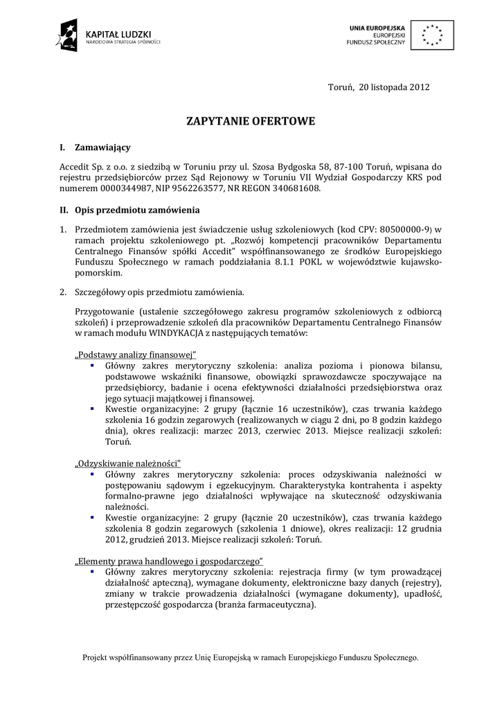 Toruń, 20 listopada 2012 ZAPYTANIE OFERTOWE I. Zamawiający Accedit Sp. z o.o. z siedzibą w Toruniu przy ul. Szosa Bydgoska 58, 87-100 Toruń, wpisana do rejestru przedsiębiorców przez Sąd Rejonowy w Toruniu VII Wydział Gospodarczy KRS pod numerem 0000344987, NIP 9562263577, NR REGON 340681608. II. Opis przedmiotu zamówienia 1. Przedmiotem zamówienia jest świadczenie usług szkoleniowych (kod CPV: 80500000-9) w ramach projektu szkoleniowego pt. „Rozwój kompetencji pracowników Departamentu Centralnego Finansów spółki Accedit” współfinansowanego ze środków Europejskiego Funduszu Społecznego w ramach poddziałania 8.1.1 POKL w województwie kujawskopomorskim. 2. Szczegółowy opis przedmiotu zamówienia. Przygotowanie (ustalenie szczegółowego zakresu programów szkoleniowych z odbiorcą szkoleń) i przeprowadzenie szkoleń dla pracowników Departamentu Centralnego Finansów w ramach modułu WINDYKACJA z następujących tematów: „Podstawy analizy finansowej” Główny zakres merytoryczny szkolenia: analiza pozioma i pionowa bilansu, podstawowe wskaźniki finansowe, obowiązki sprawozdawcze spoczywające na przedsiębiorcy, badanie i ocena efektywności działalności przedsiębiorstwa oraz jego sytuacji majątkowej i finansowej. Kwestie organizacyjne: 2 grupy (łącznie 16 uczestników), czas trwania każdego szkolenia 16 godzin zegarowych (realizowanych w ciągu 2 dni, po 8 godzin każdego dnia), okres realizacji: marzec 2013, czerwiec 2013. Miejsce realizacji szkoleń: Toruń. „Odzyskiwanie należności” Główny zakres merytoryczny szkolenia: proces odzyskiwania należności w postępowaniu sądowym i egzekucyjnym. Charakterystyka kontrahenta i aspekty formalno-prawne jego działalności wpływające na skuteczność odzyskiwania należności. Kwestie organizacyjne: 2 grupy (łącznie 20 uczestników), czas trwania każdego szkolenia 8 godzin zegarowych (szkolenia 1 dniowe), okres realizacji: 12 grudnia 2012, grudzień 2013. Miejsce realizacji szkoleń: Toruń. „Elementy prawa handlowego i gospodarczego” Główny zakres merytoryczny szkolenia: rejestracja firmy (w tym prowadzącej działalność apteczną), wymagane dokumenty, elektroniczne bazy danych (rejestry), zmiany w trakcie prowadzenia działalności (wymagane dokumenty), upadłość, przestępczość gospodarcza (branża farmaceutyczna). Projekt współfinansowany przez Unię Europejską w ramach Europejskiego Funduszu Społecznego. Kwestie organizacyjne: 2 grupy (łącznie 20 uczestników), czas trwania każdego szkolenia 16 godzin zegarowych (realizowanych w ciągu 2 dni, po 8 godzin każdego dnia), okres realizacji: lipiec 2013, luty 2014. Miejsce realizacji szkoleń: Toruń. „Gospodarka finansowa szpitali” Główny zakres merytoryczny szkolenia: zasady kontraktowania usług, planowanie przychodów i kosztów, planowana komercjalizacja i jej skutki. Kwestie organizacyjne: 1 grupa, 5 uczestników, czas trwania szkolenia 8 godzin zegarowych (szkolenie 1 dniowe), okres realizacji: kwiecień 2014. Miejsce realizacji szkoleń: Toruń. III. Wymagania dotyczące Oferentów Oferty mogą składać wyłącznie Wykonawcy, którzy posiadają doświadczenie w prowadzeniu min. 10 zamkniętych szkoleń z tematyki objętej niniejszym zapytaniem, w tym po min. 1 szkoleniu z każdego tematu wymienionego w pkt. II 2 zapytania. Wykonawca oddeleguje do prowadzenia szkoleń min. 3 trenerów, którzy posiadają szeroką wiedzę z zakresów merytorycznych szkoleń oraz z zakresu specyfiki funkcjonowania grup kapitałowych od strony finansowej. Z możliwości realizacji przedmiotu zamówienia wykluczone są podmioty, które powiązane są osobowo lub kapitałowo z Zamawiającym. IV. Kryteria oceny ofert 1. Kryterium wyboru jest cena (100%). Zostanie wybrany Wykonawca, który zaoferuje najniższą cenę za przygotowanie i przeprowadzenie szkoleń. 2. Oferta cenowa powinna obejmować: a. Koszty przygotowania programów szkoleń (w tym konsultacje telefoniczne i mailowe z odbiorcą szkoleń w celu omówienia szczegółów merytorycznych) oraz testów kompetencji dla każdej grupy. b. Koszty przeprowadzenia szkoleń z uwzględnieniem: wynagrodzenia trenera, jego wyżywienia i ewentualnego dojazdu oraz zakwaterowania; materiałów szkoleniowych (po 1 egzemplarzu dla każdego uczestnika szkolenia + 1 egzemplarz archiwalny na każdą grupę); druku dokumentacji szkoleniowej: dziennika, certyfikatów i ankiet ewaluacyjnych – (wzory tych dokumentów zostaną dostarczone przez Zamawiającego) oraz pre- i posttestów kompetencji. Certyfikaty, ankiety oraz pre i post testy należy przygotować dla każdego uczestnika. V. Termin i sposób składania ofert 1. Oferta musi zostać złożona na wzorze stanowiącym Załącznik 1 do Zapytania ofertowego. Oferty złożone w innej formie nie będą podlegały ocenie. 2. Oferta musi zawierać kwoty netto, w przeciwnym razie oferta nie będzie podlegała ocenie. 3. Ofertę należy przesyłać mailem (forma preferowana przez Zamawiającego) na adres: [email protected] lub przesłać na adres Zamawiającego: ul. Szosa Bydgoska 58, 87-100 Toruń z dopiskiem na kopercie „Dla Grażyny Czapiewskiej. Oferta dot. projektu dla DCF.” do dnia 4.12.2012 do godz. 15.00 wraz z załączoną kserokopią wpisu do rejestru przedsiębiorców lub zaświadczenia z ewidencji działalności gospodarczej, wystawione z datą nie Projekt współfinansowany przez Unię Europejską w ramach Europejskiego Funduszu Społecznego. wcześniejszą niż sześć miesięcy przed datą złożenia oferty. W przypadku dostarczenia oferty drogą pocztową proszę o przesłanie informacji o tym mailem na adres: [email protected] 4. Oferty złożone po terminie nie będą rozpatrywane. 5. Oferent może przed upływem terminu składania ofert zmienić lub wycofać swoją ofertę. 6. Zapytanie ofertowe zamieszczono w siedzibie i na stronie www Zamawiającego. 7. Zamawiający zastrzega sobie prawo do unieważnienia postępo