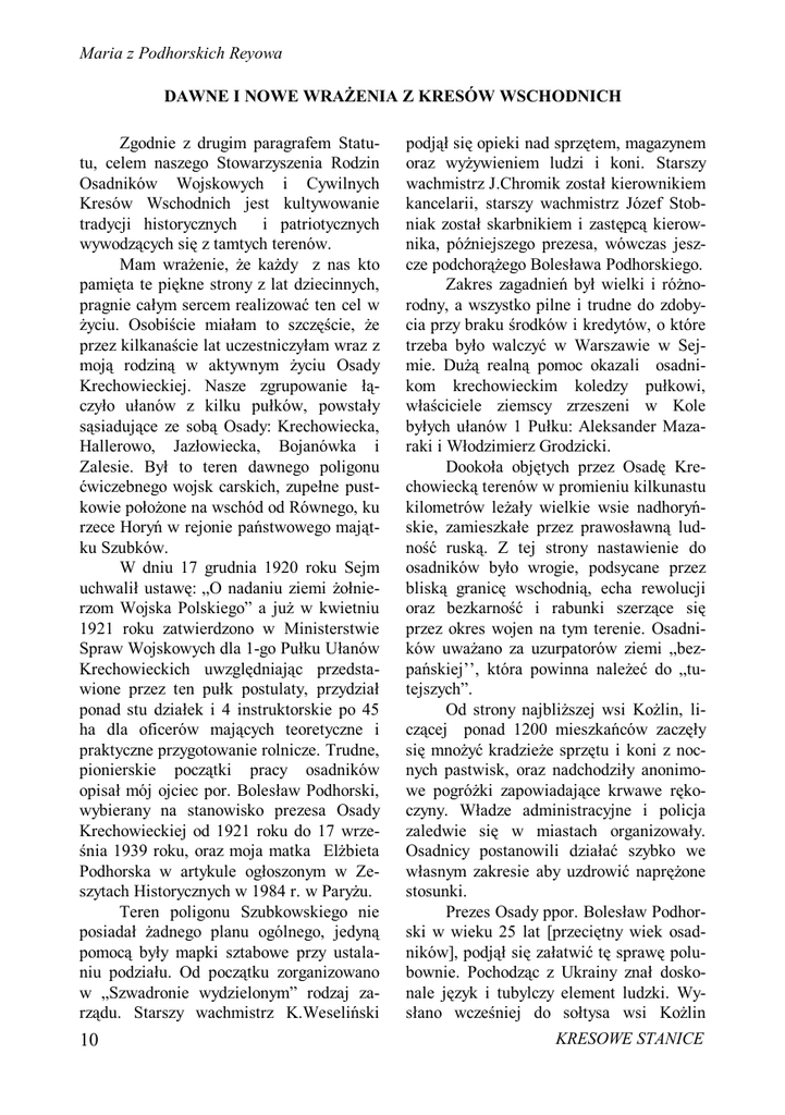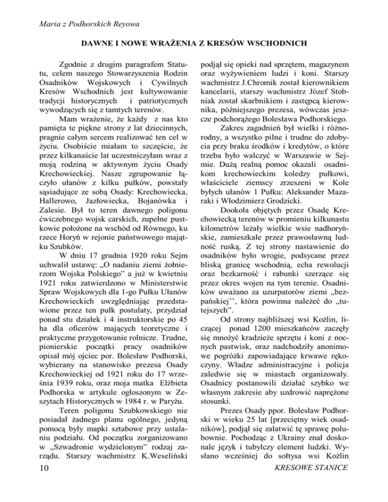 Maria z Podhorskich Reyowa DAWNE I NOWE WRAŻENIA Z KRESÓW WSCHODNICH Zgodnie z drugim paragrafem Statutu, celem naszego Stowarzyszenia Rodzin Osadników Wojskowych i Cywilnych Kresów Wschodnich jest kultywowanie tradycji historycznych i patriotycznych wywodzących się z tamtych terenów. Mam wrażenie, że każdy z nas kto pamięta te piękne strony z lat dziecinnych, pragnie całym sercem realizować ten cel w życiu. Osobiście miałam to szczęście, że przez kilkanaście lat uczestniczyłam wraz z moją rodziną w aktywnym życiu Osady Krechowieckiej. Nasze zgrupowanie łączyło ułanów z kilku pułków, powstały sąsiadujące ze sobą Osady: Krechowiecka, Hallerowo, Jazłowiecka, Bojanówka i Zalesie. Był to teren dawnego poligonu ćwiczebnego wojsk carskich, zupełne pustkowie położone na wschód od Równego, ku rzece Horyń w rejonie państwowego majątku Szubków. W dniu 17 grudnia 1920 roku Sejm uchwalił ustawę: „O nadaniu ziemi żołnierzom Wojska Polskiego” a już w kwietniu 1921 roku zatwierdzono w Ministerstwie Spraw Wojskowych dla 1-go Pułku Ułanów Krechowieckich uwzględniając przedstawione przez ten pułk postulaty, przydział ponad stu działek i 4 instruktorskie po 45 ha dla oficerów mających teoretyczne i praktyczne przygotowanie rolnicze. Trudne, pionierskie początki pracy osadników opisał mój ojciec por. Bolesław Podhorski, wybierany na stanowisko prezesa Osady Krechowieckiej od 1921 roku do 17 września 1939 roku, oraz moja matka Elżbieta Podhorska w artykule ogłoszonym w Zeszytach Historycznych w 1984 r. w Paryżu. Teren poligonu Szubkowskiego nie posiadał żadnego planu ogólnego, jedyną pomocą były mapki sztabowe przy ustalaniu podziału. Od początku zorganizowano w „Szwadronie wydzielonym” rodzaj zarządu. Starszy wachmistrz K.Weseliński 10 podjął się opieki nad sprzętem, magazynem oraz wyżywieniem ludzi i koni. Starszy wachmistrz J.Chromik został kierownikiem kancelarii, starszy wachmistrz Józef Stobniak został skarbnikiem i zastępcą kierownika, późniejszego prezesa, wówczas jeszcze podchorążego Bolesława Podhorskiego. Zakres zagadnień był wielki i różnorodny, a wszystko pilne i trudne do zdobycia przy braku środków i kredytów, o które trzeba było walczyć w Warszawie w Sejmie. Dużą realną pomoc okazali osadnikom krechowieckim koledzy pułkowi, właściciele ziemscy zrzeszeni w Kole byłych ułanów 1 Pułku: Aleksander Mazaraki i Włodzimierz Grodzicki. Dookoła objętych przez Osadę Krechowiecką terenów w promieniu kilkunastu kilometrów leżały wielkie wsie nadhoryńskie, zamieszkałe przez prawosławną ludność ruską. Z tej strony nastawienie do osadników było wrogie, podsycane przez bliską granicę wschodnią, echa rewolucji oraz bezkarność i rabunki szerzące się przez okres wojen na tym terenie. Osadników uważano za uzurpatorów ziemi „bezpańskiej’’, która powinna należeć do „tutejszych”. Od strony najbliższej wsi Kożlin, liczącej ponad 1200 mieszkańców zaczęły się mnożyć kradzieże sprzętu i koni z nocnych pastwisk, oraz nadchodziły anonimowe pogróżki zapowiadające krwawe rękoczyny. Władze administracyjne i policja zaledwie się w miastach organizowały. Osadnicy postanowili działać szybko we własnym zakresie aby uzdrowić naprężone stosunki. Prezes Osady ppor. Bolesław Podhorski w wieku 25 lat [przeciętny wiek osadników], podjął się załatwić tę sprawę polubownie. Pochodząc z Ukrainy znał doskonale język i tubylczy element ludzki. Wysłano wcześniej do sołtysa wsi Kożlin KRESOWE STANICE gońca, starszego ułana Władysława Dąbrowskiego, z poleceniem, aby zwołano nazajutrz w niedzielę, bezpośrednio po nabożeństwie w cerkwi, „schod” czyli zebranie gromadzkie wszystkich mieszkańców wsi Kożlin i sąsiednich „przysiołków” zapowiadając, że na to zebranie przyjedzie porucznik z Osady sam, aby zapoznać się z nimi jako nowy sąsiad. Na skraju lasu, około jednego kilometra od wsi Kożlin ppor. Podhorski postawił jako obserwatora na koniu st. ułana W. Dąbrowskiego, aby w razie potrzeby zawiadomić starszych wachmistrzów: K. Weselińskiego i R. Zajdla, którzy byli gotowi aby decydować jak działać, gdyby sytuacja się skomplikowała. Gdy ppor. B. Podhorski podjechał konno sam, w mundurze z odznaczeniami, w tysięcznym tłumie zaległa cisza. Porucznik nadal jechał stępa przez rozstępującą się na chwilę gromadę mężczyzn w czapkach i z rękami w kieszeniach, a natychmiast tłum się zacieśniał groźnie. Tak dotarł do stołu, przy którym stali pop i sołtys. Zeskoczywszy z konia oddał cugle najbliżej stojącemu chłopakowi i podał rękę popu i sołtysowi. Następnie odwrócił się do tłumu, zasalutował i przywitał ich głośno słowami: „Sława Bohu, kozłyńska hromado!” Zebrany tłum zafalował zaskoczony, większość mężczyzn odkryła głowy i już ich nie nakrywała. Odpowiedzieli „na wiki sława”. W krótkim, dobitnym przemówieniu B. Podhorski powiadomił ich, że jako sąsiedzi chcą osadnicy żyć w zgodzie, że przy pomiarach terenów wieś Kożlin też dostanie ich część dla upełnorolnienia małorolnych (otrzymali 212 ha w 1922 r.), że osadnicy będą o nich pamiętać organizując swoje życie gospodarcze. Jednak będzie to możliwe tylko wtedy jeżeli cała gromada będzie po sąsiedzku życzliwie się odnosić. Wie, że wśród nich tu na placu są parszywe owce, które kradnąc i rozpowiadając głupstwa szkodzą osadnikom i gromadzie. Uprzedził, że jeżeli nadal będą szkody, to osadnicy nie będą o tym nikomu KRESOWE STANICE meldować, ani sądami straszyć, lecz sami wymierzą sprawiedliwość, bo są uzbrojeni. Jednak ufa, że po tej rozmowie stosunki ułożą się dobrze. Już z konia salutując pożegnał gromadę słowami: „Ostawajteś z Bohom”, na co odpowiedzieli zgodnym chórem nie wkładając żadnej czapki na głowę. Gdy wracał w