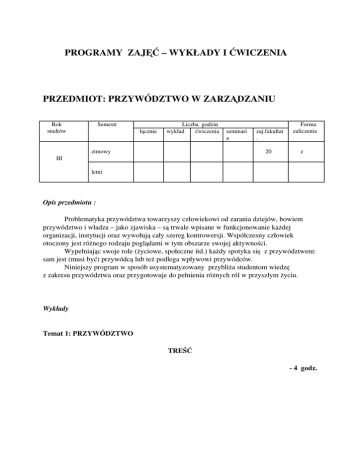 PROGRAMY ZAJĘĆ – WYKŁADY I ĆWICZENIA PRZEDMIOT: PRZYWÓDZTWO W ZARZĄDZANIU Rok studiów Semestr III zimowy Liczba godzin łącznie wykład ćwiczenia seminari a zaj.fakultat . 20 Forma zaliczenia z letni Opis przedmiotu : Problematyka przywództwa towarzyszy człowiekowi od zarania dziejów, bowiem przywództwo i władza – jako zjawiska – są trwale wpisane w funkcjonowanie każdej organizacji, instytucji oraz wywołują cały szereg kontrowersji. Współczesny człowiek otoczony jest różnego rodzaju poglądami w tym obszarze swojej aktywności. Wypełniając swoje role (życiowe, społeczne itd.) każdy spotyka się z przywództwem: sam jest (musi być) przywódcą lub też podlega wpływowi przywódców. Niniejszy program w sposób usystematyzowany przybliża studentom wiedzę z zakresu przywództwa oraz przygotowuje do pełnienia różnych ról w przyszłym życiu. Wykłady Temat 1: PRZYWÓDZTWO TREŚĆ  4 godz. Przegląd teorii przywództwa. Definicje przywództwa. Behawioralne podejście do przywództwa. Sytuacyjne podejście do przywództwa. Rodzaje i źródła władzy w organizacji. Autorytet formalny i nieformalny. Władza liniowa, władza funkcjonalna. Współczesne teorie przywództwa. Koncepcje cech przywódczych. Poszukiwanie cech przywódczych. Pięć cech przywódczych: nastawienie na współpracę, kreatywność, świadomość konieczności ciągłego uczenia się, działanie z wizją, przestrzeganie zasad. Charyzmatyczni dowódcy. Analiza życiorysów i sylwetek osobowych charyzmatycznych dowódców wojskowych w perspektywie historycznej. Analizy przypadków (case studies). Temat 2: MOTYWOWANIE PODWŁADNYCH TREŚĆ – 4 godz. Przegląd teorii motywowania. Definicja motywacji. Teoria popędów. Teoria potrzeb Maslowa. Teoria dwuczynnikowa Herzberga. Teoria ERG Alderfera. Współczesne poglądy na motywację. Motywowanie poprzez wynagrodzenia. Motywowanie pozapłacowe. Budowanie strategii zaangażowania. Czym jest zaangażowanie organizacyjne. Strategie zaangażowania. „Od kontroli do zaangażowania" R. E. Waltona. Japońska „szkoła doskonałości" Pascale'a i Athosa. Zaangażowanie i elastyczność. Wpływ silnego zaangażowania. Rozwijania poczucia „współwłasności". Temat 3: GRUPY, ZESPOŁY TREŚĆ – 4 godz. Uwarunkowania funkcjonowania zespołów. Zasady sprawnego działania zespołowego. Czynniki utrudniające i ułatwiające pracę zespołów. Budowanie zespołu. Rola i zadania lidera zespołu. Etapy tworzenia zespołu. Typy zachowań w zespole. Sposoby i metody budowania zespołu. Zasady delegowania uprawnień. Gry szkoleniowe: „Ja i mój ideał", „Konsensus", „przeciąganie niewidzialnej liny", „Rzeźba grupowa" i in.. Działania podnoszące skuteczność zespołów. Zespoły formalne i nieformalne. Rozwiązywanie konfliktów wewnątrz zespołów. Kształtowanie zwartości zespołu. Role przywódcze. Role i zadania członków zespołu. Temat 4: GOSPODAROWANIE CZASEM TREŚĆ – 4 godz. Metody i zasady planowania czasu. Czas jako kategoria ekonomiczna. Natura czasu. Korzyści z efektywnego zarządzania czasem. Niewłaściwe gospodarowanie czasem  „złodzieje czasu". Trening zarządzania czasem. Ćwiczenia przełączające uwagę. Planowanie zadań pod presją czasu. Trening gospodarowania czasem własnym. Trening rozwoju asertywności: „Dyplomatyczne „nie"; „Jest czy wydaje się"; „Konsensus". „Sabotaż". Temat 5: KULTURA ORGANIZACYJNA I JEJ DOSKONALENIE TREŚĆ – 2 godz. Kształtowanie kultury organizacji. Modele kultury E. Scheina. Artefakty kulturowe i ich podział. Artefakty behawioralne i kulturowe. Postawy i zachowania w organizacji. Modele kulturowe organizacji. Diagnozowanie kultury w organizacji. Stosowanie wybranych technik do diagnozowania kultury w organizacji (obchód instytucji, obserwacja narad i odpraw, analiza dokumentacji, wywiady itp.). Tworzenie wspólnoty kulturowej. Przejmowanie kontroli nad kulturą organizacyjną. Temat 6: DOBÓR I OCENIANIE PODWŁADNYCH TREŚĆ – 2 godz. Strategie rekrutacji i selekcji. Prezentacja wizerunku organizacji dla potrzeb rekrutacji. Rekrutacja wewnętrzna i zewnętrzna. Przegląd technik selekcji. Rozmowa kwalifikacyjna. Assessment Center. Techniki oceniania podwładnych. Cele i kryteria oceniania. Metody oceniania. Zasady i procedura oceniania. Formułowanie prognozy kadrowej. Błędy oceniania. Literatura: 1. Wykorzystana do opracowania programów zajęć: 1. 2. 3. 4. 5. 6. 7. 8. 9. 10. 11. 12. 13. 14. 15. 16. Armstrong M., Zarządzanie zasobami ludzkimi, Oficyna Ekonomiczna, Kraków 2002. Drucker P., Praktyka zarządzania, AE, Kraków 1994. Drucker P., Zarządzanie w XXI wieku, MUZA S.A., Warszawa 2000. Griffin R. W., Podstawy zarządzania organizacjami, PWN, Warszawa 1996. Hopej M., Struktury organizacyjne. Politechnika Wrocławska, Wrocław 2004. Metody i techniki organizatorskie, pod red. J. Skalika, Akademia Ekonomiczna, Wrocław 2001. Steinmann H. i Schreyógg G., Zarządzanie, Podstawy zarządzania przedsiębiorstwem, koncepcje, funkcje,, przykłady (wyd. 2), Politechnika Wrocławska, Wrocław 1998. Stoner J., Freeman E., Gilbert D., Kierowanie, PWE, Warszawa 1997. Lambert T., Problemy zarządzania. 50 praktycznych modeli rozwiązań. ABC, Warszawa 2000. Laszczak M., Patologie w organizacji. Profesjonalna Szkoła Biznesu, Kraków 1999. Łucewicz J., Organizacyjne zachowania człowieka. Akademia Ekonomiczna, Wrocław 1999 Potocki A. (red.). Zachowania organizacyjne Wybrane zagadnienia. DIFIN, Warszawa 2005. Robbins S.P, Zachowania w organizacji, PWE, Warszawa 1998. Robson M., Grupowe rozwiązywanie problemów, PWE, Warszawa 2005. Sikorski C., Zachowania ludzi w organizacji, PWN, Warszawa 2001. ZbiegieńMaciąg L., Kultura w organizacji. Identyfikacja kultury znanych firm, PWN, Warszawa 1999. 2. Wymagana od studentów: 1. Armstrong M., Zarządzanie zasobami ludzkimi, Oficyna Ekonomiczna, Kraków 2002 2. Griffin R. W., Podstawy zarządzania organizacjami, PWN,