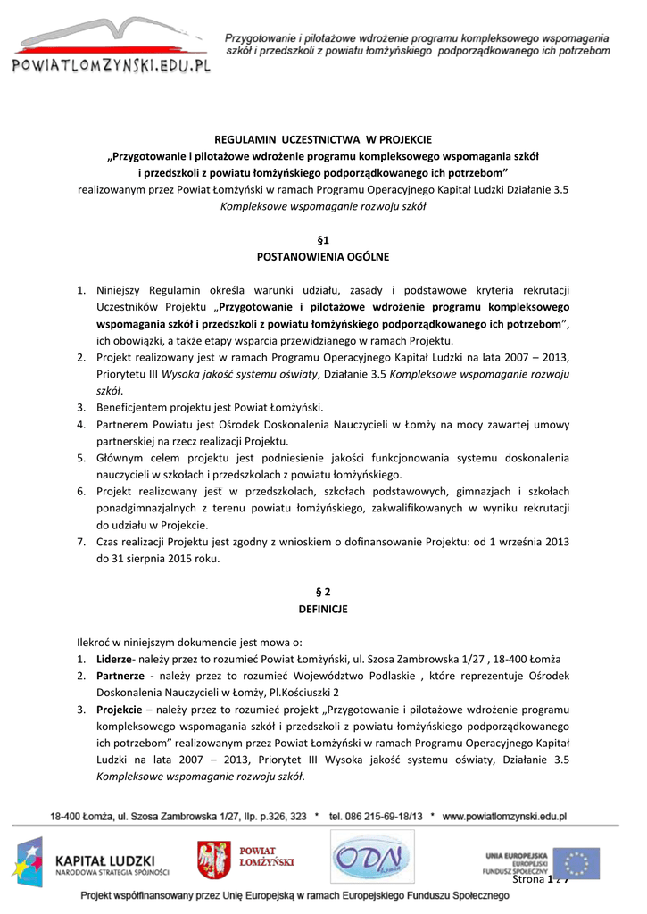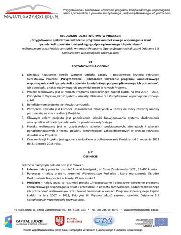 REGULAMIN UCZESTNICTWA W PROJEKCIE „Przygotowanie i pilotażowe wdrożenie programu kompleksowego wspomagania szkół i przedszkoli z powiatu łomżyńskiego podporządkowanego ich potrzebom” realizowanym przez Powiat Łomżyński w ramach Programu Operacyjnego Kapitał Ludzki Działanie 3.5 Kompleksowe wspomaganie rozwoju szkół §1 POSTANOWIENIA OGÓLNE 1. Niniejszy Regulamin określa warunki udziału, zasady i podstawowe kryteria rekrutacji Uczestników Projektu „Przygotowanie i pilotażowe wdrożenie programu kompleksowego wspomagania szkół i przedszkoli z powiatu łomżyńskiego podporządkowanego ich potrzebom”, ich obowiązki, a także etapy wsparcia przewidzianego w ramach Projektu. 2. Projekt realizowany jest w ramach Programu Operacyjnego Kapitał Ludzki na lata 2007 – 2013, Priorytetu III Wysoka jakość systemu oświaty, Działanie 3.5 Kompleksowe wspomaganie rozwoju szkół. 3. Beneficjentem projektu jest Powiat Łomżyński. 4. Partnerem Powiatu jest Ośrodek Doskonalenia Nauczycieli w Łomży na mocy zawartej umowy partnerskiej na rzecz realizacji Projektu. 5. Głównym celem projektu jest podniesienie jakości funkcjonowania systemu doskonalenia nauczycieli w szkołach i przedszkolach z powiatu łomżyńskiego. 6. Projekt realizowany jest w przedszkolach, szkołach podstawowych, gimnazjach i szkołach ponadgimnazjalnych z terenu powiatu łomżyńskiego, zakwalifikowanych w wyniku rekrutacji do udziału w Projekcie. 7. Czas realizacji Projektu jest zgodny z wnioskiem o dofinansowanie Projektu: od 1 września 2013 do 31 sierpnia 2015 roku. §2 DEFINICJE Ilekroć w niniejszym dokumencie jest mowa o: 1. Liderze- należy przez to rozumieć Powiat Łomżyński, ul. Szosa Zambrowska 1/27 , 18-400 Łomża 2. Partnerze - należy przez to rozumieć Województwo Podlaskie , które reprezentuje Ośrodek Doskonalenia Nauczycieli w Łomży, Pl.Kościuszki 2 3. Projekcie – należy przez to rozumieć projekt „Przygotowanie i pilotażowe wdrożenie programu kompleksowego wspomagania szkół i przedszkoli z powiatu łomżyńskiego podporządkowanego ich potrzebom” realizowanym przez Powiat Łomżyński w ramach Programu Operacyjnego Kapitał Ludzki na lata 2007 – 2013, Priorytet III Wysoka jakość systemu oświaty, Działanie 3.5 Kompleksowe wspomaganie rozwoju szkół. Strona 1 z 7 4. Uczestniku – należy przez to rozumieć: w przypadku uczestnika instytucjonalnego: szkołę/przedszkole, której przedstawiciel złożył dokumenty określone w §3 pkt. 4 i została/o zakwalifikowana/e do udziału w Projekcie. w przypadku uczestnika indywidualnego: dyrektora/-kę , nauczyciela / -kę, który/-a złożył/-a dokumenty określone w §3 pkt. 7 i został/a zakwalifikowany/a do udziału w Projekcie. 5. Komisji Rekrutacyjnej – należy przez to rozumieć zespół składający się z Koordynatorki Projektu, Asystentki Koordynatorki i Specjalistki ds. merytorycznych, weryfikujących dokumenty i zatwierdzających listy Uczestników poszczególnych rodzajów wsparcia; 6. Koordynatorce Projektu – należy przez to rozumieć przedstawiciela Lidera, któremu powierzone zostały obowiązki Koordynatorki Projektu; 7. Asystentce Koordynatorki – należy przez to rozumieć przedstawiciela Lidera, któremu powierzone zostały obowiązki Asystentki Koordynatorki; 8. Specjalistce ds. merytorycznych– należy przez to rozumieć Wykonawcę wyłonionego w przetargu nieograniczonym przez Partnera – Ośrodek Doskonalenia Nauczycieli w Łomży, któremu powierzone zostały obowiązki Specjalisty ds. merytorycznych; 9. Szkolnym organizatorze rozwoju edukacji (SORE) – należy przez to rozumieć specjalistę zewnętrznego (spoza szkoły/przedszkola) bezpośrednio współpracującego z placówką w realizacji rocznego planu wspomagania. Do jego zadań należą: pomoc w diagnozie potrzeb szkoły/przedszkola oraz dostosowaniu oferty doskonalenia do zdiagnozowanych potrzeb, a następnie pomoc w zbudowaniu RPW. W ramach realizacji RPW Szkolny organizator rozwoju edukacji organizuje szkolenia i konsultacje, pomaga nauczycielom wdrażać nowe umiejętności do praktyki szkolnej, przygotowuje sprawozdanie z realizacji RPW. SORE ma pod opieką 5 szkół/przedszkoli, z którymi utrzymuje ścisły kontakt w roku szkolnym 2013/2014 i kolejne 5 szkół/przedszkoli, z którymi utrzymuje ścisły kontakt w roku szkolnym 2014/2015. 10. Rocznym planie wspomagania (RPW) – należy przez to rozumieć plan realizowany w danej szkole lub w danym przedszkolu, a zbudowany na bazie jednej z ofert doskonalenia opracowanych w ramach projektu systemowego Ośrodka Rozwoju Edukacji „System doskonalenia nauczycieli oparty na ogólnodostępnym kompleksowym wspomaganiu szkół”. RPW obejmuje cały proces: od diagnozy potrzeb, poprzez planowanie i realizację konkretnych działań (np. warsztaty, szkolenia, konsultacje), pomoc nauczycielom we wprowadzaniu zmiany, aż po ewaluację podjętych działań. Współpracujący ze szkołą SORE pomaga w dostosowaniu schematycznie opisanej oferty doskonalenia do potrzeb konkretnej szkoły/ konkretnego przedszkola i wspiera placówkę w realizacji RPW. 11. Ofercie doskonalenia – należy przez to rozumieć opis rocznego procesu wspomagania rozwoju szkoły/przedszkola. Oferta doskonalenia jest podstawą do zbudowania w konkretnej szkole/przedszkolu szczegółowego rocznego planu wspomagania (wybranego obszaru pracy szkoły) opartego na wewnętrznej diagnozie potrzeb. Na ofertę doskonalenia składają się: tytuł (wskazanie obszaru wspomagania opisanego w ofercie), charakterystyka, cel, efekty, sposób realizacji oferty, zasady korzystania z oferty, czas i miejsce realizacji, grupy docelowe oraz informacje o osobach realizujących ofertę. W ramach Projektu szkoły/przedszkola będą mogły wybierać spośród 24 ofert. Współpracujący ze szkołą szkolny organizator rozwoju edukacji (SORE) pomaga w dostosowaniu schematycznie opisanej oferty do potrzeb konkretnej szkoły,