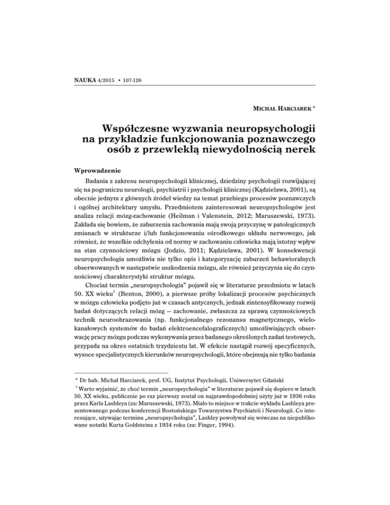 NAUKA 4/2015 • 107-126 MICHAŁ HARCIAREK * Współczesne wyzwania neuropsychologii na przykładzie funkcjonowania poznawczego osób z przewlekłą niewydolnością nerek Wprowadzenie Badania z zakresu neuropsychologii klinicznej, dziedziny psychologii rozwijającej się na pograniczu neurologii, psychiatrii i psychologii klinicznej (Kądzielawa, 2001), są obecnie jednym z głównych źródeł wiedzy na temat przebiegu procesów poznawczych i ogólnej architektury umysłu. Przedmiotem zainteresowań neuropsychologów jest analiza relacji mózg-zachowanie (Heilman i Valenstein, 2012; Maruszewski, 1973). Zakłada się bowiem, że zaburzenia zachowania mają swoją przyczynę w patologicznych zmianach w strukturze i/lub funkcjonowaniu ośrodkowego układu nerwowego, jak również, że wszelkie odchylenia od normy w zachowaniu człowieka mają istotny wpływ na stan czynnościowy mózgu (Jodzio, 2011; Kądzielawa, 2001). W konsekwencji neuropsychologia umożliwia nie tylko opis i kategoryzację zaburzeń behawioralnych obserwowanych w następstwie uszkodzenia mózgu, ale również przyczynia się do czynnościowej charakterystyki struktur mózgu. Chociaż termin „neuropsychologia” pojawił się w literaturze przedmiotu w latach 50. XX wieku1 (Benton, 2000), a pierwsze próby lokalizacji procesów psychicznych w mózgu człowieka podjęto już w czasach antycznych, jednak zintensyfikowany rozwój badań dotyczących relacji mózg — zachowanie, zwłaszcza za sprawą czynnościowych technik neuroobrazowania (np. funkcjonalnego rezonansu magnetycznego, wielokanałowych systemów do badań elektroencefalograficznych) umożliwiających obserwację pracy mózgu podczas wykonywania przez badanego określonych zadań testowych, przypada na okres ostatnich trzydziestu lat. W efekcie nastąpił rozwój specyficznych, wysoce specjalistycznych kierunków neuropsychologii, które obejmują nie tylko badania * Dr hab. Michał Harciarek, prof. UG, Instytut Psychologii, Uniwersytet Gdański 1 Warto wyjaśnić, że choć termin „neuropsychologia” w literaturze pojawił się dopiero w latach 50. XX wieku, publicznie po raz pierwszy został on najprawdopodobniej użyty już w 1936 roku przez Karla Lashleya (za: Maruszewski, 1973). Miało to miejsce w trakcie wykładu Lashleya prezentowanego podczas konferencji Bostońskiego Towarzystwa Psychiatrii i Neurologii. Co interesujące, używając terminu „neuropsychologia”, Lashley powoływał się wówczas na niepublikowane notatki Kurta Goldsteina z 1934 roku (za: Finger, 1994). 108 M. Harciarek osób, u których doszło do bezpośredniego uszkodzenia mózgu, ale także badania chorych somatycznie oraz próby eksperymentalne z udziałem osób zdrowych. Obecnie neuropsychologię można podzielić na neuropsychologię dziecka (neuropsychologię rozwojową) oraz neuropsychologię człowieka dorosłego. Oba te kierunki obejmują zarówno nurt kliniczny, jak i eksperymentalny (Kądzielawa, 2001). Ponadto, różnorodne zainteresowania naukowe badaczy sprawiły, że w ramach szeroko pojętej neuropsychologii ukształtowało się wiele kierunków poszukiwań empirycznych, których egzemplifikacją jest np. neuropsychologia poznawcza (ang. cognitive neuropsychology), neuropsychologia środowiskowa (ang. ecological neuropsychology), neurolingwistyka (ang. neurolinguistics) czy neurosemiotyka (ang. neurosemiotics) (Herzyk, 2005; Kądzielawa, 2001). Rozwój medycyny, analiza nowych danych klinicznych i ciągłe udoskonalanie metod badawczych pokazały, że funkcjonowanie mózgu i związany z nim stan psychiki człowieka w istotnym stopniu zależą od funkcjonowania całego organizmu, w szczególności od pracy takich narządów, jak: serce, wątroba, tarczyca, trzustka czy nerki (Armstrong i Morrow, 2014; Tarter i in., 2001). Obserwacje te przyczyniły się do wyodrębnienia neuropsychologii medycznej, zajmującej się poznawaniem mechanizmów zaburzeń zachowania wywołanych przez patologiczne funkcjonowanie mózgu w następstwie nieprawidłowej pracy oraz metod leczenia patologii organów i/lub układów czynnościowych organizmu, poza układem nerwowym (Kądzielawa, 2001; Tarter, Butters i Beers, 2001; zob. też Armstrong i Morrow, 2014; Jodzio i Nyka, 2008). Neuropsychologia medyczna definiuje mózg jako „ogniwo pośredniczące”, ponieważ jego praca zależy od prawidłowego funkcjonowania organów/układów poza ośrodkowym układem nerwowym i może zostać zaburzona na skutek nieprawidłowego ich działania. Spowodowane w ten sposób uszkodzenie lub dysfunkcja mózgu prowadzą do rozwoju objawów neuropsychologicznych, będących przedmiotem diagnozy i terapii. Obecnie badania z zakresu neuropsychologii medycznej przeżywają swój największy jak do tej pory rozkwit. Poza najczęściej analizowaną oceną wpływu choroby sercowonaczyniowej na pracę mózgu człowieka (np. Selnes, Gottesman, Grega, Baumgartner, Zeger i McKhann, 2012), neuropsychologia medyczna zajmuje się także badaniem dysfunkcji poznawczych spowodowanych zaburzeniami pracy układu odpornościowego (np. w wyniku zakażenia wirusem HIV i AIDS; Łojek, 2001), cukrzycą (Brands i in., 2006), nieprawidłowym funkcjonowaniem tarczycy i trzustki (zob. Biechowska, 2008), wątroby (Peixoto, Lopez i Ariaz, 2006) i innych organów (zob. Armstrong i Morrow, 2014; Tarter i in., 2001). Przedmiotem zainteresowań neuropsychologii medycznej są także następstwa chorób lub uszkodzeń narządów wewnętrznych, spowodowanych zatruciem przemysłowym (np. tlenkiem węgla) (por. Filley, 2012). We wszystkich tych przypadkach u wielu pacjentów dochodzi do wtórnego uszkodzenia mózgu, czego wynikiem stają się wybiórcze lub uogólnione objawy neuropsychologiczne. Współczesne wyzwania neuropsychologii 109 Przedmiotem intensywnych badań neuropsychologii medycznej jest także analiza wpływu zaburzeń pracy układu wydalniczego oraz zatruć organizmu produktami przemiany materii na funkcjonowanie uk