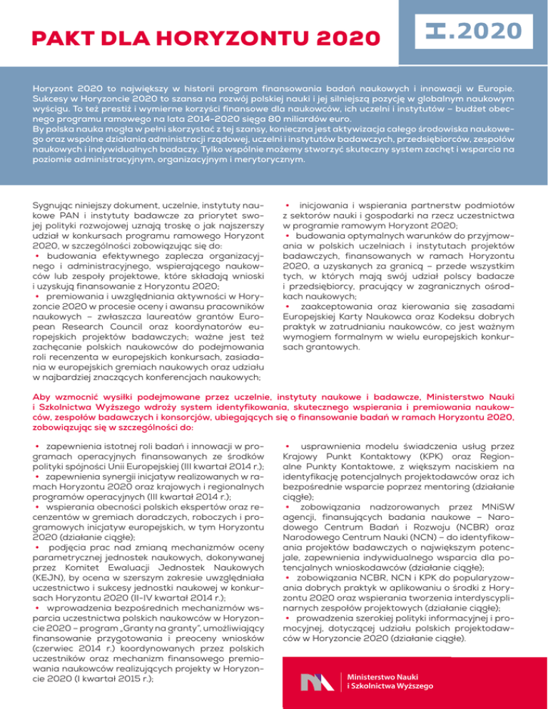 PAKT DLA HORYZONTU 2020 Horyzont 2020 to największy w historii program finansowania badań naukowych i innowacji w Europie. Sukcesy w Horyzoncie 2020 to szansa na rozwój polskiej nauki i jej silniejszą pozycję w globalnym naukowym wyścigu. To też prestiż i wymierne korzyści finansowe dla naukowców, ich uczelni i instytutów – budżet obecnego programu ramowego na lata 2014-2020 sięga 80 miliardów euro. By polska nauka mogła w pełni skorzystać z tej szansy, konieczna jest aktywizacja całego środowiska naukowego oraz wspólne działania administracji rządowej, uczelni i instytutów badawczych, przedsiębiorców, zespołów naukowych i indywidualnych badaczy. Tylko wspólnie możemy stworzyć skuteczny system zachęt i wsparcia na poziomie administracyjnym, organizacyjnym i merytorycznym. Sygnując niniejszy dokument, uczelnie, instytuty naukowe PAN i instytuty badawcze za priorytet swojej polityki rozwojowej uznają troskę o jak najszerszy udział w konkursach programu ramowego Horyzont 2020, w szczególności zobowiązując się do: • budowania efektywnego zaplecza organizacyjnego i administracyjnego, wspierającego naukowców lub zespoły projektowe, które składają wnioski i uzyskują finansowanie z Horyzontu 2020; • premiowania i uwzględniania aktywności w Horyzoncie 2020 w procesie oceny i awansu pracowników naukowych – zwłaszcza laureatów grantów European Research Council oraz koordynatorów europejskich projektów badawczych; ważne jest też zachęcanie polskich naukowców do podejmowania roli recenzenta w europejskich konkursach, zasiadania w europejskich gremiach naukowych oraz udziału w najbardziej znaczących konferencjach naukowych; • inicjowania i wspierania partnerstw podmiotów z sektorów nauki i gospodarki na rzecz uczestnictwa w programie ramowym Horyzont 2020; • budowania optymalnych warunków do przyjmowania w polskich uczelniach i instytutach projektów badawczych, finansowanych w ramach Horyzontu 2020, a uzyskanych za granicą – przede wszystkim tych, w których mają swój udział polscy badacze i przedsiębiorcy, pracujący w zagranicznych ośrodkach naukowych; • zaakceptowania oraz kierowania się zasadami Europejskiej Karty Naukowca oraz Kodeksu dobrych praktyk w zatrudnianiu naukowców, co jest ważnym wymogiem formalnym w wielu europejskich konkursach grantowych. Aby wzmocnić wysiłki podejmowane przez uczelnie, instytuty naukowe i badawcze, Ministerstwo Nauki i Szkolnictwa Wyższego wdroży system identyfikowania, skutecznego wspierania i premiowania naukowców, zespołów badawczych i konsorcjów, ubiegających się o finansowanie badań w ramach Horyzontu 2020, zobowiązując się w szczególności do: • zapewnienia istotnej roli badań i innowacji w programach operacyjnych finansowanych ze środków polityki spójności Unii Europejskiej (III kwartał 2014 r.); • zapewnienia synergii inicjatyw realizowanych w ramach Horyzontu 2020 oraz krajowych i regionalnych programów operacyjnych (III kwartał 2014 r.); • wspierania obecności polskich ekspertów oraz recenzentów w gremiach doradczych, roboczych i programowych inicjatyw europejskich, w tym Horyzontu 2020 (działanie ciągłe); • podjęcia prac nad zmianą mechanizmów oceny parametrycznej jednostek naukowych, dokonywanej przez Komitet Ewaluacji Jednostek Naukowych (KEJN), by ocena w szerszym zakresie uwzględniała uczestnictwo i sukcesy jednostki naukowej w konkursach Horyzontu 2020 (II-IV kwartał 2014 r.); • wprowadzenia bezpośrednich mechanizmów wsparcia uczestnictwa polskich naukowców w Horyzoncie 2020 – program „Granty na granty”, umożliwiający finansowanie przygotowania i preoceny wniosków (czerwiec 2014 r.) koordynowanych przez polskich uczestników oraz mechanizm finansowego premiowania naukowców realizujących projekty w Horyzoncie 2020 (I kwartał 2015 r.); • usprawnienia modelu świadczenia usług przez Krajowy Punkt Kontaktowy (KPK) oraz Regionalne Punkty Kontaktowe, z większym naciskiem na identyfikację potencjalnych projektodawców oraz ich bezpośrednie wsparcie poprzez mentoring (działanie ciągłe); • zobowiązania nadzorowanych przez MNiSW agencji, finansujących badania naukowe – Narodowego Centrum Badań i Rozwoju (NCBR) oraz Narodowego Centrum Nauki (NCN) – do identyfikowania projektów badawczych o największym potencjale, zapewnienia indywidualnego wsparcia dla potencjalnych wnioskodawców (działanie ciągłe); • zobowiązania NCBR, NCN i KPK do popularyzowania dobrych praktyk w aplikowaniu o środki z Horyzontu 2020 oraz wspierania tworzenia interdyscyplinarnych zespołów projektowych (działanie ciągłe); • prowadzenia szerokiej polityki informacyjnej i promocyjnej, dotyczącej udziału polskich projektodawców w Horyzoncie 2020 (działanie ciągłe).