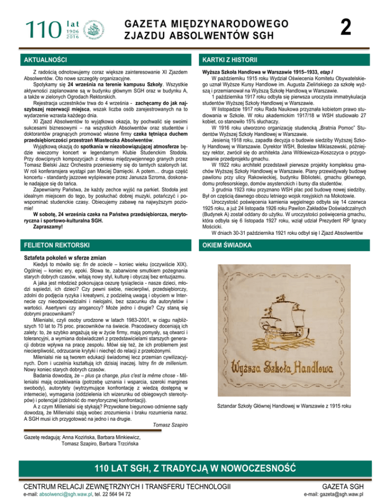 GAZETA MIĘDZYNARODOWEGO ZJAZDU ABSOLWENTÓW SGH 2 AKTUALNOŚCI KARTKI Z HISTORII Z radością odnotowujemy coraz większe zainteresowanie XI Zjazdem Absolwentów. Oto nowe szczegóły organizacyjne. Spotykamy się 24 września na terenie kampusu Szkoły. Wszystkie aktywności zaplanowane są w budynku głównym SGH oraz w budynku A, a także w zielonych Ogrodach Rektorskich. Rejestracja uczestników trwa do 4 września - zachęcamy do jak najszybszej rezerwacji miejsca, wszak liczba osób zarejestrowanych na to wydarzenie wzrasta każdego dnia. XI Zjazd Absolwentów to wyjątkowa okazja, by pochwalić się swoimi sukcesami biznesowymi – na wszystkich Absolwentów oraz studentów i doktorantów pragnących promować własne firmy czeka tętniąca duchem przedsiębiorczości przestrzeń Miasteczka Absolwentów. Wyjątkową okazją do spotkania w niezobowiązującej atmosferze będzie wieczorny koncert w legendarnym Klubie Studenckim Stodoła. Przy dowcipnych kompozycjach z okresu międzywojennego granych przez Tomasz Bielski Jazz Orchestra przeniesiemy się do tamtych szalonych lat. W roli konferansjera wystąpi pan Maciej Damięcki. A potem… druga część koncertu - standardy jazzowe wyśpiewane przez Janusza Szroma, doskonale nadające się do tańca. Zapewniamy Państwa, że każdy zechce wyjść na parkiet. Stodoła jest idealnym miejscem do tego, by posłuchać dobrej muzyki, potańczyć i powspominać studenckie czasy. Obiecujemy zabawę na najwyższym poziomie! W sobotę, 24 września czeka na Państwa przedsiębiorcza, merytoryczna i sportowo-kulturalna SGH. Zapraszamy! Wyższa Szkoła Handlowa w Warszawie 1915–1933, etap I W październiku 1915 roku Wydział Oświecenia Komitetu Obywatelskiego uznał Wyższe Kursy Handlowe im. Augusta Zielińskiego za szkołę wyższą i przemianował na Wyższą Szkołę Handlową w Warszawie. 1 października 1917 roku odbyła się pierwsza uroczysta immatrykulacja studentów Wyższej Szkoły Handlowej w Warszawie. W listopadzie 1917 roku Rada Naukowa przyznała kobietom prawo studiowania w Szkole. W roku akademickim 1917/18 w WSH studiowało 27 kobiet, co stanowiło 15% słuchaczy. W 1916 roku utworzono organizację studencką „Bratnia Pomoc” Studentów Wyższej Szkoły Handlowej w Warszawie. Jesienią 1918 roku, zapadła decyzja o budowie siedziby Wyższej Szkoły Handlowej w Warszawie. Dyrektor WSH, Bolesław Miklaszewski, późniejszy rektor, zwrócił się do architekta Jana Witkiewicza-Koszczyca o przygotowanie przedprojektu gmachu. W 1922 roku architekt przedstawił pierwsze projekty kompleksu gmachów Wyższej Szkoły Handlowej w Warszawie. Plany przewidywały budowę pawilonu przy ulicy Rakowieckiej, budynku Biblioteki, gmachu głównego, domu profesorskiego, domów asystenckich i bursy dla studentów. 3 grudnia 1923 roku przyznano WSH plac pod budowę nowej siedziby. Był on częścią dawnego obozu letniego wojsk rosyjskich na Mokotowie. Uroczystość poświęcenia kamienia węgielnego odbyła się 14 czerwca 1925 roku, a już 24 listopada 1926 roku Pawilon Zakładów Doświadczalnych (Budynek A) został oddany do użytku. W uroczystości poświęcenia gmachu, która odbyła się 6 listopada 1927 roku, wziął udział Prezydent RP Ignacy Mościcki. W dniach 30-31 października 1921 roku odbył się I Zjazd Absolwentów FELIETON REKTORSKI OKIEM ŚWIADKA Sztafeta pokoleń w sferze zmian Kiedyś to mówiło się: fin de sciecle – koniec wieku (oczywiście XIX). Ogólniej – koniec ery, epoki. Słowa te, zabarwione smutkiem pożegnania starych dobrych czasów, witają nowy styl, kulturę i obyczaj bez entuzjazmu. A jaka jest młodzież pokonująca cezurę tysiąclecia - nasze dzieci, młodzi sąsiedzi, ich dzieci? Czy pewni siebie, niecierpliwi, przedsiębiorczy, zdolni do podjęcia ryzyka i kreatywni, z podzielną uwagą i obyciem w Internecie czy nieodpowiedzialni i nielojalni, bez szacunku dla autorytetów i wartości. Asertywni czy aroganccy? Może jedno i drugie? Czy staną się dobrymi pracownikami? Milenialsi, czyli osoby urodzone w latach 1983-2001, w ciągu najbliższych 10 lat to 75 proc. pracowników na świecie. Pracodawcy doceniają ich zalety: to, że szybko angażują się w życie firmy, mają pomysły, są otwarci i tolerancyjni, a wymiana doświadczeń z przedstawicielami starszych generacji dobrze wpływa na pracę zespołu. Mówi się też, że ich problemem jest niecierpliwość, odrzucanie krytyki i niechęć do relacji z przełożonymi. Milenialsi nie są tworem edukacji świadomej lecz przemian cywilizacyjnych. Dom i uczelnia kształtują ich dzisiaj inaczej. Istny fin de millenium. Nowy koniec starych dobrych czasów. Badania dowodzą, że – plus ça change, plus c'est la même chose - Millenialsi mają oczekiwania (potrzebę uznania i wsparcia, szeroki margines swobody), autorytety (wytrzymujące konfrontację z wiedzą dostępną w internecie), wymagania (oddzielenia ich wizerunku od obiegowych stereotypów) i potencjał (zdolność do merytorycznej konfrontacji). A z czym Millenialsi się stykają? Przywołane biegunowo odmienne sądy dowodzą, że Millenialsi stają wobec zrozumienia i braku rozumienia naraz. A SGH musi ich przygotować na jedno i na drugie. Tomasz Szapiro Sztandar Szkoły Głównej Handlowej w Warszawie z 1915 roku Gazetę redagują: Anna Kozińska, Barbara Minkiewicz, Tomasz Szapiro, Barbara Trzcińska 110 LAT SGH, Z TRADYCJĄ W NOWOCZESNOŚĆ CENTRUM RELACJI ZEWNĘTRZNYCH I TRANSFERU TECHNOLOGII e-mail: [email protected], tel. 22 564 94 72 GAZETA SGH e-mail: [email protected]