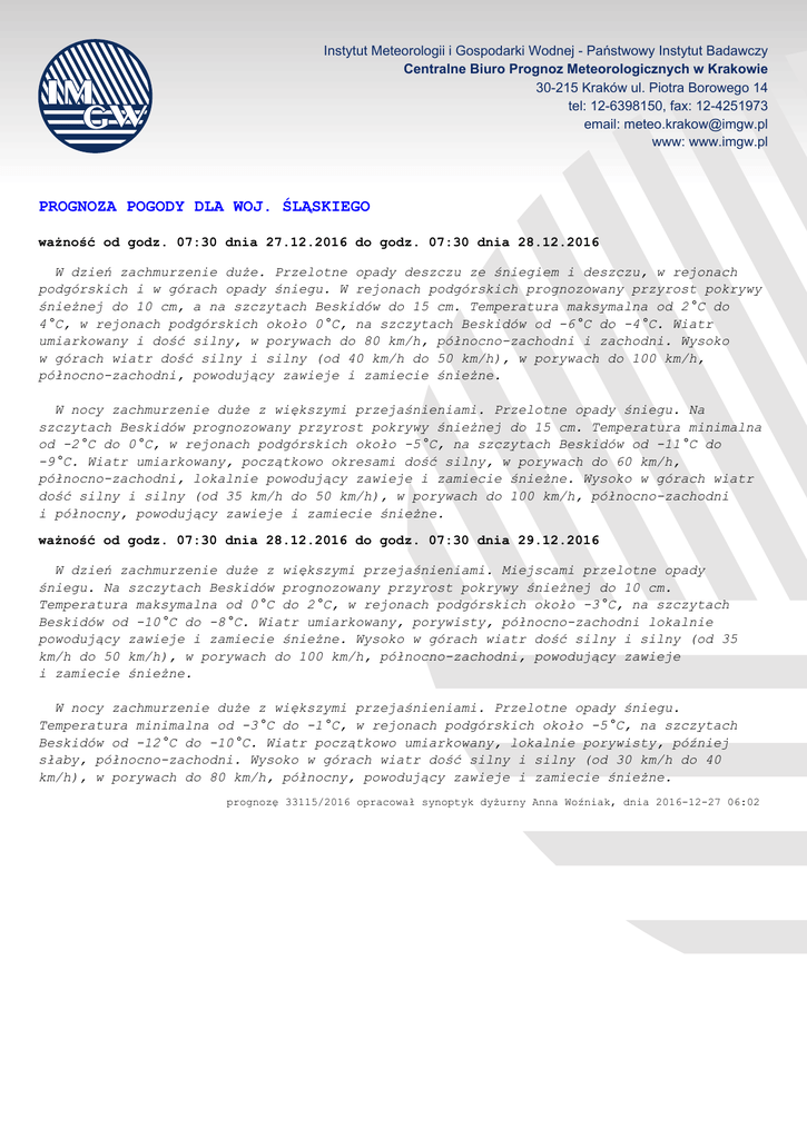 Instytut Meteorologii i Gospodarki Wodnej - Państwowy Instytut Badawczy Centralne Biuro Prognoz Meteorologicznych w Krakowie 30-215 Kraków ul. Piotra Borowego 14 tel: 12-6398150, fax: 12-4251973 email: [email protected] www: www.imgw.pl PROGNOZA POGODY DLA WOJ. ŚLĄSKIEGO ważność od godz. 07:30 dnia 27.12.2016 do godz. 07:30 dnia 28.12.2016 W dzień zachmurzenie duże. Przelotne opady deszczu ze śniegiem i deszczu, w rejonach podgórskich i w górach opady śniegu. W rejonach podgórskich prognozowany przyrost pokrywy śnieżnej do 10 cm, a na szczytach Beskidów do 15 cm. Temperatura maksymalna od 2°C do 4°C, w rejonach podgórskich około 0°C, na szczytach Beskidów od -6°C do -4°C. Wiatr umiarkowany i dość silny, w porywach do 80 km/h, północno-zachodni i zachodni. Wysoko w górach wiatr dość silny i silny (od 40 km/h do 50 km/h), w porywach do 100 km/h, północno-zachodni, powodujący zawieje i zamiecie śnieżne. W nocy zachmurzenie duże z większymi przejaśnieniami. Przelotne opady śniegu. Na szczytach Beskidów prognozowany przyrost pokrywy śnieżnej do 15 cm. Temperatura minimalna od -2°C do 0°C, w rejonach podgórskich około -5°C, na szczytach Beskidów od -11°C do -9°C. Wiatr umiarkowany, początkowo okresami dość silny, w porywach do 60 km/h, północno-zachodni, lokalnie powodujący zawieje i zamiecie śnieżne. Wysoko w górach wiatr dość silny i silny (od 35 km/h do 50 km/h), w porywach do 100 km/h, północno-zachodni i północny, powodujący zawieje i zamiecie śnieżne. ważność od godz. 07:30 dnia 28.12.2016 do godz. 07:30 dnia 29.12.2016 W dzień zachmurzenie duże z większymi przejaśnieniami. Miejscami przelotne opady śniegu. Na szczytach Beskidów prognozowany przyrost pokrywy śnieżnej do 10 cm. Temperatura maksymalna od 0°C do 2°C, w rejonach podgórskich około -3°C, na szczytach Beskidów od -10°C do -8°C. Wiatr umiarkowany, porywisty, północno-zachodni lokalnie powodujący zawieje i zamiecie śnieżne. Wysoko w górach wiatr dość silny i silny (od 35 km/h do 50 km/h), w porywach do 100 km/h, północno-zachodni, powodujący zawieje i zamiecie śnieżne. W nocy zachmurzenie duże z większymi przejaśnieniami. Przelotne opady śniegu. Temperatura minimalna od -3°C do -1°C, w rejonach podgórskich około -5°C, na szczytach Beskidów od -12°C do -10°C. Wiatr początkowo umiarkowany, lokalnie porywisty, później słaby, północno-zachodni. Wysoko w górach wiatr dość silny i silny (od 30 km/h do 40 km/h), w porywach do 80 km/h, północny, powodujący zawieje i zamiecie śnieżne. prognozę 33115/2016 opracował synoptyk dyżurny Anna Woźniak, dnia 2016-12-27 06:02