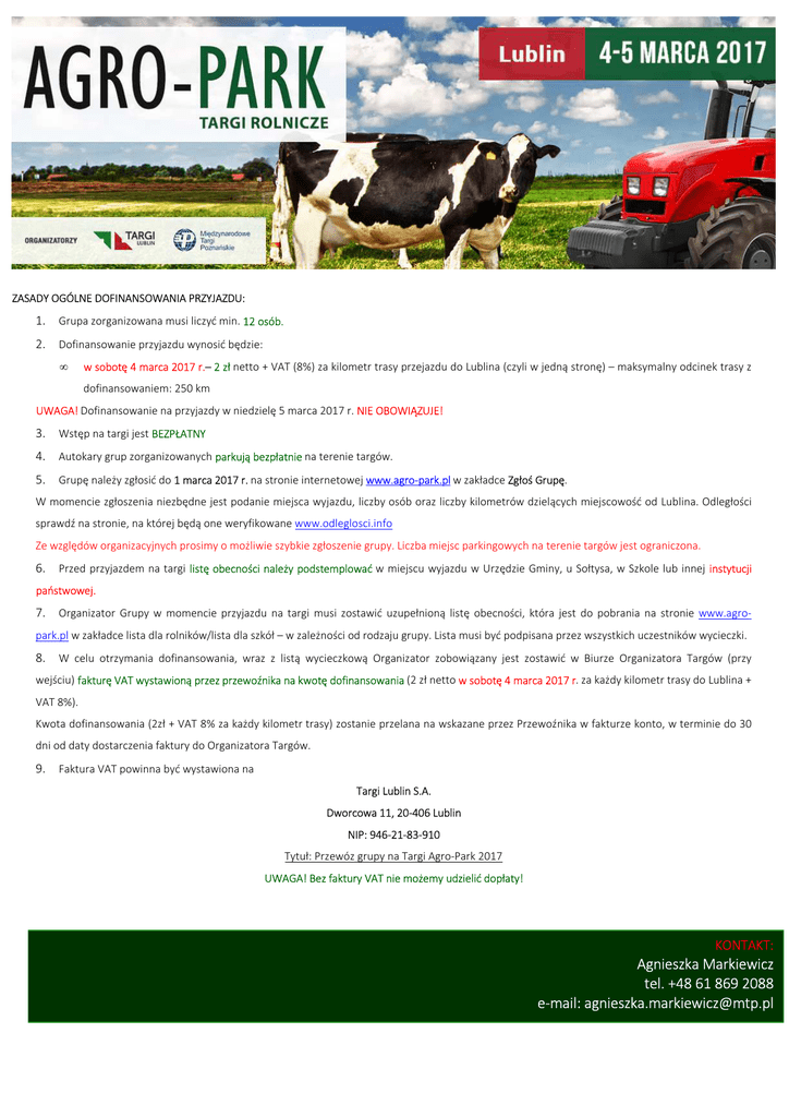 ZASADY OGÓLNE DOFINANSOWANIA PRZYJAZDU: 1. Grupa zorganizowana musi liczyć min. 12 osób. 2. Dofinansowanie przyjazdu wynosić będzie: • w sobotę 4 marca 2017 r.– 2 zł netto + VAT (8%) za kilometr trasy przejazdu do Lublina (czyli w jedną stronę) – maksymalny odcinek trasy z dofinansowaniem: 250 km UWAGA! Dofinansowanie na przyjazdy w niedzielę 5 marca 2017 r. NIE OBOWIĄZUJE! 3. Wstęp na targi jest BEZPŁATNY 4. Autokary grup zorganizowanych parkują bezpłatnie na terenie targów. 5. Grupę należy zgłosić do 1 marca 2017 r. na stronie internetowej www.agro-park.pl w zakładce Zgłoś Grupę. W momencie zgłoszenia niezbędne jest podanie miejsca wyjazdu, liczby osób oraz liczby kilometrów dzielących miejscowość od Lublina. Odległości sprawdź na stronie, na której będą one weryfikowane www.odleglosci.info Ze względów organizacyjnych prosimy o możliwie szybkie zgłoszenie grupy. Liczba miejsc parkingowych na terenie targów jest ograniczona. 6. Przed przyjazdem na targi listę obecności należy podstemplować w miejscu wyjazdu w Urzędzie Gminy, u Sołtysa, w Szkole lub innej instytucji państwowej. 7. Organizator Grupy w momencie przyjazdu na targi musi zostawić uzupełnioną listę obecności, która jest do pobrania na stronie www.agropark.pl w zakładce lista dla rolników/lista dla szkół – w zależności od rodzaju grupy. Lista musi być podpisana przez wszystkich uczestników wycieczki. 8. W celu otrzymania dofinansowania, wraz z listą wycieczkową Organizator zobowiązany jest zostawić w Biurze Organizatora Targów (przy wejściu) fakturę VAT wystawioną przez przewoźnika na kwotę dofinansowania (2 zł netto w sobotę 4 marca 2017 r. za każdy kilometr trasy do Lublina + VAT 8%). Kwota dofinansowania (2zł + VAT 8% za każdy kilometr trasy) zostanie przelana na wskazane przez Przewoźnika w fakturze konto, w terminie do 30 dni od daty dostarczenia faktury do Organizatora Targów. 9. Faktura VAT powinna być wystawiona na Targi Lublin S.A. Dworcowa 11, 20-406 Lublin NIP: 946-21-83-910 Tytuł: Przewóz grupy na Targi Agro-Park 2017 UWAGA! Bez faktury VAT nie możemy udzielić dopłaty! Факс: +(48 61) 869 29 99 KONTAKT: Agnieszka Markiewicz tel. +48 61 869 2088 e-mail: [email protected]