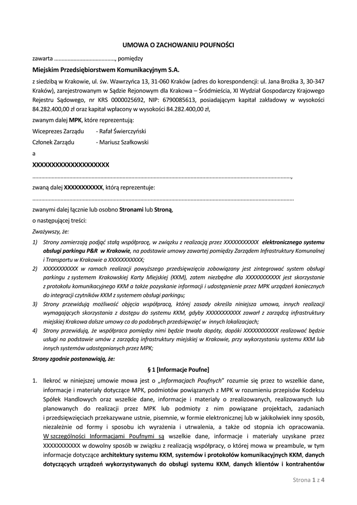 UMOWA O ZACHOWANIU POUFNOŚCI zawarta ………………………………….., pomiędzy Miejskim Przedsiębiorstwem Komunikacyjnym S.A. z siedzibą w Krakowie, ul. św. Wawrzyńca 13, 31-060 Kraków (adres do korespondencji: ul. Jana Brożka 3, 30-347 Kraków), zarejestrowanym w Sądzie Rejonowym dla Krakowa – Śródmieścia, XI Wydział Gospodarczy Krajowego Rejestru Sądowego, nr KRS 0000025692, NIP: 6790085613, posiadającym kapitał zakładowy w wysokości 84.282.400,00 zł oraz kapitał wpłacony w wysokości 84.282.400,00 zł, zwanym dalej MPK, które reprezentują: Wiceprezes Zarządu - Rafał Świerczyński Członek Zarządu - Mariusz Szałkowski a XXXXXXXXXXXXXXXXXXXX …………………………………………………………………………………………………………………………………………………………., zwaną dalej XXXXXXXXXXX, którą reprezentuje: …………………………………………………………………………………………………………………………………………………………… zwanymi dalej łącznie lub osobno Stronami lub Stroną, o następującej treści: Zważywszy, że: 1) Strony zamierzają podjąć stałą współpracę, w związku z realizacją przez XXXXXXXXXXX elektronicznego systemu obsługi parkingu P&R w Krakowie, na podstawie umowy zawartej pomiędzy Zarządem Infrastruktury Komunalnej i Transportu w Krakowie a XXXXXXXXXXX; 2) XXXXXXXXXXX w ramach realizacji powyższego przedsięwzięcia zobowiązany jest zintegrować system obsługi parkingu z systemem Krakowskiej Karty Miejskiej (KKM), zatem niezbędne dla XXXXXXXXXXX jest skorzystanie z protokołu komunikacyjnego KKM a także pozyskanie informacji i udostępnienie przez MPK urządzeń koniecznych do integracji czytników KKM z systemem obsługi parkingu; 3) Strony przewidują możliwość objęcia współpracą, której zasady określa niniejsza umowa, innych realizacji wymagających skorzystania z dostępu do systemu KKM, gdyby XXXXXXXXXXX zawarł z zarządcą infrastruktury miejskiej Krakowa dalsze umowy co do podobnych przedsięwzięć w innych lokalizacjach; 4) Strony przewidują, że współpraca pomiędzy nimi będzie trwała dopóty, dopóki XXXXXXXXXXX realizować będzie usługi na podstawie umów z zarządcą infrastruktury miejskiej w Krakowie, przy wykorzystaniu systemu KKM lub innych systemów udostępnianych przez MPK; Strony zgodnie postanawiają, że: § 1 [Informacje Poufne] 1. Ilekroć w niniejszej umowie mowa jest o „Informacjach Poufnych” rozumie się przez to wszelkie dane, informacje i materiały dotyczące MPK, podmiotów powiązanych z MPK w rozumieniu przepisów Kodeksu Spółek Handlowych oraz wszelkie dane, informacje i materiały o zrealizowanych, realizowanych lub planowanych do realizacji przez MPK lub podmioty z nim powiązane projektach, zadaniach i przedsięwzięciach przekazywane ustnie, pisemnie, w formie elektronicznej lub w jakikolwiek inny sposób, niezależnie od formy i sposobu ich wyrażenia i utrwalenia, a także od stopnia ich opracowania. W szczególności Informacjami Poufnymi są wszelkie dane, informacje i materiały uzyskane przez XXXXXXXXXXX w dowolny sposób w związku z realizacją współpracy, o której mowa w preambule, w tym informacje dotyczące architektury systemu KKM, systemów i protokołów komunikacyjnych KKM, danych dotyczących urządzeń wykorzystywanych do obsługi systemu KKM, danych klientów i kontrahentów Strona 1 z 4 Nr RI130006 MPK związanych z systemem KKM a także wszelkie inne informacje i materiały dotyczące tego systemu oraz systemów integralnie z nim powiązanych lub innych systemów udostępnianych przez MPK. 2. Jednakże Informacjami Poufnymi nie są: a. informacje powszechnie znane, b. informacje rozpowszechnione za zgodą lub wiedzą MPK za pośrednictwem środków masowego przekazu (prasa, radio, telewizja) oraz w sieci Internet, c. informacje powszechnie dostępne na zasadach jawności w urzędowych rejestrach, d. informacje podane do publicznej wiadomości w inny sposób niż w wyniku naruszenia postanowień niniejszej umowy. 3. W razie jakichkolwiek wątpliwości w przedmiocie kwalifikacji dowolnych danych, informacji lub materiałów na potrzeby wykonywania niniejszej umowy przyjmuje się, że są to Informacje Poufne, chyba że MPK w sposób wyraźny i wyłącznie na piśmie, oświadczy inaczej. § 2 [Postępowanie z Informacjami Poufnymi] 1. Z zastrzeżeniem postanowień ust. 4, 5 i 6 XXXXXXXXXXX zobowiązana jest do zachowania w tajemnicy i nie ujawniania Informacji Poufnych osobom trzecim, w jakimkolwiek zakresie oraz w jakiejkolwiek formie, w tym także w sposób dorozumiany oraz podejmie wszelkie niezbędne działania w celu uniemożliwienia osobom trzecim jakiegokolwiek dostępu do Informacji Poufnych. 2. XXXXXXXXXXX zobowiązana jest do zachowania w tajemnicy i nie ujawniania Informacji Poufnych, a także uniemożliwienia osobom trzecim jakiegokolwiek dostępu do Informacji Poufnych w jednakowym stopniu, niezależnie od tego, czy uzyskała Informacje Poufne bezpośrednio od MPK, podmiotów powiązanych z MPK lub współpracujących, za pośrednictwem osób trzecich, czy też samodzielnie, w związku z realizacją współpracy, o której mowa w preambule. 3. XXXXXXXXXXX, poza przypadkami uzasadnionymi względami technicznymi wynikającymi z realizacji współpracy, o której mowa w preambule, nie będzie sporządzać kopii ani w inny sposób powielać posiadanych Informacji Poufnych. 4. W przypadku, gdy obowiązek przekazania jakichkolwiek Informacji Poufnych określonemu organowi Rzeczpospolitej Polskiej wynika z obowiązujących przepisów prawa, przed przekazaniem takich Informacji Poufnych XXXXXXXXXXX niezwłocznie poinformuje o tym fakcie MPK wskazując organ, podstawę prawną oraz zakres informacji, a jeżeli przekazanie takich informacji ma nastąpić na wyraźne żądanie organu - wraz z odpisem dokumentu stwie