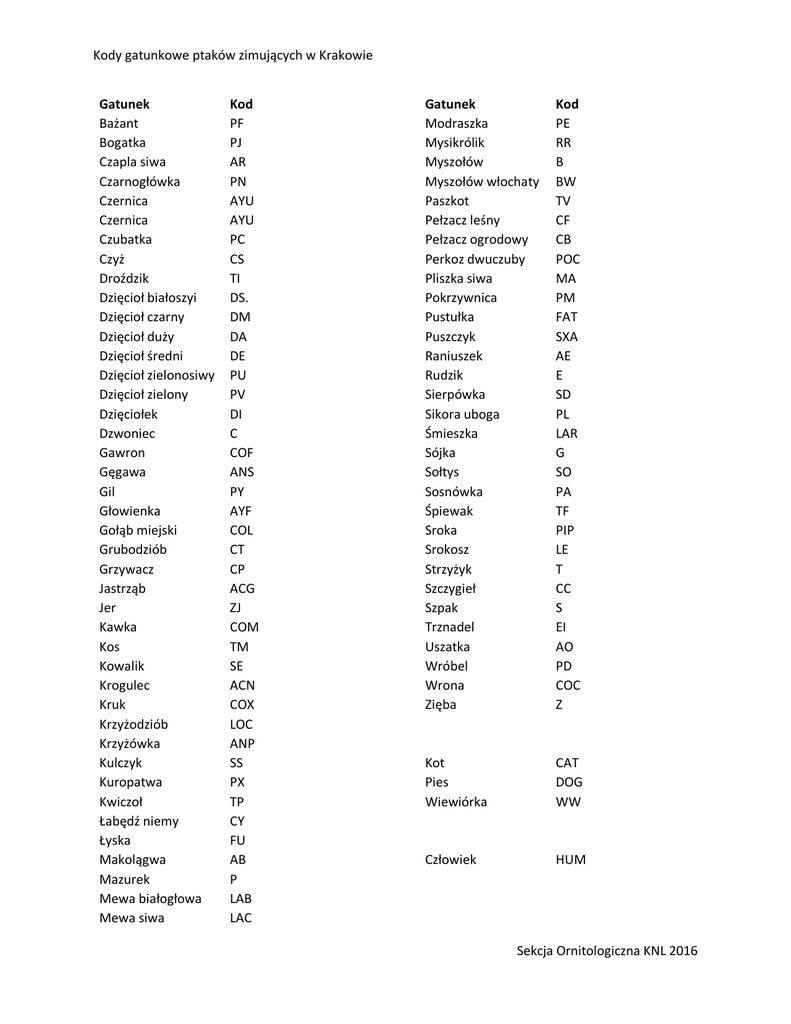 Kody gatunkowe ptaków zimujących w Krakowie Gatunek Bażant Bogatka Czapla siwa Czarnogłówka Czernica Czernica Czubatka Czyż Droździk Dzięcioł białoszyi Dzięcioł czarny Dzięcioł duży Dzięcioł średni Dzięcioł zielonosiwy Dzięcioł zielony Dzięciołek Dzwoniec Gawron Gęgawa Gil Głowienka Gołąb miejski Grubodziób Grzywacz Jastrząb Jer Kawka Kos Kowalik Krogulec Kruk Krzyżodziób Krzyżówka Kulczyk Kuropatwa Kwiczoł Łabędź niemy Łyska Makolągwa Mazurek Mewa białogłowa Mewa siwa Kod PF PJ AR PN AYU AYU PC CS TI DS. DM DA DE PU PV DI C COF ANS PY AYF COL CT CP ACG ZJ COM TM SE ACN COX LOC ANP SS PX TP CY FU AB P LAB LAC Gatunek Modraszka Mysikrólik Myszołów Myszołów włochaty Paszkot Pełzacz leśny Pełzacz ogrodowy Perkoz dwuczuby Pliszka siwa Pokrzywnica Pustułka Puszczyk Raniuszek Rudzik Sierpówka Sikora uboga Śmieszka Sójka Sołtys Sosnówka Śpiewak Sroka Srokosz Strzyżyk Szczygieł Szpak Trznadel Uszatka Wróbel Wrona Zięba Kod PE RR B BW TV CF CB POC MA PM FAT SXA AE E SD PL LAR G SO PA TF PIP LE T CC S EI AO PD COC Z Kot Pies Wiewiórka CAT DOG WW Człowiek HUM Sekcja Ornitologiczna KNL 2016