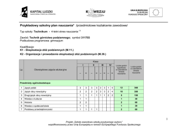 Przykładowy szkolny plan nauczania* /przedmiotowe kształcenie zawodowe/ Typ szkoły: Technikum - 4-letni okres nauczania /1/ Zawód: Technik górnictwa podziemnego; symbol 311703 Podbudowa programowa: gimnazjum Kwalifikacje: K1 - Eksploatacja złóż podziemnych (M.11.) K2 - Organizacja i prowadzenie eksploatacji złóż podziemnych (M.39.) Klasa II I II I II IV I III II II I I Liczba godzin tygodniowo w czteroletnim okresie nauczania 1 Język polski 3 3 3 3 3 3 1 5 12 360 2 Język obcy nowożytny 2 2 2 2 3 3 2 4 10 300 3 Drugi język obcy nowożytny 1 1 1 1 1 1 2 2 5 150 4 Wiedza o kulturze 1 1 1 30 5 Historia 2 2 2 60 6 Wiedza o społeczeństwie 1 1 1 30 7 Podstawy przedsiębiorczości 1 1 2 60 Obowiązkowe zajęcia edukacyjne Lp. Liczba godzin w czteroletnim okresie nauczania Przedmioty ogólnokształcące 1 1 1 Projekt „Szkoła zawodowa szkołą pozytywnego wyboru” współfinansowany przez Unię Europejską w ramach Europejskiego Funduszu Społecznego 8 Geografia 1 1 1 30 9 Biologia 1 1 1 30 10 Chemia 1 1 1 30 11 Fizyka 1 1 1 30 12 Matematyka 2 2 10 300 13 Informatyka 1 1 1 30 14 Wychowanie fizyczne 3 3 12 360 15 Edukacja dla bezpieczeństwa 1 1 1 30 16 Zajęcia z wychowawcą 1 1 4 120 65 1950 Łączna liczba godzin 2 2 3 3 1 23 1 3 3 3 3 1 13 1 3 3 3 3 1 14 1 15 Przedmioty realizowane w zakresie rozszerzonym oraz uzupełniające 1 Geografia 2 Matematyka 3 Historia i społeczeństwo - przedmiot uzupełniający 1 Łączna liczba godzin 1 1 1 1 1 1 3 1 3 1 3 2 5 4 8 240 6 180 1 1 2 4 4 120 18 540 10 300 4 5 120 150 3 2 1 90 60 30 25 750 2 5 10 Przedmioty w kształceniu zawodowym teoretycznym 1 2 3 4 5 6 Eksploatacja podziemna złóż Podstawy geologii i górnictwa podziemnego Podstawy techniki i konstrukcji maszyn 1 1 6 6 2 2 2 2 2 2 2 2 2 2 1 1 2 1 1 2 1 1 Przepisy prawa i bhp w górnictwie Język obcy zawodowy w górnictwie Działalność gospodarcza w górnictwie Łączna liczba godzin 5 10 7 2 2 2 3 2 Projekt „Szkoła zawodowa szkołą pozytywnego wyboru” współfinansowany przez Unię Europejską w ramach Europejskiego Funduszu Społecznego Przedmioty w kształceniu zawodowym praktycznym** 1 2 3 4 Techniki eksploatacyjne Komputerowe wspomaganie zawodu Maszyny i urządzenia górnicze 4 4 2 4 4 2 4 8 8 6 19 2 4 570 60 120 Łączna liczba godzin 4 10 8 3 25 750 Łączna liczba godzin kształcenia zawodowego 9 20 15 8 50 1500 33 35 34 31 133 3990 Tygodniowy wymiar godzin obowiązkowych zajęć edukacyjnych /1/ do celów obliczeniowych przyjęto 30 tygodni w ciągu jednego roku szkolnego *w szkolnym planie uwzględnia się również wymiar godzin zajęć określonych w par. 4 ust. 2 rozporządzenia w sprawie ramowych planów nauczania, t.j. m.in. religii lub etyki oraz wychowania do życia w rodzinie. **zajęcia odbywają się w pracowniach szkolnych, warsztatach szkolnych, centrach kształcenia praktycznego oraz u pracodawcy Wymiar praktyk zawodowych tyg. godz. kl. I - zgodnie z podstawą programową 0 kl. II - zgodnie z podstawą programową 0 kl. III - zgodnie z podstawą programową 4 kl. IV - zgodnie z podstawą programową 160 0 Razem 4 160 Egzamin potwierdzający pierwszą kwalifikację K1 odbywa się pod koniec klasy trzeciej. Egzamin potwierdzający drugą kwalifikację K2 odbywa się pod koniec pierwszego semestru klasy czwartej. 3 Projekt „Szkoła zawodowa szkołą pozytywnego wyboru” współfinansowany przez Unię Europejską w ramach Europejskiego Funduszu Społecznego Tabela efektów kształcenia I II III IV Liczba godzin przeznaczona na realizację efektów kształcenia Uczeń: klasa I II I II I II I II Efekty kształcenia /umiejętności, wiedza oraz kompetencje personalne i społeczne/ Efekty wspólne dla wszystkich zawodów / wspólne dla zawodów w ramach obszaru M /kwalifikacje Nazwa zajęć edukacyjnych Tabela przyporządkowania poszczególnym przedmiotom efektów kształcenia dla zawodu : technik górnictwa podziemnego; symbol: 311703 Eksploatacja podziemna złóż Kształcenie zawodowe teoretyczne BHP(4) przewiduje zagrożenia dla zdrowia i życia człowieka oraz mienia i środowiska związane z wykonywaniem zadań zawodowych; XXXXXXX BHP(5) określa zagrożenia związane z występowaniem szkodliwych czynników w środowisku pracy; XXXXXXX BHP(6) określa skutki oddziaływania czynników szkodliwych na organizm człowieka; BHP XXXXXXX BHP(8) stosuje środki ochrony indywidualnej i zbiorowej podczas wykonywania zadań zawodowych; XXXXXXX BHP(9) przestrzega zasad bezpieczeństwa i higieny pracy oraz stosuje przepisy prawa dotyczące ochrony przeciwpożarowej i ochrony środowiska; XXXXXXX 10 4 Projekt „Szkoła zawodowa szkołą pozytywnego wyboru” współfinansowany przez Unię Europejską w ramach Europejskiego Funduszu Społecznego BHP(10) udziela pierwszej pomocy poszkodowanym w wypadkach przy pracy oraz w stanach zagrożenia zdrowia i życia; XXXXXXX PDG(7) przygotowuje dokumentację niezbędną do uruchomienia i prowadzenia działalności gospodarczej; PDG(8) prowadzi korespondencję związaną z prowadzeniem działalności gospodarczej; PDG(9) obsługuje urządzenia biurowe oraz stosuje programy komputerowe wspomagające prowadzenie działalności gospodarczej; XX XX PDG PDG(10) planuje i podejmuje działania marketingowe prowadzonej działalności gospodarczej XX PDG(11) optymalizuje koszty i przychody prowadzonej działalności gospodarczej XX KPS(1) przestrzega zasad kultury i etyki; XXXXXXX KPS(2) jest kreatywny i konsekwentny w realizacji zadań; XXXXXXX KPS(3) przewiduje skutki podejmowanych działań; XXXXXXX KPS(4) jest otwarty na zmiany; KPS XXXXXXX OMZ XXXX XXXX XXXX XX XX XX XX KPS(6) aktualizuje wiedzę i doskonali umiejętności zawodowe; KPS(8) potrafi ponosić odpowiedzialność za podejmowane działania; KPS(10) współpracuje w zespole; OMZ(1) planuje pracę zespołu w celu wykonywania przydzielonych zadań; OMZ(2) dobiera osoby do wykonania przydzielonych zadań; OMZ(3) kieruje wykonaniem przydzielonych zadań; OMZ(4) oceni