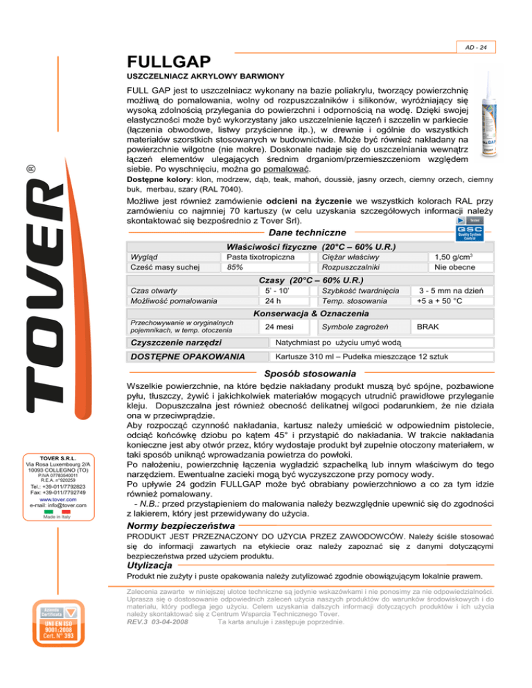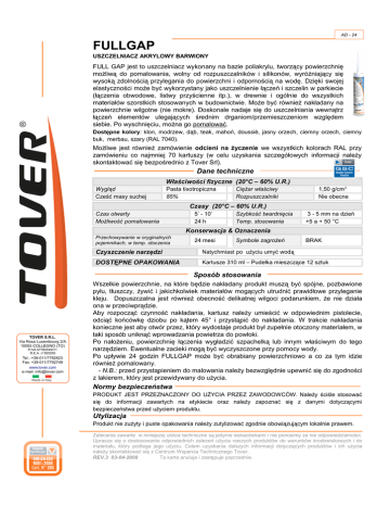AD - 24 FULLGAP USZCZELNIACZ AKRYLOWY BARWIONY FULL GAP jest to uszczelniacz wykonany na bazie poliakrylu, tworzący powierzchnię możliwą do pomalowania, wolny od rozpuszczalników i silikonów, wyróżniający się wysoką zdolnością przylegania do powierzchni i odpornością na wodę. Dzięki swojej elastyczności może być wykorzystany jako uszczelnienie łączeń i szczelin w parkiecie (łączenia obwodowe, listwy przyścienne itp.), w drewnie i ogólnie do wszystkich materiałów szorstkich stosowanych w budownictwie. Może być również nakładany na powierzchnie wilgotne (nie mokre). Doskonale nadaje się do uszczelniania wewnątrz łączeń elementów ulegających średnim drganiom/przemieszczeniom względem siebie. Po wyschnięciu, można go pomalować. Dostępne kolory: klon, modrzew, dąb, teak, mahoń, doussiè, jasny orzech, ciemny orzech, ciemny buk, merbau, szary (RAL 7040). Możliwe jest również zamówienie odcieni na życzenie we wszystkich kolorach RAL przy zamówieniu co najmniej 70 kartuszy (w celu uzyskania szczegółowych informacji należy skontaktować się bezpośrednio z Tover Srl). Dane techniczne Właściwości fizyczne (20°C – 60% U.R.) Wygląd Cześć masy suchej Pasta tixotropiczna 85% Ciężar właściwy Rozpuszczalniki 1,50 g/cm3 Nie obecne Czasy (20°C – 60% U.R.) Czas otwarty Możliwość pomalowania 5’ - 10’ 24 h Szybkość twardnięcia Temp. stosowania 3 - 5 mm na dzień +5 a + 50 °C Konserwacja & Oznaczenia Przechowywanie w oryginalnych pojemnikach, w temp. otoczenia 24 mesi Symbole zagrożeń BRAK Czyszczenie narzędzi Natychmiast po użyciu umyć wodą DOSTĘPNE OPAKOWANIA Kartusze 310 ml – Pudełka mieszczące 12 sztuk Sposób stosowania Wszelkie powierzchnie, na które będzie nakładany produkt muszą być spójne, pozbawione pyłu, tłuszczy, żywić i jakichkolwiek materiałów mogących utrudnić prawidłowe przyleganie kleju. Dopuszczalna jest również obecność delikatnej wilgoci podarunkiem, że nie działa ona w przeciwprądzie. Aby rozpocząć czynność nakładania, kartusz należy umieścić w odpowiednim pistolecie, odciąć końcówkę dziobu po kątem 45° i przystąpić do nakładania. W trakcie nakładania konieczne jest aby otwór przez, który wydostaje produkt był zupełnie otoczony materiałem, w taki sposób uniknąć wprowadzania powietrza do powłoki. Po nałożeniu, powierzchnię łączenia wygładzić szpachelką lub innym właściwym do tego narzędziem. Ewentualne zacieki mogą być wyczyszczone przy pomocy wody. Po upływie 24 godzin FULLGAP może być obrabiany powierzchniowo a co za tym idzie również pomalowany. - N.B.: przed przystąpieniem do malowania należy bezwzględnie upewnić się do zgodności z lakierem, który jest przewidywany do użycia. Normy bezpieczeństwa PRODUKT JEST PRZEZNACZONY DO UŻYCIA PRZEZ ZAWODOWCÓW. Należy ściśle stosować się do informacji zawartych na etykiecie oraz należy zapoznać się z danymi dotyczącymi bezpieczeństwa przed użyciem produktu. Utylizacja Produkt nie zużyty i puste opakowania należy zutylizować zgodnie obowiązującym lokalnie prawem. Zalecenia zawarte w niniejszej ulotce techniczne są jedynie wskazówkami i nie ponosimy za nie odpowiedzialności. Uprasza się o dostosowanie odpowiednich zaleceń użycia naszych produktów do warunków środowiskowych i do materiału, który podlega jego użyciu. Celem uzyskania dalszych informacji dotyczących produktów i ich użycia należy skontaktować się z Centrum Wsparcia Technicznego Tover. REV.3 03-04-2008 Ta karta anuluje i zastępuje poprzednie.