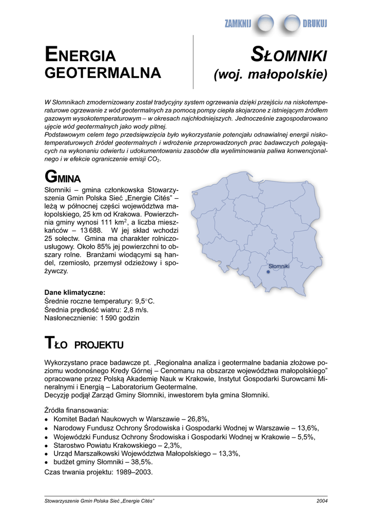 ENERGIA GEOTERMALNA SŁOMNIKI (woj. małopolskie) W Słomnikach zmodernizowany został tradycyjny system ogrzewania dzieki ˛ przejściu na niskotemperaturowe ogrzewanie z wód geotermalnych za pomoca˛ pompy ciepła skojarzone z istniejacym ˛ źródłem gazowym wysokotemperaturowym – w okresach najchłodniejszych. Jednocześnie zagospodarowano ujecie ˛ wód geotermalnych jako wody pitnej. Podstawowym celem tego przedsiewzi ˛ ecia ˛ było wykorzystanie potencjału odnawialnej energii niskotemperaturowych źródeł geotermalnych i wdrożenie przeprowadzonych prac badawczych polegaja˛ cych na wykonaniu odwiertu i udokumentowaniu zasobów dla wyeliminowania paliwa konwencjonalnego i w efekcie ograniczenie emisji CO2 . GMINA Słomniki – gmina członkowska Stowarzyszenia Gmin Polska Sieć „Energie Cités” – leża˛ w północnej cz˛eści województwa małopolskiego, 25 km od Krakowa. Powierzchnia gminy wynosi 111 km2 , a liczba mieszkańców – 13 688. W jej skład wchodzi 25 sołectw. Gmina ma charakter rolniczousługowy. Około 85% jej powierzchni to obszary rolne. Branżami wiodacymi ˛ sa˛ handel, rzemiosło, przemysł odzieżowy i spożywczy. Dane klimatyczne: Średnie roczne temperatury: 9,5◦ C. Średnia predkość ˛ wiatru: 2,8 m/s. Nasłonecznienie: 1 590 godzin TŁO PROJEKTU Wykorzystano prace badawcze pt. „Regionalna analiza i geotermalne badania złożowe poziomu wodonośnego Kredy Górnej – Cenomanu na obszarze województwa małopolskiego” opracowane przez Polska˛ Akademie˛ Nauk w Krakowie, Instytut Gospodarki Surowcami Mineralnymi i Energia˛ – Laboratorium Geotermalne. Decyzje˛ podjał˛ Zarzad ˛ Gminy Słomniki, inwestorem była gmina Słomniki. Źródła finansowania: • Komitet Badań Naukowych w Warszawie – 26,8%, • Narodowy Fundusz Ochrony Środowiska i Gospodarki Wodnej w Warszawie – 13,6%, • Wojewódzki Fundusz Ochrony Środowiska i Gospodarki Wodnej w Krakowie – 5,5%, • Starostwo Powiatu Krakowskiego – 2,3%, • Urzad ˛ Marszałkowski Województwa Małopolskiego – 13,3%, • budżet gminy Słomniki – 38,5%. Czas trwania projektu: 1989–2003. Stowarzyszenie Gmin Polska Sieć „Energie Cités” 2004 Energia geotermalna Słomniki (woj. małopolskie) OPIS PROJEKTU Opis technologii W projekcie przewidziano zastapienie ˛ paliwa gazowego dla około 283 kW mocy cieplnej energia˛ pochodzac ˛ a˛ z pompy ciepła wykorzystujacej ˛ wody podziemne o temperaturze około 17◦ C. Temperatura ta umożliwiła uzyskanie sprawności pompy ciepła na poziomie rz˛edu 4,5. Taka sprawność gwarantuje niskie koszty produkcji jednostki ciepła i zastepuje ˛ blisko 60% dotychczas zużywanego gazu. OCENA PROJEKTU I PERSPEKTYWY ROZWOJU Przewidywany efekt ekologiczny to redukcja emisji: • CO2 – 125,282 t/rok • CO – 0,024 t/rok • NOx – 0,072 t/rok • pył – 0,002 t/rok • weglowodory ˛ aromatyczne – 0,003 t/rok • weglowodory ˛ alifatyczne – 0,006 t/rok. Całkowita zredukowana emisja równoważna – 0,077 t/rok. Działania po zakończeniu projektu: stały monitoring pracy kotłowni wraz z pompa˛ ciepła, wykorzystanie wody z odwiertu po oddaniu ciepła do celów pitnych (woda ta jest zatłaczana do sieci wodociagowej). ˛ WIECEJ ˛ INFORMACJI Andrzej Żmigrodzki Wiceburmistrz Urzad ˛ Miejski w Słomnikach 32-090 Słomniki, ul. Kościuszki 64 tel./fax 12 388 11 02; 12 388 21 02 e-mail: [email protected] Opracowanie zostało przygotowane przez Urzad ˛ Miejski POLSKA SIEĆ w Słomnikach w ramach projektu pt. „Energia odnawialna jako wyzwanie dla samorzadów ˛ lokalnych. Przykłady udanych przedsiewzi ˛ eć ˛ w Polsce i w krajach Unii Europejskiej” realizowanego przez Stowarzyszenie Gmin Polska Sieć „Energie Cités”. Środki finansowe pozyskano z Narodowego Funduszu Ochrony Środowiska i Gospodarki Wodnej, Wojewódzkiego Funduszu Ochrony Środowiska i Gospodarki Wodnej w Katowicach oraz Wojewódzkiego Funduszu Ochrony Środowiska i Gospodarki Wodnej w Krakowie. Stowarzyszenie Gmin Polska Sieć „Energie Cités” 2004