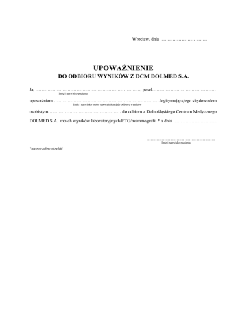 Wrocław, dnia …………………………. UPOWAśNIENIE DO ODBIORU WYNIKÓW Z DCM DOLMED S.A. Ja, ……………………………………………………………, pesel…………………………………… Imię i nazwisko pacjenta upowaŜniam …………………………………………………………….legitymującą/ego się dowodem Imię i nazwisko osoby upowaŜnionej do odbioru wyników osobistym………………………………………… do odbioru z Dolnośląskiego Centrum Medycznego DOLMED S.A. moich wyników laboratoryjnych/RTG/mammografii * z dnia ……………………….. ………………………………………………. Imię i nazwisko pacjenta *niepotrzebne skreślić