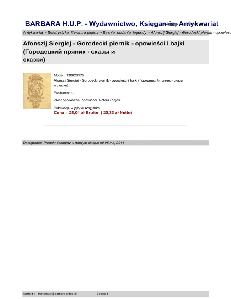 Utworzono Antykwariat : 04 marzec 2017 BARBARA H.U.P. - Wydawnictwo, Księgarnia, Antykwariat > Beletrystyka, literatura piękna > Baśnie, podania, legendy > Afonszij Siergiej - Gorodecki piernik - opowieśc Afonszij Siergiej - Gorodecki piernik - opowieści i bajki (Городецкий пряник - сказы и сказки) Model : 120920375 Afonszij Siergiej - Gorodecki piernik - opowieści i bajki (Городецкий пряник - сказы и сказки) Producent : Zbiór opowiadań, opowieści, historii i bajek. Publikacja w języku rosyjskim. Cena : 25,01 zł Brutto ( 20,33 zł Netto) Dostępność: Produkt dostępny w naszym sklepie od 05 maj 2014 kontakt : - [email protected] Strona 1