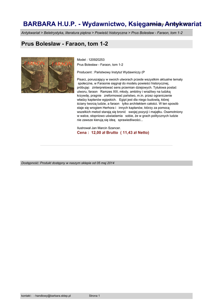 Utworzono Antykwariat : 04 marzec 2017 BARBARA H.U.P. - Wydawnictwo, Księgarnia, Antykwariat > Beletrystyka, literatura piękna > Powieść historyczna > Prus Bolesław - Faraon, tom 1-2 Prus Bolesław - Faraon, tom 1-2 Model : 120920253 Prus Bolesław - Faraon, tom 1-2 Producent : Państwowy Instytut Wydawniczy (P Pisarz, poruszający w swoich utworach przede wszystkim aktualne tematy społeczne, w Faraonie sięgnął do modelu powieści historycznej, próbując zinterpretować sens przemian dziejowych. Tytułowa postać utworu, faraon Ramzes XIII, młody, ambitny i wrażliwy na ludzką krzywdę, pragnie zreformować państwo, m.in. przez ograniczenie władzy kapłanów egipskich. Egipt jest dla niego budowlą, której ściany tworzą ludzie, a faraon tylko architektem całości. W ten sposób staje się wrogiem Herhora i innych kapłanów, którzy za pomocą wszelkich metod starają się bronić swojej pozycji i majątku. Osamotniony w walce, stopniowo uświadamia sobie, że w grach politycznych ludzie nie zawsze kierują się ideą sprawiedliwości... Ilustrował Jan Marcin Szancer. Cena : 12,00 zł Brutto ( 11,43 zł Netto) Dostępność: Produkt dostępny w naszym sklepie od 05 maj 2014 kontakt : - [email protected] Strona 1