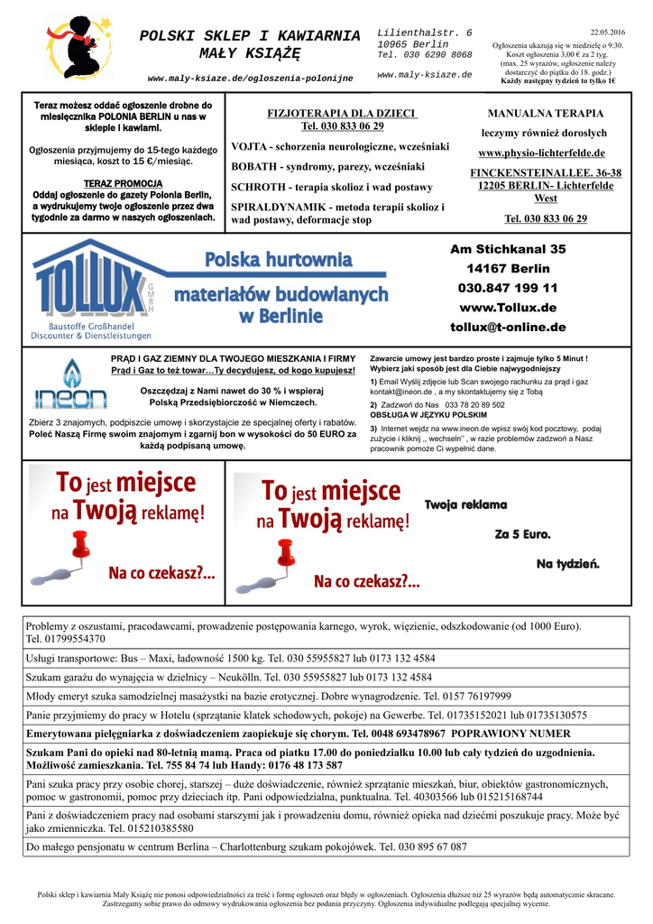 POLSKI SKLEP I KAWIARNIA MAŁY KSIĄŻĘ Lilienthalstr. 6 10965 Berlin www.maly-ksiaze.de/ogloszenia-polonijne www.maly-ksiaze.de Teraz możesz oddać ogłoszenie drobne do miesięcznika POLONIA BERLIN u nas w sklepie i kawiarni. Tel. 030 6290 8068 FIZJOTERAPIA DLA DZIECI Tel. 030 833 06 29 22.05.2016 Ogłoszenia ukazują się w niedzielę o 9:30. Koszt ogłoszenia 3,00 € za 2 tyg. (max. 25 wyrazów, ogłoszenie należy dostarczyć do piątku do 18. godz.) Każdy następny tydzień to tylko 1€ MANUALNA TERAPIA leczymy również dorosłych Ogłoszenia przyjmujemy do 15-tego każdego miesiąca, koszt to 15 €/miesiąc. VOJTA - schorzenia neurologiczne, wcześniaki TERAZ PROMOCJA Oddaj ogłoszenie do gazety Polonia Berlin, a wydrukujemy twoje ogłoszenie przez dwa tygodnie za darmo w naszych ogłoszeniach. SCHROTH - terapia skolioz i wad postawy www.physio-lichterfelde.de BOBATH - syndromy, parezy, wcześniaki FINCKENSTEINALLEE. 36-38 12205 BERLIN- Lichterfelde West SPIRALDYNAMIK - metoda terapii skolioz i wad postawy, deformacje stop Tel. 030 833 06 29 Am Stichkanal 35 14167 Berlin 030.847 199 11 www.Tollux.de [email protected] PRĄD I GAZ ZIEMNY DLA TWOJEGO MIESZKANIA I FIRMY Prąd i Gaz to też towar…Ty decydujesz, od kogo kupujesz! Oszczędzaj z Nami nawet do 30 % i wspieraj Polską Przedsiębiorczość w Niemczech. Zbierz 3 znajomych, podpiszcie umowę i skorzystajcie ze specjalnej oferty i rabatów. Poleć Naszą Firmę swoim znajomym i zgarnij bon w wysokości do 50 EURO za każdą podpisaną umowę. Zawarcie umowy jest bardzo proste i zajmuje tylko 5 Minut ! Wybierz jaki sposób jest dla Ciebie najwygodniejszy 1) Email Wyślij zdjęcie lub Scan swojego rachunku za prąd i gaz [email protected] , a my skontaktujemy się z Tobą 2) Zadzwoń do Nas 033 78 20 89 502 OBSŁUGA W JĘZYKU POLSKIM 3) Internet wejdz na www.ineon.de wpisz swój kod pocztowy, podaj zużycie i kliknij ,, wechseln’’ , w razie problemów zadzwoń a Nasz pracownik pomoże Ci wypełnić dane. Twoja reklama Za 5 Euro. Na tydzie ń. Problemy z oszustami, pracodawcami, prowadzenie postępowania karnego, wyrok, więzienie, odszkodowanie (od 1000 Euro). Tel. 01799554370 Usługi transportowe: Bus – Maxi, ładowność 1500 kg. Tel. 030 55955827 lub 0173 132 4584 Szukam garażu do wynajęcia w dzielnicy – Neukölln. Tel. 030 55955827 lub 0173 132 4584 Młody emeryt szuka samodzielnej masażystki na bazie erotycznej. Dobre wynagrodzenie. Tel. 0157 76197999 Panie przyjmiemy do pracy w Hotelu (sprzątanie klatek schodowych, pokoje) na Gewerbe. Tel. 01735152021 lub 01735130575 Emerytowana pielęgniarka z doświadczeniem zaopiekuje się chorym. Tel. 0048 693478967 POPRAWIONY NUMER Szukam Pani do opieki nad 80-letnią mamą. Praca od piatku 17.00 do poniedziałku 10.00 lub cały tydzień do uzgodnienia. Możliwość zamieszkania. Tel. 755 84 74 lub Handy: 0176 48 173 587 Pani szuka pracy przy osobie chorej, starszej – duże doświadczenie, również sprzątanie mieszkań, biur, obiektów gastronomicznych, pomoc w gastronomii, pomoc przy dzieciach itp. Pani odpowiedzialna, punktualna. Tel. 40303566 lub 015215168744 Pani z doświadczeniem pracy nad osobami starszymi jak i prowadzeniu domu, również opieka nad dziećmi poszukuje pracy. Może być jako zmienniczka. Tel. 015210385580 Do małego pensjonatu w centrum Berlina – Charlottenburg szukam pokojówek. Tel. 030 895 67 087 Polski sklep i kawiarnia Mały Książę nie ponosi odpowiedzialności za treść i formę ogłoszeń oraz błędy w ogłoszeniach. Ogłoszenia dłuższe niż 25 wyrazów będą automatycznie skracane. Zastrzegamy sobie prawo do odmowy wydrukowania ogłoszenia bez podania przyczyny. Ogłoszenia indywidualne podlegają specjalnej wycenie. Natychmiast przyjmę pracownika do przeprowadzek za znajomością języka niemieckiego, który posiada prawo jazdy do 7,5t. Tel. 0170 2388887 Szukam pracy (Gewerbe) malowanie , regeneracja drzwi, okien, pomoc budowlana, rozbiórki itp. Tel. 01633900133 Przyjmę na mieszkanie kobietę blisko U-bahnu Hermannplatz, cena do uzgodnienia tel. 015772148617 Pomogę w sprawach urzędowych, , Job center, EKS, Kindergeld, WBS, wypełnianie dokumentów, formularzy/Antrag, pisanie pism urzędowych, rachunków, Steuer itp. Tel.015777926227 Przyjmę mężczyznę na mieszkanie. Tel. 1073 1886425 Wynajmę duży niezależny pokój w centrum Berlina. Tel. 0048 661916627 Megtrans Kleintransporte. Przeprowadzki, opróżnianie pomieszczeń, przewóz sklep-dom, Berlin i okolice, Polska. 24h E-mail: [email protected]. Tel. 0177 6423550 lub 015117890903, www.megtrans.de Doświadczony murarz, tynkarz, szpachlarz szuka pracy. Tel 015214900805 Sprzedam M3, Centrum Częstochowy, parkiet, kafelki, domofon, parking, stan bardzo dobry oraz 2,25 ziemi k/Częstochowy Ekipa 5-6 osobowa poszukuje pracy, wykończeniówka, docieplenia, renowacja okien, drzwi, solary, ogrody. Tel. +4915212049336 Przyjmę osobę na mieszkanie. Oderstr. (Neukölln). Tel. 030/62721172 Sprzedam dom 10 min od granicy, prawie wykończony, nie musisz jeździć daleko, kup, cena do uzgodnienia. Tel. 0048606137138 lub 015217663128 Wynajmę pokój dla Pani w dzielnicy Neukölln, blisko U-Lipschitzallee. Tel. 030 602-58-845 Oferuję pomoc w sprzątaniu domu. Tel. 0048 601 872 534 Szukam pracy jako opiekunka do dzieci, w godzinach porannych. Po południu pracuję jako nauczyciel języka polskiego. Mój telefon: 015217424600 Krankenschwester od 35-lat w Berlinie, stały pobyt, zaopiekuje się starszą osobą. Mam doświadczenie w tym kierunku. Tel. 49795424 lub 015214509921 Młody pracowity mężczyzna szuka pilnie pracy. Tel. 015785092657 Poszukuje pracowników do prac remontowo-budowlanych. Regipsy, szpachlowanie, płytki, malowanie i inne prace wykończeniowe. Tylko z Gewerbą i kompletem dokumentów. Tel. 01774507723 Sprzedam mieszkanie 58m² własnościowe w Międzyzdroje 80m od morza. Kontakt 015732106379 Spotkania Brydżowe, każda środa od 16. godz. Kawiarnia Mały K