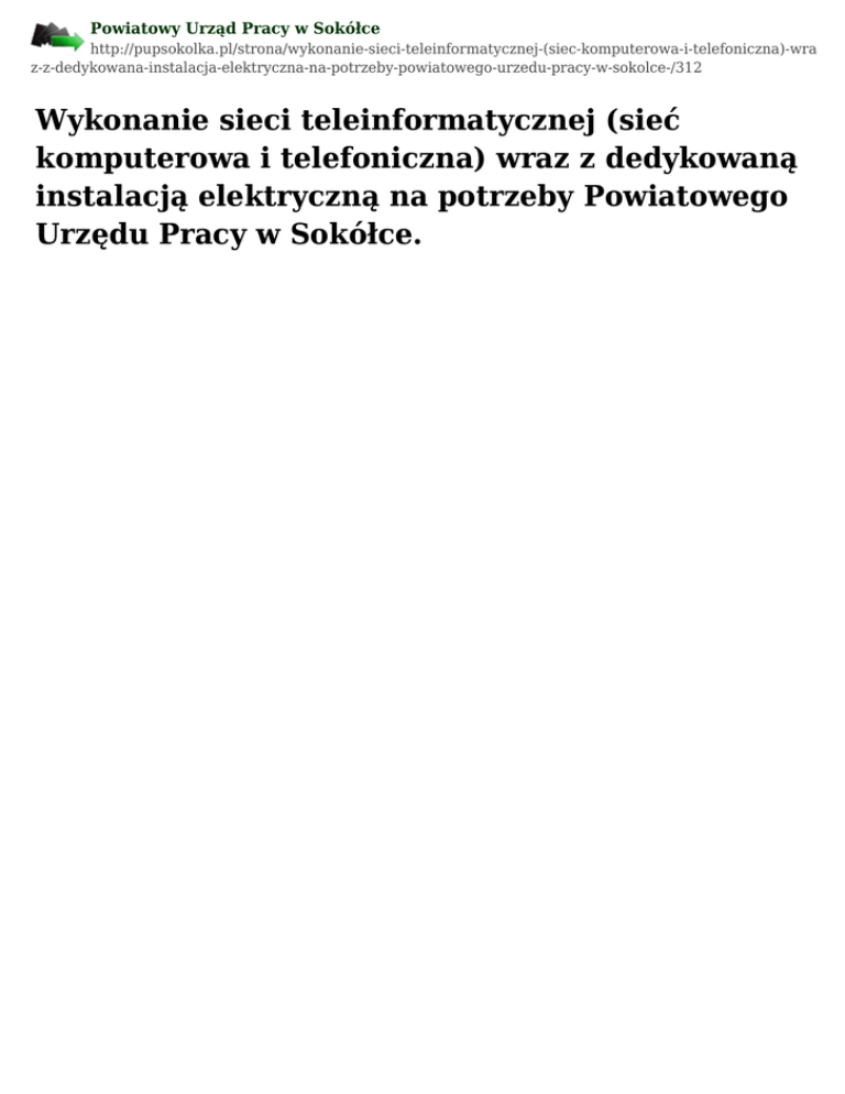 Powiatowy Urząd Pracy w Sokółce http://pupsokolka.pl/strona/wykonanie-sieci-teleinformatycznej-(siec-komputerowa-i-telefoniczna)-wra z-z-dedykowana-instalacja-elektryczna-na-potrzeby-powiatowego-urzedu-pracy-w-sokolce-/312 Wykonanie sieci teleinformatycznej (sieć komputerowa i telefoniczna) wraz z dedykowaną instalacją elektryczną na potrzeby Powiatowego Urzędu Pracy w Sokółce.