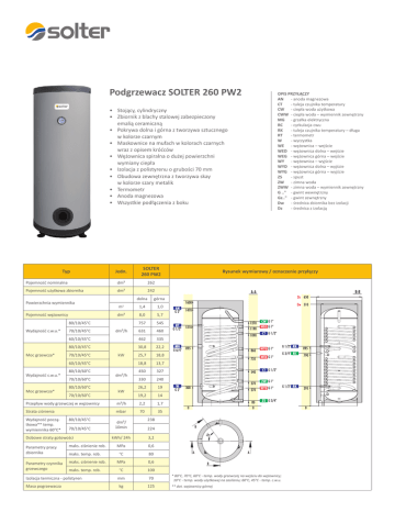 Podgrzewacz SOLTER 260 PW2 • Stoj¹cy, cylindryczny • Zbiornik z blachy stalowej zabezpieczony emali¹ ceramiczn¹ • Pokrywa dolna i górna z tworzywa sztucznego w kolorze czarnym • Maskownice na mufach w kolorach czarnych wraz z opisem króæców • Wê¿ownica spiralna o du¿ej powierzchni wymiany ciep³a • Izolacja z polistyrenu o gruboœci 70 mm • Obudowa zewnêtrzna z tworzywa skay w kolorze szary metalik • Termometr • Anoda magnezowa • Wszystkie pod³¹czenia z boku Typ Pojemnoœæ nominalna Opis przy³¹czy Jedn. SOLTER 260 PW2 dm³ 262 OPIS PRZY£¥CZY AN - anoda magnezowa CT - tuleja czujnika temperatury CW - ciepùa woda uýytkowa CWW - ciepùa woda – wymiennik zewnætrzny MG - grzaùka elektryczna RC - cyrkulacja cwu RK - tuleja czujnika temperatury – dùuga RT - termometr W - wyczystka WE - wæýownica – wejúcie WED - wæýownica dolna – wejúcie WEG - wæýownica górna – wejúcie WY - wæýownica – wyjúcie WYD - wæýownica dolna – wyjúcie WYG - wæýownica górna – wyjúcie ZS - spust ZW - zimna woda ZWW - zimna woda – wymiennik zewnætrzny G .." - gwint wewnætrzny Gz.." - gwint zewnætrzny Dw - úrednica zbiornika bez izolacji Dz - úrednica z izolacjà Rysunek wymiarowy / oznaczenie przy³¹czy Pojemnoœæ u¿ytkowa zbiornika AN dm³ 242 - anoda magnezowa - tuleja czujnika temperatury dolna górna - ciep³a woda2 u¿ytkowa 1,0 m 1,4 - ciep³a woda – wymiennik zewnêtrzny dm³ 8,0 5,7 - grza³ka elektryczna 757 545 - cyrkulacja cwu - tuleja czujnika – d³uga dm³/h temperatury 631 460 - termometr 462 335 - wyczystka 30,8 22,2 - wê¿ownica – wejœcie Moc grzewcza* 70/10/45°C kW 25,7 18,8 WED - wê¿ownica dolna – wejœcie 60/10/45°C 18,8 WEG - wê¿ownica górna – wejœcie 13,7 80/10/60°C 327 WY - wê¿ownica – wyjœcie450 Wydajnoœæ c.w.u.* dm³/h WYD - wê¿ownica dolna – wyjœcie 70/10/60°C 330 240 wyjœcie 19 WYG - wê¿ownica górna – 26,2 80/10/60°C Moc grzewcza* kW - spust ZS 70/10/60°C 19,2 14 ZW - zimna woda Przep³yw wody grzewczej w wê¿ownicy m³/h 2,2 1,7 ZWW - zimna woda – wymiennik zewnêtrzny G ..” - gwint wewnêtrzny Strata ciœnienia mbar 70 35 Gz..” gwint zewnêtrzny Wydajnoœæ pocz¹80/10/45°C 238 dm³/ Dw tkowa** temp. - œrednica zbiornika bez izolacji CT Powierzchnia wymiennika CW CWW Pojemnoœæ wê¿ownicy MG 80/10/45°C RC RK Wydajnoœæ c.w.u.* 70/10/45°C RT 60/10/45°C W 80/10/45°C WE wymiennika 60°C* 70/10/45°C Dz Dobowe straty gotowoœci Parametry pracy zbiornika maks. ciœnienie rob. Parametry czynnika grzewczego maks. ciœnienie rob. maks. temp. rob. maks. temp. rob. Izolacja termiczna - polistyren Masa pogrzewacza 10min 224 kWh/ 24h 3,2 MPa 0,6 - œrednica z izolacj¹ °C 80 MPa 0,6 °C 100 mm 70 * 80°C, 70°C, 60°C - temp. wody grzewczej na wejœciu do wê¿ownicy; 10°C - temp. wody u¿ytkowej na zasilaniu; 60°C, 45°C - temp. c.w.u. kg 125 ** dot. wê¿ownicy górnej