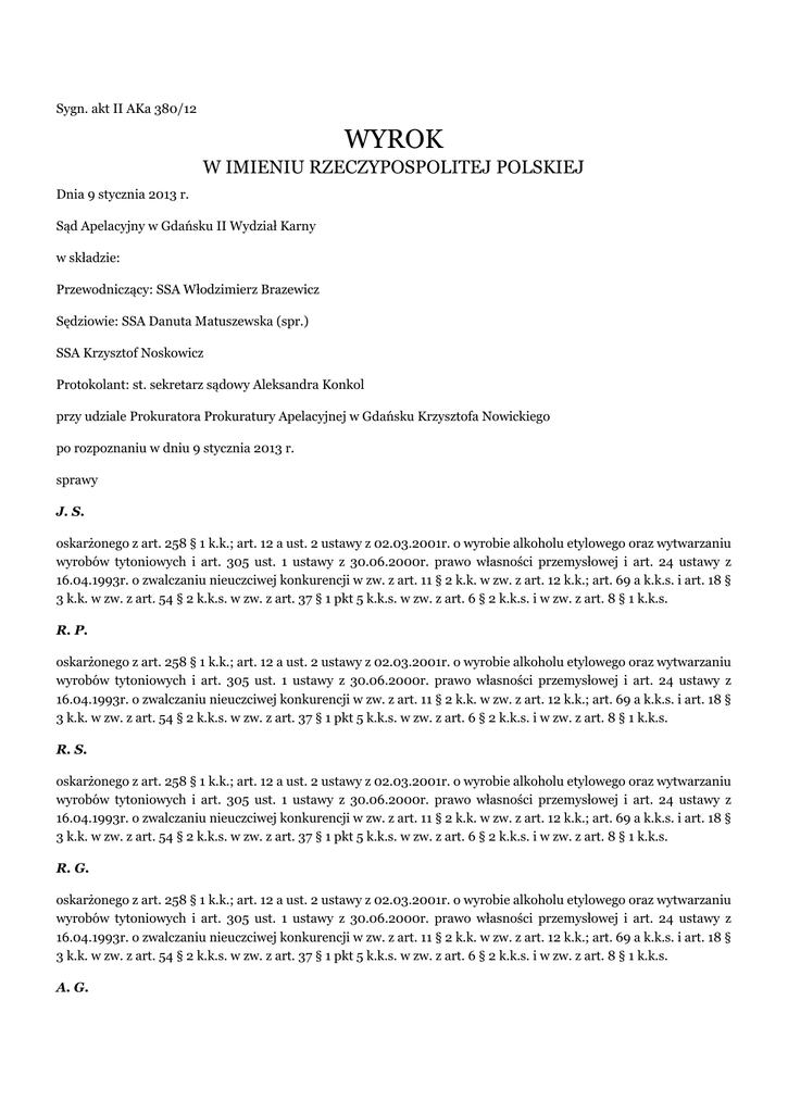 Sygn. akt II AKa 380/12 WYROK W IMIENIU RZECZYPOSPOLITEJ POLSKIEJ Dnia 9 stycznia 2013 r. Sąd Apelacyjny w Gdańsku II Wydział Karny w składzie: Przewodniczący: SSA Włodzimierz Brazewicz Sędziowie: SSA Danuta Matuszewska (spr.) SSA Krzysztof Noskowicz Protokolant: st. sekretarz sądowy Aleksandra Konkol przy udziale Prokuratora Prokuratury Apelacyjnej w Gdańsku Krzysztofa Nowickiego po rozpoznaniu w dniu 9 stycznia 2013 r. sprawy J. S. oskarżonego z art. 258 § 1 k.k.; art. 12 a ust. 2 ustawy z 02.03.2001r. o wyrobie alkoholu etylowego oraz wytwarzaniu wyrobów tytoniowych i art. 305 ust. 1 ustawy z 30.06.2000r. prawo własności przemysłowej i art. 24 ustawy z 16.04.1993r. o zwalczaniu nieuczciwej konkurencji w zw. z art. 11 § 2 k.k. w zw. z art. 12 k.k.; art. 69 a k.k.s. i art. 18 § 3 k.k. w zw. z art. 54 § 2 k.k.s. w zw. z art. 37 § 1 pkt 5 k.k.s. w zw. z art. 6 § 2 k.k.s. i w zw. z art. 8 § 1 k.k.s. R. P. oskarżonego z art. 258 § 1 k.k.; art. 12 a ust. 2 ustawy z 02.03.2001r. o wyrobie alkoholu etylowego oraz wytwarzaniu wyrobów tytoniowych i art. 305 ust. 1 ustawy z 30.06.2000r. prawo własności przemysłowej i art. 24 ustawy z 16.04.1993r. o zwalczaniu nieuczciwej konkurencji w zw. z art. 11 § 2 k.k. w zw. z art. 12 k.k.; art. 69 a k.k.s. i art. 18 § 3 k.k. w zw. z art. 54 § 2 k.k.s. w zw. z art. 37 § 1 pkt 5 k.k.s. w zw. z art. 6 § 2 k.k.s. i w zw. z art. 8 § 1 k.k.s. R. S. oskarżonego z art. 258 § 1 k.k.; art. 12 a ust. 2 ustawy z 02.03.2001r. o wyrobie alkoholu etylowego oraz wytwarzaniu wyrobów tytoniowych i art. 305 ust. 1 ustawy z 30.06.2000r. prawo własności przemysłowej i art. 24 ustawy z 16.04.1993r. o zwalczaniu nieuczciwej konkurencji w zw. z art. 11 § 2 k.k. w zw. z art. 12 k.k.; art. 69 a k.k.s. i art. 18 § 3 k.k. w zw. z art. 54 § 2 k.k.s. w zw. z art. 37 § 1 pkt 5 k.k.s. w zw. z art. 6 § 2 k.k.s. i w zw. z art. 8 § 1 k.k.s. R. G. oskarżonego z art. 258 § 1 k.k.; art. 12 a ust. 2 ustawy z 02.03.2001r. o wyrobie alkoholu etylowego oraz wytwarzaniu wyrobów tytoniowych i art. 305 ust. 1 ustawy z 30.06.2000r. prawo własności przemysłowej i art. 24 ustawy z 16.04.1993r. o zwalczaniu nieuczciwej konkurencji w zw. z art. 11 § 2 k.k. w zw. z art. 12 k.k.; art. 69 a k.k.s. i art. 18 § 3 k.k. w zw. z art. 54 § 2 k.k.s. w zw. z art. 37 § 1 pkt 5 k.k.s. w zw. z art. 6 § 2 k.k.s. i w zw. z art. 8 § 1 k.k.s. A. G. oskarżonego z art. 258 § 1 k.k.; art. 12 a ust. 2 ustawy z 02.03.2001r. o wyrobie alkoholu etylowego oraz wytwarzaniu wyrobów tytoniowych i art. 305 ust. 1 ustawy z 30.06.2000r. prawo własności przemysłowej i art. 24 ustawy z 16.04.1993r. o zwalczaniu nieuczciwej konkurencji w zw. z art. 11 § 2 k.k. w zw. z art. 12 k.k.; art. 69 a k.k.s. i art. 18 § 3 k.k. w zw. z art. 54 § 2 k.k.s. w zw. z art. 37 § 1 pkt 5 k.k.s. w zw. z art. 6 § 2 k.k.s. i w zw. z art. 8 § 1 k.k.s. Ł. J. oskarżonego z art. 258 § 1 k.k.; art. 12 a ust. 2 ustawy z 02.03.2001r. o wyrobie alkoholu etylowego oraz wytwarzaniu wyrobów tytoniowych i art. 305 ust. 1 ustawy z 30.06.2000r. prawo własności przemysłowej i art. 24 ustawy z 16.04.1993r. o zwalczaniu nieuczciwej konkurencji w zw. z art. 11 § 2 k.k. w zw. z art. 12 k.k.; art. 69 a k.k.s. i art. 18 § 3 k.k. w zw. z art. 54 § 2 k.k.s. w zw. z art. 37 § 1 pkt 5 k.k.s. w zw. z art. 6 § 2 k.k.s. i w zw. z art. 8 § 1 k.k.s. P. P. oskarżonego z art. 258 § 1 k.k.; art. 12 a ust. 2 ustawy z 02.03.2001r. o wyrobie alkoholu etylowego oraz wytwarzaniu wyrobów tytoniowych i art. 305 ust. 1 ustawy z 30.06.2000r. prawo własności przemysłowej i art. 24 ustawy z 16.04.1993r. o zwalczaniu nieuczciwej konkurencji w zw. z art. 11 § 2 k.k. w zw. z art. 12 k.k.; art. 69 a k.k.s. i art. 18 § 3 k.k. w zw. z art. 54 § 2 k.k.s. w zw. z art. 37 § 1 pkt 5 k.k.s. w zw. z art. 6 § 2 k.k.s. i w zw. z art. 8 § 1 k.k.s. na skutek apelacji wniesionych przez pełnomocnika oskarżyciela posiłkowego i obrońców oskarżonych: J. S., R. S., R. G., A. G., Ł. J. i P. P. od wyroku Sądu Okręgowego w Bydgoszczy z dnia 21 czerwca 2012 r., sygn. akt III K 41/11 I. utrzymuje w mocy zaskarżony wyrok, uznając apelacje za oczywiście bezzasadne; II. zasądza od Skarbu Państwa na rzecz adw. A. O. – Kancelaria Adwokacka w B. kwotę 738 (siedemset trzydzieści osiem) złotych brutto tytułem kosztów obrony z urzędu w postępowaniu odwoławczym oskarżonego P. P. i kwotę 64 (sześćdziesiąt cztery) złote z tytułu poniesionych kosztów dojazdu oraz na rzecz adwokatów J. M. – Kancelaria Adwokacka w B., J. O. - Kancelaria Adwokacka w B. kwoty po 738 (siedemset trzydzieści osiem) złotych brutto tytułem kosztów obrony z urzędu oskarżonych R. G. i Ł. J. w postępowaniu odwoławczym; III. obciąża wszystkich oskarżonych oraz oskarżyciela posiłkowego kosztami postępowania odwoławczego w częściach równych i zasądza tytułem opłat za drugą instancję na rzecz Skarbu Państwa od każdego z oskarżonych kwoty po 1680 (tysiąc sześćset osiemdziesiąt) złotych, zaś od oskarżyciela posiłkowego kwotę 240 (dwieście czterdzieści) złotych. UZASADNIENIE J. S., R. P., R. S., R. G. A. G., Ł. J., P. P. zostali oskarżeni o to, że: I. w okresie od 1.06.2010r. do 30.06.2010r. w G. okręgu (...) brali udział wspólnie i w porozumieniu z innymi osobami – co do których wyłączono materiały do odrębnego postepowania – w zorganizowanej grupie przestępczej mającej na celu nielegalna produkcję wyrobów tytoniowych w postaci papierosów oznaczonych podrobionymi znakami towarowymi firmy (...) bez polskich znaków skarbowych; tj. o przestępstwo z art. 258 § 1 k.k. II. w okresie od 1.06.2010r. do 30.06.2010r. w G., działając w ramach zorganizowanej grupy przestępczej, wspólnie i w porozumieniu z innymi osobami – co do których wyłączono materiały do odrębnego postępowania – w wykonaniu z góry powziętego zamiaru, w celu wprowadzenia do obrotu podrabiając znaki towarowe (...) bez