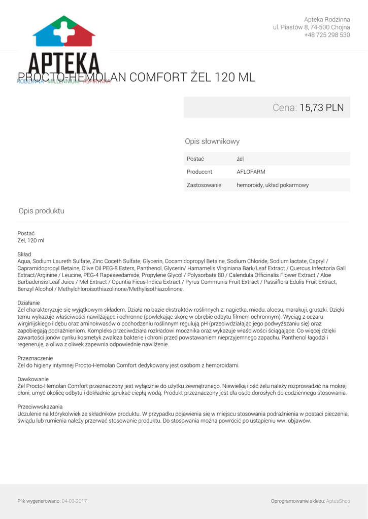 Apteka Rodzinna ul. Piastów 8, 74-500 Chojna +48 725 298 530 PROCTO-HEMOLAN COMFORT ŻEL 120 ML Cena: 15,73 PLN Opis słownikowy Postać żel Producent AFLOFARM Zastosowanie hemoroidy, układ pokarmowy Opis produktu Postać Żel, 120 ml Skład Aqua, Sodium Laureth Sulfate, Zinc Coceth Sulfate, Glycerin, Cocamidopropyl Betaine, Sodium Chloride, Sodium lactate, Capryl / Capramidopropyl Betaine, Olive Oil PEG-8 Esters, Panthenol, Glycerin/ Hamamelis Virginiana Bark/Leaf Extract / Quercus Infectoria Gall Extract/Arginine / Leucine, PEG-4 Rapeseedamide, Propylene Glycol / Polysorbate 80 / Calendula Officinalis Flower Extract / Aloe Barbadensis Leaf Juice / Mel Extract / Opuntia Ficus-lndica Extract / Pyrus Communis Fruit Extract / Passiflora Edulis Fruit Extract, Benzyl Alcohol / Methylchloroisothiazolinone/Methylisothiazolinone. Działanie Żel charakteryzuje się wyjątkowym składem. Działa na bazie ekstraktów roślinnych z: nagietka, miodu, aloesu, marakuji, gruszki. Dzięki temu wykazuje właściwości nawilżające i ochronne (powlekając skórę w obrębie odbytu filmem ochronnym). Wyciąg z oczaru wirginijskiego i dębu oraz aminokwasów o pochodzeniu roślinnym regulują pH (przeciwdziałając jego podwyższaniu się) oraz zapobiegają podrażnieniom. Kompleks przeciwdziała rozkładowi mocznika oraz wykazuje właściwości ściągające. Co więcej dzięki zawartości jonów cynku kosmetyk zwalcza bakterie i chroni przed powstawaniem nieprzyjemnego zapachu. Panthenol łagodzi i regeneruje, a oliwa z oliwek zapewnia odpowiednie nawilżenie. Przeznaczenie Żel do higieny intymnej Procto-Hemolan Comfort dedykowany jest osobom z hemoroidami. Dawkowanie Żel Procto-Hemolan Comfort przeznaczony jest wyłącznie do użytku zewnętrznego. Niewielką ilość żelu należy rozprowadzić na mokrej dłoni, umyć okolicę odbytu i dokładnie spłukać ciepłą wodą. Produkt przeznaczony jest dla osób dorosłych do codziennego stosowania. Przeciwwskazania Uczulenie na którykolwiek ze składników produktu. W przypadku pojawienia się w miejscu stosowania podrażnienia w postaci pieczenia, świądu lub rumienia należy przerwać stosowanie produktu. Do stosowania można powrócić po ustąpieniu ww. objawów. Plik wygenerowano: 04-03-2017 Powered by TCPDF (www.tcpdf.org) Oprogramowanie sklepu: AptusShop