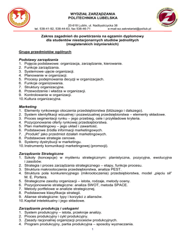 WYDZIAŁ ZARZĄDZANIA POLITECHNIKA LUBELSKA 20-618 Lublin, ul. Nadbystrzycka 38 tel. 538-41-92, 538-44-63, fax 538-46-71 e-mail:[email protected] Zakres zagadnień do powtórzenia na egzamin dyplomowy dla studentów niestacjonarnych studiów jednolitych (magisterskich inŜynierskich) Grupa przedmiotów ogólnych Podstawy zarządzania 1. Pojęcia podstawowe: organizacja, zarządzanie, kierowanie. 2. Funkcje zarządzania. 3. Systemowe ujęcie organizacji. 4. Planowanie w organizacji. 5. Procesy podejmowania decyzji w organizacjach. 6. Funkcje organizowania. 7. Struktury organizacyjne. 8. Przewodzenie i władza w organizacji. 9. Kontrolowanie w organizacji. 10. Kultura organizacyjna. Marketing 1. Elementy rynkowego otoczenia przedsiębiorstwa (bliŜszego i dalszego). 2. System identyfikacji wizualnej i pozawizualnej przedsiębiorstwa – elementy składowe. 3. Proces segmentacji rynku – jego przebieg, cele i przykładowe kryteria. 4. Pozycjonowanie oferty rynkowej przedsiębiorstwa. 5. Plan marketingowy – jego układ i zawartość. 6. Podstawowe źródła informacji marketingowych. 7. „Produkt” jako przedmiot działań marketingowych. 8. Podstawowe strategie cenowe. 9. Systemy dystrybucji w marketingu. 10. Instrumenty komunikacji marketingowej (promocji). Zarządzanie Strategiczne 1. Szkoły (koncepcje) w myśleniu strategicznym: planistyczna, pozycyjna, ewolucyjna i zasobów. 2. Strategia i proces zarządzania strategicznego – etapy, funkcje procesu. 3. Struktura makrootoczenia przedsiębiorstwa, analiza PEST. 4. Struktura pola konkurencyjnego (mikrootoczenia) przedsiębiorstwa, model „pięciu sił” M. E. Portera. 5. Strategiczne zasoby organizacji – istota, rodzaje, metody oceny. 6. Pozycjonowanie strategiczne: analiza SWOT, metoda SPACE. 7. Metody portfelowe w analizie strategicznej. 8. Podstawowe klasyfikacje strategii. 9. Alianse strategiczne: typy i korzyści z aliansów. 10. Kapitał intelektualny i jego składowe. Zarządzanie produkcją i usługami 1. System produkcyjny – istota, przekroje analizy. 2. Proces produkcyjny i cykl produkcyjny. 3. Zasady racjonalnej organizacji procesów produkcyjnych. 4. Program produkcyjny, partia produkcyjna – sposoby wyznaczania. 1 5. Charakterystyka produkcji rytmicznej i nierytmicznej. 6. Etapy projektowania konwencjonalnych systemów produkcyjnych. 7. Japońskie metody i techniki organizacji produkcji. 8. Charakterystyka systemu ESP. 9. Metody MRP. 10. System JIT i technika Kanban. Grupa przedmiotów ekonomiczno-finansowych Makroekonomia 1. Bezrobocie jako zjawisko społeczno-ekonomiczne. 2. Metody pomiaru bezrobocia oraz aktualna wielkość stopy bezrobocia w Polsce i woj. lubelskim. 3. Rodzaje bezrobocia. 4. Pojęcie inflacji oraz rodzaje inflacji. 5. Istota cyklu koniunkturalnego. 6. BudŜet państwa i jego funkcje w gospodarce. 7. Wzrost gospodarczy a rozwój gospodarczy. 8. Pieniądz i jego funkcje. 9. Istota i definicja Produktu Krajowego Brutto (PKB). 10. Istota i definicja Produktu Narodowego Brutto (PNB). Mikroekonomia 1. Rynek i podstawowe prawa nim rządzące. 2. Pozacenowe determinanty popytu i podaŜy. 3. Elastyczność cenowa i dochodowa popytu. 4. Narzędzia analizy ekonomicznej. 5. Optimum konsumenta. 6. Podstawowe kategorie kosztów, utargów i zysków w przedsiębiorstwie z mikroekonomicznego punktu widzenia. 7. Optymalna produkcja i decyzje produkcyjne w przedsiębiorstwie. 8. Korzyści i niekorzyści skali w działalności przedsiębiorstwa. 9. Czynniki wpływające na popyt na pracę, podaŜ pracy oraz wysokość płac w przedsiębiorstwie. 10. Wpływ przedsiębiorstwa na cenę na róŜnych rynkach. Rachunkowość (finansowa i zarządcza) 1. Podstawowe zasady rachunkowości. Typy operacji gospodarczych. Dowody księgowe. 2. Bilans. Charakterystyka aktywów i pasywów. Zasada równowagi bilansowej. 3. Zasady ewidencji kosztów w przedsiębiorstwie, jako element polityki rachunkowości. 4. Zasady wyceny składników majątkowych. 5. Rodzaje, funkcje i koszty zapasów w przedsiębiorstwie. 6. Zasady ustalania zysku/straty ze sprzedaŜy w porównawczym i kalkulacyjnym rachunku zysku i strat. 7. Rachunek kosztów pełnych a rachunek kosztów zmiennych. 8. Próg rentowności i jego wykorzystanie w zarządzaniu firmą. 9. Koszty utracone i koszty utraconych moŜliwości. 10. Zastosowanie rachunku kosztów zmiennych do celów decyzyjnych. Finanse 1. Cele przedsiębiorstw. Kategorie wyniku finansowego. 2. Rentowność sprzedaŜy i rentowność kapitałów własnych. 3. Strategie finansowania majątku obrotowego. 4. Ocena aktywności gospodarczej przedsiębiorstw. 2 5. Wykorzystanie rachunku przepływów pienięŜnych w zarządzaniu przedsiębiorstwem. 6. Koszt kapitału. Punkt obojętności. 7. Pojęcie i znaczenie płynności finansowej. 8. Dźwignie: operacyjna, finansowa i całkowita jako narzędzie planowania finansowego. 9. Ocena opłacalności przedsięwzięć inwestycyjnych. 10. Opodatkowanie przedsiębiorstw. Strategie podatkowe. Grupa pozostałych przedmiotów Zarządzanie kadrami 1. Modele polityki personalnej (model „sita”, model „kapitału ludzkiego”). 2. Rekrutacja i jej podstawowe etapy. 3. Selekcja i przykładowe techniki selekcyjne. 4. Adaptacja w zarządzaniu zasobami ludzkimi. 5. Typy kariery profesjonalnej. 6. Podstawowe teorie motywacji pozafinansowej (Maslow, Herzberg, McGregor i in.). 7. Strategie motywacji finansowej w przedsiębiorstwie. 8. System ocen okresowych – jego cele i znaczenie. Zarządzanie jakością 1. Koncepcja Total Quality Management – istota, znaczenie. 2. System zarządzania jakością – istota, rola norm w tworzeniu SZJ. 3. Koszty zarządzania jakością – istota, podział. 4. Obligatoryjne procedury wymagane normą ISO 9001. 5. Klasyczne narzędzia poprawy jakości. 6. System oceny zgodności – akredytacja, certyfikacja. 7. Struktura dokumentacji systemu zarządzania jakością. 8. 8 kardynalnych zasad TQM w normie ISO 9004. 9. Audity systemów zarządzan