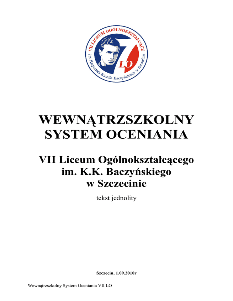 WEWNĄTRZSZKOLNY SYSTEM OCENIANIA VII Liceum Ogólnokształcącego im. K.K. Baczyńskiego w Szczecinie tekst jednolity Szczecin, 1.09.2010r Wewnątrzszkolny System Oceniania VII LO §1 PODSTAWA PRAWNA Dokument zwany Wewnątrzszkolnym Systemem Oceniania opracowano na podstawie następujących aktów prawnych: 1. Rozporządzenie Ministra Edukacji Narodowej i Sportu z dnia 7 września 2004r. w sprawie warunków i sposobu oceniania, klasyfikowania i promowania uczniów i słuchaczy oraz przeprowadzania sprawdzianów i egzaminów w szkołach publicznych. (Dz.U. z 2004r. Nr 199 poz. 2046); (Dz.U. z 2006r. Nr 164, poz. 1155); (Dz.U z 2007r, Nr 83 , poz 562); (Dz U. z 2007 Nr 130, poz. 906 i 907). 2. Statut VII Liceum Ogólnokształcącego im. K.K. Baczyńskiego w Szczecinie. §2 POSTANOWIENIA OGÓLNE 1. Ocenianiu podlegają: a. osiągnięcia edukacyjne ucznia, b. zachowanie ucznia. 2. Ocenianie osiągnięć edukacyjnych i zachowanie ucznia odbywa się w ramach oceniania wewnątrzszkolnego. 3. Ocenianie osiągnięć edukacyjnych ucznia polega na rozpoznaniu przez nauczycieli poziomu wiadomości i umiejętności ucznia oraz na określeniu postępów w zakresie określonym przez podstawę programową i realizowane w szkole wynikające z podstawy programowej programy nauczania. 4. Ocenianie zachowania ucznia polega na rozpoznaniu przez wychowawcę klasy, nauczycieli oraz uczniów danej klasy stopnia respektowania przez ucznia zasad współŜycia społecznego i norm etycznych oraz obowiązków ucznia określonych w Statucie Szkoły. 5. Ocenianie wewnątrzszkolne ma na celu: a. informowanie ucznia o poziomie jego osiągnięć edukacyjnych i jego zachowaniu oraz postępach w tym zakresie, b. udzielanie uczniowi pomocy w samodzielnym planowaniu swojego rozwoju, c. motywowanie ucznia do dalszych postępów w nauce i zachowaniu, d. dostarczanie rodzicom (prawnym opiekunom) informacji o postępach oraz trudnościach w nauce i specjalnych uzdolnieniach ucznia, e. umoŜliwianie nauczycielom doskonalenia organizacji i metod pracy dydaktyczno – wychowawczej. 6. Ocenianie wewnątrzszkolne obejmuje: a. formułowanie przez nauczycieli wymagań edukacyjnych niezbędnych do uzyskania poszczególnych śródrocznych (semestralnych) i rocznych ocen klasyfikacyjnych z obowiązkowych i dodatkowych zajęć edukacyjnych, b. ocenianie bieŜące i ustalanie śródrocznych ocen klasyfikacyjnych z obowiązkowych oraz dodatkowych zajęć edukacyjnych oraz śródrocznej oceny klasyfikacyjnej zachowania według skali i w formach przyjętych w szkole, c. ustalanie śródrocznych i rocznych ocen klasyfikacyjnych z obowiązkowych i dodatkowych zajęć edukacyjnych oraz rocznej oceny klasyfikacyjnej zachowania według skali, o której mowa w § 8, d. przeprowadzanie egzaminów klasyfikacyjnych, Wewnątrzszkolny System Oceniania VII LO 2 e. ustalanie warunków i trybu uzyskania wyŜszej niŜ przewidywana rocznej oceny klasyfikacyjnej z obowiązkowych zajęć edukacyjnych oraz rocznej oceny klasyfikacyjnej zachowania, f. ustalanie kryteriów oceniania zachowania, g. ustalanie warunków i sposobu przekazywania rodzicom (prawnym opiekunom) informacji o postępach i trudnościach ucznia w nauce. 7. Ocena jest informacją, w jakim stopniu uczeń spełnił wymagania programowe postawione przez nauczyciela. Nie jest ona karą ani nagrodą. 8. W wewnątrzszkolnym systemie oceniania przyjęte są następujące zasady: a. zasada częstotliwości i rytmiczności oceniania – uczeń oceniany jest na bieŜąco i rytmicznie a ocena końcowa nie jest średnią arytmetyczną ocen cząstkowych, b. zasada jawności – uczeń i jego rodzice (prawni opiekunowie) znają kryteria oceniania oraz formy pracy podlegające ocenie a uczeń jest informowany o ocenach jakie otrzymał, c. zasada róŜnorodności wynikająca ze specyfiki kaŜdego przedmiotu, d. zasada róŜnicowania wymagań – zadania stawiane uczniom powinny mieć zróŜnicowany poziom trudności i dawać moŜliwość uzyskania wszystkich typów ocen, e. zasada otwartości – wewnątrzszkolny system oceniania podlega weryfikacji i modyfikacji w oparciu o okresową ewaluację. 9. Ocena z religii/ etyki jest liczona do średniej, ale nie ma wpływu na promocję do następnej klasy. 10. Ocena z przedmiotów dodatkowych (określonych w szkolnym planie nauczania) nie jest liczona do średniej i nie wpływa na promocję do następnej klasy. Na świadectwie wpisywana jest w części przedmioty dodatkowe. 11. Uczeń, który został zapisany do klasy, w której był juŜ zrealizowany przedmiot dodatkowy, nie ma obowiązku nadrobienia przerobionego materiału. Na jego świadectwie przedmiot ten nie będzie wpisany. Jeśli jednak uczeń dołączył do klasy w trakcie realizacji przedmiotu dodatkowego, musi zaliczyć zaległą partię materiału w postaci sprawdzianu wiedzy i umiejętności. 12. Obowiązek zaliczenia róŜnic programowych dotyczy równieŜ przedmiotu obowiązkowego, z którego uczeń realizował w poprzedniej klasie bądź szkole program w wymiarze mniejszej liczby godzin. 13. Zaliczenie róŜnic programowych w postaci sprawdzianu, o których mowa w § 2 ust. 11 i 12 następuje na podstawie decyzji Dyrektora szkoły. Termin przystąpienia do sprawdzianu zostaje ustalony w uzgodnieniu z nauczycielem przedmiotu i podany uczniowi na pisemnym zobowiązaniu do zaliczenia róŜnic programowych. 14. JeŜeli uczeń nie przystąpi do sprawdzianu lub nie zaliczy zaległej partii materiału na ocenę pozytywną, to bez względu na oceny cząstkowe otrzymane w trakcie bieŜącej nauki z tego przedmiotu, nie moŜe on uzyskać rocznej oceny wyŜszej niŜ dostateczny. 15. Informacja o przeprowadzonym sprawdzianie wiedzy i umiejętności, nauczyciel ma obowiązek wpisać w dzienniku lekcyjnym w rubryce „inne informacje o uczniu”. §3 WYMAGANIA EDUKACYJNE Wymagania ogólne 1. Nauczyciele na początku kaŜdego roku szkolnego do 15 września informują uczniów o: Wewnątrzszkolny System Oceniania 