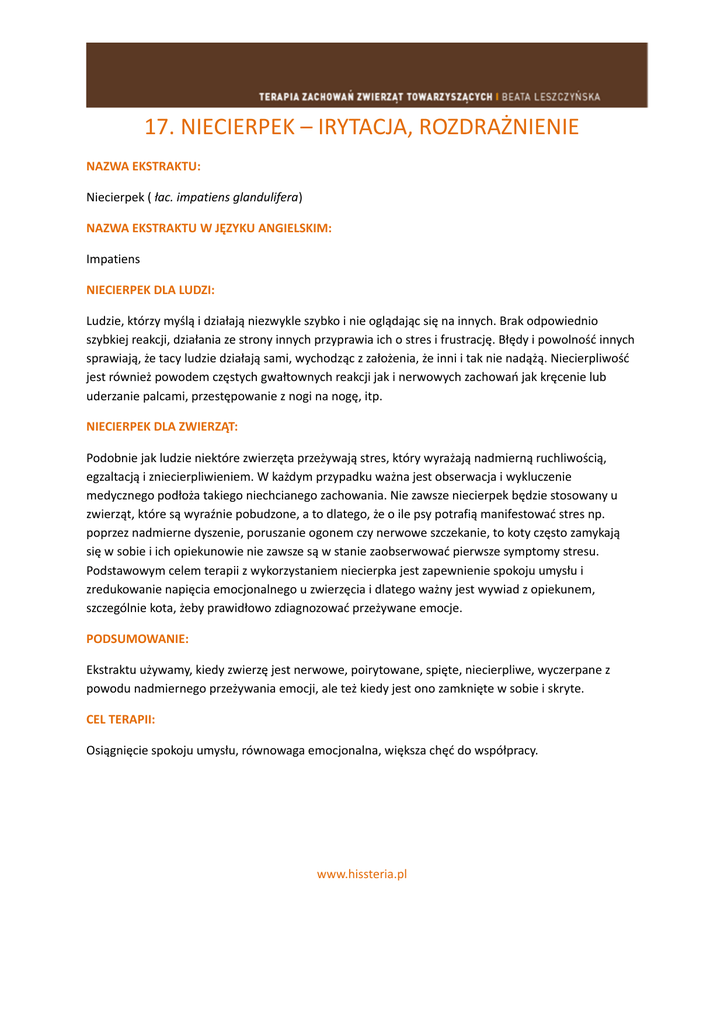 17. NIECIERPEK – IRYTACJA, ROZDRAŻNIENIE NAZWA EKSTRAKTU: Niecierpek ( łac. impatiens glandulifera) NAZWA EKSTRAKTU W JĘZYKU ANGIELSKIM: Impatiens NIECIERPEK DLA LUDZI: Ludzie, którzy myślą i działają niezwykle szybko i nie oglądając się na innych. Brak odpowiednio szybkiej reakcji, działania ze strony innych przyprawia ich o stres i frustrację. Błędy i powolność innych sprawiają, że tacy ludzie działają sami, wychodząc z założenia, że inni i tak nie nadążą. Niecierpliwość jest również powodem częstych gwałtownych reakcji jak i nerwowych zachowań jak kręcenie lub uderzanie palcami, przestępowanie z nogi na nogę, itp. NIECIERPEK DLA ZWIERZĄT: Podobnie jak ludzie niektóre zwierzęta przeżywają stres, który wyrażają nadmierną ruchliwością, egzaltacją i zniecierpliwieniem. W każdym przypadku ważna jest obserwacja i wykluczenie medycznego podłoża takiego niechcianego zachowania. Nie zawsze niecierpek będzie stosowany u zwierząt, które są wyraźnie pobudzone, a to dlatego, że o ile psy potrafią manifestować stres np. poprzez nadmierne dyszenie, poruszanie ogonem czy nerwowe szczekanie, to koty często zamykają się w sobie i ich opiekunowie nie zawsze są w stanie zaobserwować pierwsze symptomy stresu. Podstawowym celem terapii z wykorzystaniem niecierpka jest zapewnienie spokoju umysłu i zredukowanie napięcia emocjonalnego u zwierzęcia i dlatego ważny jest wywiad z opiekunem, szczególnie kota, żeby prawidłowo zdiagnozować przeżywane emocje. PODSUMOWANIE: Ekstraktu używamy, kiedy zwierzę jest nerwowe, poirytowane, spięte, niecierpliwe, wyczerpane z powodu nadmiernego przeżywania emocji, ale też kiedy jest ono zamknięte w sobie i skryte. CEL TERAPII: Osiągnięcie spokoju umysłu, równowaga emocjonalna, większa chęć do współpracy. www.hissteria.pl