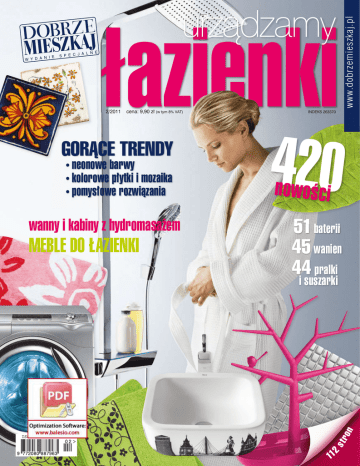 www.dobrzemieszkaj.pl • neonowe barwy • kolorowe pytki i mozaika • pomysowe rozwizania wanny i kabiny z hydromasaem MEBLE DO AZIENKI 420 nowoci 51 baterii 45 wanien 44 pralki i suszarki on GORCE TRENDY INDEKS 263370 str cena: 9,90 z (w tym 8% VAT) 11 2 2/2011 9 6 7 10 3.100 z/ 10. ok. Hoke jednouchwytowa bateria cienna do umywalki, z mieszaczem i mocowaniem podtynkowym, jednopunktowym, czny zasig armatury 230 mm, polerowany chrom Dornbracht bateria stojca, jednouchwytowa, jednootworowa, staa wylewka bez zamknicia odpywu NEXE/Perfexim 7. ok. Topaz 2.040 z/ bateria trójotworowa, wyposaona w perlator, spust automatyczny, ekologiczny przepyw wody i gowic ceramiczn, wykoczenie: chrom Graff 3.000 z/ 8. Gentle bateria cienna z mieszaczem i pojedynczymi rozetami, do montau podtynkowego, zasig 205 mm, polerowany chrom Dornbracht 564 z/ 9. ok. Objekta Mix New jednouchwytowa bateria DN 10, uchwyt prosty, monta jednootworowy, perlator s-pointer Eco M 24x1, gowica ceramiczna z ogranicznikiem wypywu gorcej wody, powierzchnia – chrom Kludi 11. ok. O-cean 11 307 z/ 6. Tara Logic 8 509 z/ jednouchwytowa bateria DN 10, uchwyt prosty, monta jednootworowy, klasa przepywu Z, perlator s-pointer Eco M 24 x 1, gowica ceramiczna z ogranicznikiem wypywu gorcej wody, powierzchnia – chrom Kludi 12 11.950 z/ 12. ok. Poèmes elegancka bateria z kolekcji Chantal Thomass, wykoczona w chromie, ze stylizowanymi pokrtami z marmuru THG/Art De Vivre 2.297 z/ 13. ok. Axor Bouroullec 2-otworowa bateria 195 mm, mieszacz ceramiczny, ogranicznik przepywu 5 l/min., komplet odpywowy G1¼ z korkiem i cigem Axor/Hansgrohe 13 urzdzamy 2011 /azienki 77 6.500 z wanna asymetryczna (proj. Marcin Jdrzak) z systemem hydromasa&u Hydro&Air Exclusive: 6 dysz bocznych kierunkowych, 4 dysze ma(e na plecy, 2 dysze ma(e na stopy, 10 dysz powietrznych; elektron. uk(ad sterowania; pó(automat. dezynfekcja; przep(ywowy podgrzewacz wody; wiat(o LED – bia(e Laminex m i s j a s p e c j a l n a wanny z hydromasaem B2A ok. 52.350 Inside nowoczesna, wolno stojca wanna w kszta(cie elipsy z hydromasa&em, 190x235x70 cm, kolory: bia(y i chrom, cyfrowy system kontroli do dezynfekcji i zdalnego sterowania, odtwarzacz MP3 Treesse/Art de Vivre od 1.905 z (wanna), 9.500 z (system hydromasa&u) Gentiana wanna naro&na 140x140 cm, 150x150 cm, dostpna równie& w wersji PU Plus; system hydromasa&u Extraflat Plus Whisper: 4 dysze Midi Extra Flat na bokach wanny, 4 dysze Micro Extra Flat na plecy i 2 dysze Micro Extra Flat na nogi, sterowanie elektron., masa& pulsacyjny Ravak 15.000 z Compact Spa 25.707 z Pro wanna z masa&em wodno-powietrznym, wym. 190x90 cm, poj. 260 l, funkcja podtrzymywania temp. wody, owietlenie Laufen urzdzamy 60 azienki 2011 z wanna mobilna, pe(nica funkcj domowego SPA, 193x117,5x72 cm, poj. 615 l; 2 miejsca + le&anka; system hydromasa&u Balboa: 4 dysze rotujce pin spin na plecy, 2 dysze kierunkowe rotujce na plecy, 2 podwójne dysze rotujce na plecy, 6 dysz kierunkowych na uda i (ydki, 6 dysz na stopy; panel kontrolny: 4 przyciski Laminex