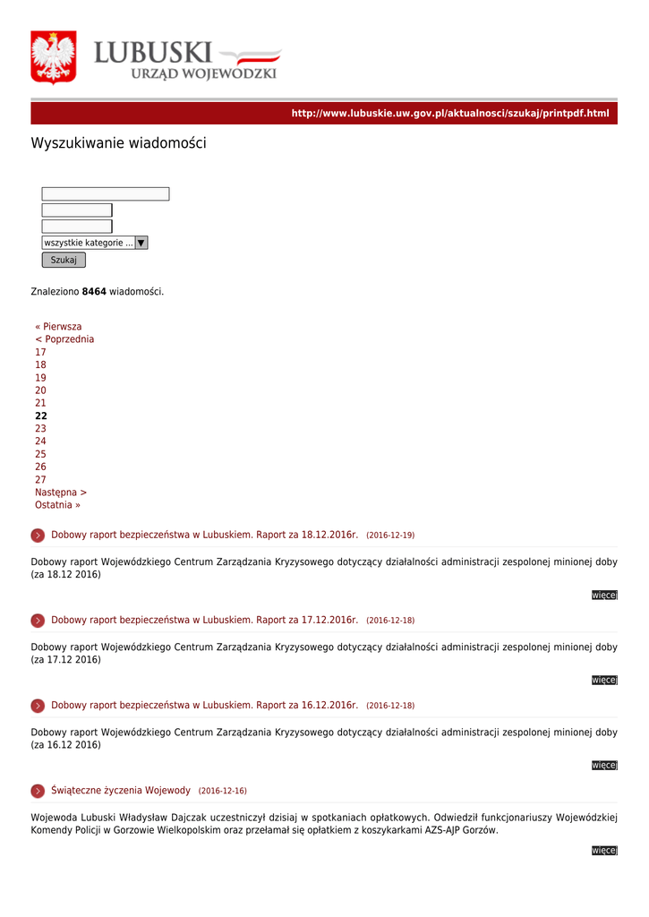 http://www.lubuskie.uw.gov.pl/aktualnosci/szukaj/printpdf.html Wyszukiwanie wiadomości wszystkie kategorie ... ▼ Szukaj Znaleziono 8464 wiadomości. « Pierwsza < Poprzednia 17 18 19 20 21 22 23 24 25 26 27 Następna > Ostatnia » Dobowy raport bezpieczeństwa w Lubuskiem. Raport za 18.12.2016r. (2016-12-19) Dobowy raport Wojewódzkiego Centrum Zarządzania Kryzysowego dotyczący działalności administracji zespolonej minionej doby (za 18.12 2016) więcej Dobowy raport bezpieczeństwa w Lubuskiem. Raport za 17.12.2016r. (2016-12-18) Dobowy raport Wojewódzkiego Centrum Zarządzania Kryzysowego dotyczący działalności administracji zespolonej minionej doby (za 17.12 2016) więcej Dobowy raport bezpieczeństwa w Lubuskiem. Raport za 16.12.2016r. (2016-12-18) Dobowy raport Wojewódzkiego Centrum Zarządzania Kryzysowego dotyczący działalności administracji zespolonej minionej doby (za 16.12 2016) więcej Świąteczne życzenia Wojewody (2016-12-16) Wojewoda Lubuski Władysław Dajczak uczestniczył dzisiaj w spotkaniach opłatkowych. Odwiedził funkcjonariuszy Wojewódzkiej Komendy Policji w Gorzowie Wielkopolskim oraz przełamał się opłatkiem z koszykarkami AZS-AJP Gorzów. więcej Bieżące utrzymanie dróg wojewódzkich (2016-12-16) Zarząd Dróg Wojewódzkich otrzymał w 2016 roku od Wojewody Lubuskiego kwotę 26.258.239,00 zł na dofinansowanie zadań z zakresu budowy, przebudowy, remontu, utrzymania, ochrony dróg wojewódzkich i zarządzania tymi drogami. Są to wszystkie środki, jakie zostały przewidziane w budżecie państwa dla województwa lubuskiego w 2016 roku. więcej Finansowanie wydawania zaświadczeń ADR (2016-12-16) Na pokrycie kosztów związanych z wydawaniem zaświadczeń ADR oraz wtórników tych zaświadczeń Wojewoda Lubuski przekazał 92 tys. złotych t.j. całą kwotę środków przewidzianych w budżecie państwa na ten cel dla województwa lubuskiego w 2016 roku. więcej Dopłaty do sprzedanych biletów ulgowych (2016-12-16) Od początku 2016 roku Wojewoda Lubuski przekazał Samorządowi Województwa Lubuskiego kwotę 20.091.601,66 zł tytułem dopłat do sprzedanych biletów ulgowych. Środki te trafiły do 24 przewoźników realizujących pasażerskie usługi transportowe na terenie województwa lubuskiego. więcej Nieodpłatna Pomoc Prawna 2017 (2016-12-16) W dniu 15 stycznia 2017 r. upływa termin przekazania przez starostów powiatów oraz prezydentów miast na prawach powiatu woj. lubuskiego, informacji na temat liczby porad prawnych udzielonych w IV kwartale 2016 r. w ramach realizacji ustawy z dnia 5 sierpnia 2015 r. o nieodpłatnej pomocy prawnej i edukacji prawnej (Dz.U. z 2015 r., poz. 1255). więcej Wszystkie środki na wypłatę świadczeń dla rodzin przekazane! (2016-12-16) W dniu 16 grudnia br. Wojewoda Lubuski przekazał do gmin ostatnią transzę środków na wypłaty świadczeń wychowawczych, rodzinnych i alimentacyjnych. Dotacje zostały przekazane wcześniej niż gminy pierwotnie planowały wypłatę. więcej Lepsze prawo dla organizacji pozarządowych (2016-12-16) Wczoraj, odbyło się spotkanie przedstawicieli organizacji pozarządowych z Lubuskiego ekspertami z KPRM dotyczące projektu ustawy o Narodowym Centrum Rozwoju Społeczeństwa Obywatelskiego . więcej « Pierwsza < Poprzednia 17 18 19 20 21 22 23 24 25 26 27 Następna > Ostatnia »