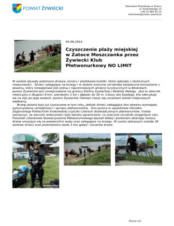 Starostwo Powiatowe w Żywcu ul. Krasińskiego 13 +48 33 860 50 23 [email protected] 04.06.2014 Czyszczenie plaży miejskiej w Zatoce Moszczanka przez Żywiecki Klub Płetwonurkowy NO LIMIT W wodzie pływały połamane drzewa, konary i plastikowe butelki, które spłynęły z okolicznych miejscowości. Śmieci zalegające na brzegu i w wodzie znacznie utrudniały bezpieczne korzystanie z akwenu, który niewątpliwie jest jedną z najcenniejszych atrakcji turystycznych w Beskidach. Jezioro Żywieckie jest umiejscowione na granicy Kotliny Żywieckiej i Beskidy Małego. Jest to zbiornik retencyjny o długości 8 km, szerokości 2 km i głęboki do 20 m. Cieszy oko każdego, kto zdecyduje się na rejs po jego wodach. Jezioro Żywieckie również cieszy się uznaniem wśród miejscowych wędkarzy. Brzegi jeziora były już czyszczone w tym roku, jednak śmieci zalegające dno akwenu wymagały wykorzystania umiejętności i sprzętu płetwonurków. Dno jeziora w sąsiedztwie Ośrodka Żeglarskiego Politechniki Krakowskiej czyściło czterech doświadczonych płetwonurków, trzeba zaznaczyć, że warunki widoczności były bardzo ograniczone, co znacznie utrudniło osiągnięcie celu. Pozostali członkowie Stowarzyszenia Płetwonurkowego pływali łódką i pontonem zbierając konary drzew unoszące się na powierzchni wody oraz zalegające na brzegu. W sumie zebranych zostało 30 worków śmieci oraz przeniesiono około 3 ton gałęzi i konarów drzew. Strona 1/2 Starostwo Powiatowe w Żywcu ul. Krasińskiego 13 +48 33 860 50 23 [email protected] Strona 2/2 Powered by TCPDF (www.tcpdf.org)