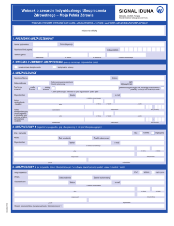 Wniosek o zawarcie Indywidualnego Ubezpieczenia Zdrowotnego – Moja Pełnia Zdrowia WNIOSEK PROSIMY WYPEŁNIĆ CZYTELNIE, DRUKOWANYMI LITERAMI, CZARNYM LUB NIEBIESKIM DŁUGOPISEM miejsce na naklejkę 1. POŚREDNIK UBEZPIECZENIOWY Oddział/Agencja Numer pośrednika: Nazwisko i imię agenta Nr RAU OWCA Telefon agenta nr kierunkowy nr telefonu nr wewnętrzny nr telefonu komórkowego 2. WNIOSEK O ZAWARCIE UBEZPIECZENIA (proszę zaznaczyć odpowiednie pole) nowa umowa ubezpieczenia kontynuacja umowy 3. UBEZPIECZAJĄCY Nazwisko/Nazwa Imiona Typ formy prawnej NIP/ REGON/PESEL Rodzaj wykonywanej działalności /Zawód wykonywany Data urodzenia osoba fizyczna osoba prawna* jednostka organizacyjna nie posiadająca osobowości prawnej, fundacja lub stowarzyszenie * jeżeli spółka akcyjna notowana na rynku regulowanym - podać gdzie Obywatelstwo e-mail Telefon nr telefonu komórkowego Adres zamieszkania /siedziby nr domu ulica Adres korespondencyjny nr lokalu kod pocztowy miejscowość województwo (proszę wypełnić w przypadku, gdy jest inny niż adres zamieszkania /siedziby) poczta ulica nr domu nr lokalu poczta kod pocztowy miejscowość województwo 4. UBEZPIECZONY 1 (wypełnić w przypadku, gdy Ubezpieczony 1 nie jest Ubezpieczającym) Płeć Imię i nazwisko PESEL Data urodzenia Obywatelstwo kobieta mężczyzna Zawód wykonywany e-mail Telefon nr telefonu komórkowego nr domu ulica nr lokalu kod pocztowy miejscowość województwo poczta 5. UBEZPIECZONY 2 (w przypadku dzieci Ubezpieczonego 1 w rubryce zawód prosimy podać: uczeń / student / inne) Płeć Imię i nazwisko PESEL Data urodzenia Obywatelstwo kobieta mężczyzna Zawód wykonywany e-mail Telefon nr telefonu komórkowego nr domu ulica kod pocztowy SIR 0354/??.17 miejscowość poczta Stopień pokrewieństwa (powinowactwa) z Ubezpieczonym 1 nr lokalu województwo 6. UBEZPIECZONY 3 (w przypadku dzieci Ubezpieczonego 1 w rubryce zawód prosimy podać: uczeń/ student/ inne) kobieta Płeć Imię i nazwisko PESEL Data urodzenia Obywatelstwo mężczyzna Zawód wykonywany e-mail Telefon nr telefonu komórkowego nr domu ulica nr lokalu kod pocztowy miejscowość województwo poczta Stopień pokrewieństwa (powinowactwa) z Ubezpieczonym 1 7. WNIOSKOWANY ZAKRES OCHRONY I SKŁADKI (proszę zaznaczyć wybrany zakres ochrony znakiem X we właściwym polu) Produkt Składka (zgodnie z wybranym wariantem płatności, bez uwzględnienia rabatu*) Ubezpieczony 1 Srebrny Srebrny+ Złoty Platynowy Ubezpieczony 2 Srebrny Srebrny+ Złoty Platynowy Ubezpieczony 3 Srebrny Srebrny+ Złoty Platynowy Składka miesięczna 49 PLN 68 PLN 112 PLN 156 PLN Suma *W przypadku płatności rocznych, półrocznych i kwartalnych przysługuje zniżka w wysokości odpowiednio 4%, 2% i 1%. 8. WARIANT PŁATNOŚCI I KWOTA SKŁADKI DO ZAPŁATY (proszę zaznaczyć wybrany wariant płatności znakiem X we właściwym polu) Miesięczny Kwartalny Półroczny Składka do zapłaty: Roczny Wnioskowana data rozpoczęcia ochrony ubezpieczeniowej: D D M M R R R R W przypadku wyboru wariantu płatności innego niż miesięczny, składka może różnić się o +/- 1,00 PLN od składki wskazanej na polisie. 9. OŚWIADCZENIA Oświadczam, że: 1. Oświadczam, że w ciągu ostatnich 5 lat mój wniosek o przystąpienie/ odnowienie ubezpieczenia nie został odrzucony przez żadne towarzystwo ubezpieczeniowe.* 2. Wszystkie dane zawarte w tym wniosku są prawdziwe i zgodne z moją najlepszą wiedzą. Jestem świadomy(a), że podanie informacji niezgodnych z prawdą lub zatajenie informacji stanowi naruszenie umowy ubezpieczenia i może skutkować brakiem odpowiedzialności SIGNAL IDUNA Polska Towarzystwo Ubezpieczeń S.A. 3. O świadczam, że doręczone mi zostały Ogólne Warunki Ubezpieczenia, Warunki Produktu oraz Katalog Świadczeń Gwarantowanych obowiązujące w dniu zawarcia umowy i zapoznałem(am) się z ich treścią. Zapoznałem(am) się również z treścią i zakresem pełnomocnictwa wystawionego przez SIGNAL IDUNA Polska TU S.A. pośrednikowi ubezpieczeniowemu, który przyjął wniosek. Wyrażam zgodę na przekazanie informacji o zawarciu umowy ubezpieczenia do placówek medycznych SIGNAL IDUNA Polska Towarzystwo Ubezpieczeń S.A. 4. W yrażam zgodę na występowanie w trybie przepisów art. 38 ust. 1-9 ustawy z dnia 11 września 2015 r. o działalności ubezpieczeniowej i reasekuracyjnej przez SIGNAL IDUNA Polska Towarzystwo Ubezpieczeń S.A. do podmiotów wykonujących działalność leczniczą w rozumieniu przepisów o działalności leczniczej, tudzież do innych zakładów ubezpieczeń, z pytaniami i prośbami dotyczącymi okoliczności wymienionych w powołanych przepisach ustawy o działalności ubezpieczeniowej i reasekuracyjnej (w szczególności mojego stanu zdrowia i udzielonych mi usług zdrowotnych, z wyłączeniem wyników badań genetycznych), w celach związanych z oceną ryzyka ubezpieczeniowego i weryfikacją podanych przeze mnie danych oraz ustaleniem prawa do świadczenia z zawartej umowy ubezpieczenia i wysokością tego świadczenia. Ponadto zgadzam się na występowanie do Narodowego Funduszu Zdrowia o informacje w zakresie świadczeniodawców (nazwa i adres), którzy udzielili mi świadczeń opieki zdrowotnej w związku z wypadkiem lub zdarzeniem losowym.* 5. Upoważniam personel medyczny, w tym każdego lekarza, grupową praktykę lekarską, a także każdą placówkę służby zdrowia, które posiadają o mnie informacje do ujawnienia ich treści SIGNAL IDUNA Polska Towarzystwo Ubezpieczeń S.A. oraz jego reasekuratorom, a w szczególności każdej informacji o moim stanie zdrowia, w zakresie niezbędnym do przeprowadzenia oceny ryzyka ubezpieczeniowego lub ustalenia odpowiedzialności z tytułu umowy ubezpieczenia zawartej na podstawie niniejszego wniosku oraz wyrażam zgodę na występowanie przez SIGNAL IDUNA Polska Towarzystwo Ubezpieczeń S.A. o powyższe informacje w tym o kserokopię dokumentacji medycznej do ww. podmiotów.* 6. Wyrażam zgodę na 