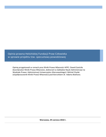 Opinia prawna Helsińskiej Fundacji Praw Człowieka w sprawie projektu tzw. specustawy powodziowej Opinię przygotowali w ramach prac Kliniki Prawa Własności HFPC: Dawid Sześciło (koordynator Kliniki Prawa Własności, doktorant w Zakładzie Nauki Administracji na Wydziale Prawa i Administracji Uniwersytetu Warszawskiego) i Michał Chylak (współpracownik Kliniki Prawa Własności) pod kierunkiem dr. Adama Bodnara. Warszawa, 29 czerwca 2010 r. OPINIA PRAWNA HFPC W SPRAWIE PROJEKTU SPECUSTAWY POWODZIOWEJ 2 Spis treści 1. Wstęp ‐ geneza powstania projektu ustawy o szczególnych zasadach przygotowania do realizacji inwestycji w zakresie budowli przeciwpowodziowych................................................ 4 2. Specustawa jako sposób przygotowania i realizacji inwestycji publicznych a zagrożenia dla praw jednostki .............................................................................................................................. 6 2.1. Koncepcja specustawy w polskim systemie prawnym....................................................................6 2.2. Jakie korzyści płyną ze specustaw dla państwa? .............................................................................9 2.3. Charakterystyka mechanizmu specustaw w ogólności ...................................................................9 2.4. Zagrożenia dla praw jednostki ‐ zarzuty podnoszone w doktrynie i orzecznictwie ................ 11 3. Projekt ustawy o szczególnych zasadach przygotowania do realizacji inwestycji w zakresie budowli przeciwpowodziowych na tle obowiązujących specustaw........................ 16 3.1. Charakterystyka mechanizmu opisanego w projekcie................................................................ 16 3.1.1. Proces inwestycyjno‐budowlany............................................................................................................ 16 3.1.2. Zasady nabywania nieruchomości w związku z realizacją inwestycji i zasady przyznawania odszkodowań ............................................................................................................................................................ 21 3.2. Projekt specustawy przeciwpowodziowej a obowiązujące specustawy – podobieństwa i różnice. ........................................................................................................................................................ 22 3.3. Zagrożenia dla praw jednostki, które mogą się pojawić w związku z wejściem ustawy w życie ....................................................................................................................................................................... 24 4. Ocena procesu legislacyjnego specustawy powodziowej..................................................... 27 2 OPINIA PRAWNA HFPC W SPRAWIE PROJEKTU SPECUSTAWY POWODZIOWEJ 3 KONKLUZJE OPINII W ocenie Helsińskiej Fundacji Praw Człowieka, projekt specustawy powodziowej w kształcie przedstawionym przez Marszałka Sejmu wykonującego obowiązki Prezydenta RP nie powinien być przedmiotem dalszej procedury legislacyjnej. Za takim stanowiskiem przemawiają następujące argumenty: • oparcie rozwiązań przewidzianych w specustawie powodziowej na mechanizmach już obowiązujących specustaw (szczególnie specustawy drogowej), co do których istnieją poważne i uzasadnione zarzuty naruszania podstawowych, konstytucyjnych i prawnomiędzynarodowych standardów ochrony własności. Dotyczą one przede wszystkim sposobu ustalania i zasad wypłacania odszkodowań z tytułu zajęcia prywatnych nieruchomości na cele publiczne. • brak wyraźnego uzasadnienia dla wprowadzenia nadzwyczajnych mechanizmów nabywania prywatnych nieruchomości pod inwestycje przeciwpowodziowe, co kłóci się z konstytucyjną zasadą proporcjonalności ograniczeń praw i wolności jednostki. Przedstawiony projekt nie zawiera jednoznacznych argumentów i szczegółowych danych, które wskazywałyby na nieskuteczność istniejących instrumentów prawnych i przekonywały, że wprowadzenie specregulacji nie jest uzasadnione wyłącznie zamiarem zapewnienia administracji publicznej większej swobody działania kosztem praw i wolności jednostki. Obawiamy się, że kolejna specregulacja ma wyłącznie maskować niewydolność administracji, skoro nie przedstawiono dokładnych danych pokazujących, że inwestycje przeciwpowodziowe w Polsce są blokowane przez przepisy wywłaszczeniowe, a nie np. brak odpowiedniego finansowania, niesprawność administracji wodnej czy brak jasnej strategii przeciwpowodziowej państwa. • przyjęta formuła prezentacji projektu i sposób prowadzenia procesu legislacyjnego. Istnieje niejasność co do „pochodzenia” projektu przedstawionego przez Marszałka Sejmu. Można domniemywać, że jest on oparty na projekcie opracowywanym przez Ministerstwo Środowiska. Nie wiadomo jednak, jaka relacja łączy oba projekty. Ponadto, co wydaje się jeszcze bardziej niepokojące, przedłożenie projektu jako tzw. projektu prezydenckiego, zdaje się być formą pójścia „na skróty”. Jednocześnie uznajemy za konieczne szerokie przyjrzenie się już obowiązującym specustawom w zakresie, w jakim regulują one proces nabywania prywatnych nieruchomości na potrzeby inwestycji celu publicznego. Uważamy za konieczne poddanie przewidzianych tam mechanizmów wywłaszczeniowych kontroli konstytucyjności. Wyrażamy nadzieję, iż stosowny wniosek do Trybunału Konstytucyjnego zostanie złożony przez Rzecznika Praw Obywatelskich jako podmiot konstytucyjnie umocowany i zobowiązany do podejmowania takich działań. Do czasu zbadania zgodności z Konstytucją mechanizmów przewidzianych w specustawach (w szczególności drogowej) zwracamy się do organów władzy publicznej o niepodejmowanie inicjatyw legislacyjnych powielających kontrowersyjne rozwiązania prawne i rozszerzające zakres ich oddziaływania. 3 OPINIA PRAWNA HFPC W SPRAWIE PR