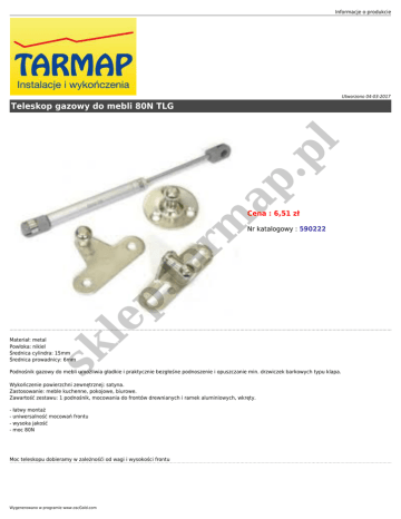 Informacje o produkcie Utworzono 04-03-2017 Cena : 6,51 zł Nr katalogowy : 590222 le p .t a rm ap .p l Teleskop gazowy do mebli 80N TLG sk Materiał: metal Powłoka: nikiel Średnica cylindra: 15mm Średnica prowadnicy: 6mm Podnośnik gazowy do mebli umożliwia gładkie i praktycznie bezgłośne podnoszenie i opuszczanie min. drzwiczek barkowych typu klapa. Wykończenie powierzchni zewnętrznej: satyna. Zastosowanie: meble kuchenne, pokojowe, biurowe. Zawartość zestawu: 1 podnośnik, mocowania do frontów drewnianych i ramek aluminiowych, wkręty. - łatwy montaż - uniwersalność mocowań frontu - wysoka jakość - moc 80N Moc teleskopu dobieramy w zależnośći od wagi i wysokości frontu Wygenerowano w programie www.oscGold.com
