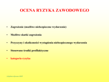 OCENA RYZYKA ZAWODOWEGO • Zagrożenie (możliwe niebezpieczne wydarzenie) • Możliwe skutki zagrożenia • Przyczyny i okoliczności wystąpienia niebezpiecznego wydarzenia • Stosowane środki profilaktyczne • kategoria ryzyka Szkolenie okresowe BHP ZAGROŻENIE: MONITOR EKRANOWY Możliwe skutki zagrożenia: obciążenie narządu wzroku, choroby narządu wzroku, zużycie wzroku, Przyczyny i okoliczności wystąpienia niebezpiecznego wydarzenia: niewłaściwe oświetlenie przekraczanie dopuszczalnego czasu pracy przy komputerze nie stosowanie przerw zły kąt widzenie nieczytelne znaki na ekranie nie przestrzeganie przepisów BHP nie przestrzeganie instrukcji stanowiskowej BHP Stosowane środki profilaktyczne: stosowanie odpowiedniego sprzętu komputerowego właściwe oświetlenie właściwe ustawienie stanowiska pracy szkolenie BHP instrukcja obsługi monitora ekranowego przerwy na odpoczynek badania lekarskie Kategoria ryzyka: Szkolenie okresowe BHP ZAGROŻENIE: PORAŻENIE PRĄDEM ELEKTRYCZNYM Możliwe skutki zagrożenia: poparzenia różnego stopnia, utrata przytomności, zatrzymanie akcji serca, zaburzenia oddychania, śmierć, szok Przyczyny i okoliczności wystąpienia niebezpiecznego wydarzenia: przecięcie przewodu elektrycznego zasilania ubytki, zniszczenie izolacji przewodu zły stan techniczny gniazda, wtyczek zwarcie instalacji elektrycznej, przebicie na masie Stosowane środki profilaktyczne: okresowe badania instalacji elektrycznej szkolenie BHP szkolenie przeciwpożarowe badania lekarskie zewnętrzne oględziny stanu instalacji elektrycznej i urządzeń Kategoria ryzyka: Szkolenie okresowe BHP ZAGROŻENIE: POŚLIZGNIĘCIE SIĘ, POTKNIĘCIE, UPADEK (NIERÓWNE POWIERZCHNIE) Możliwe skutki zagrożenia: złamanie kończyn górnych, dolnych, potłuczenie Przyczyny i okoliczności wystąpienia niebezpiecznego wydarzenia: nierówności podłogi zła widoczność podczas przemieszczania się po zakładzie śliskie podłogi pośpiech, zmęczenie, nieuwaga Stosowane środki profilaktyczne: odpowiednie obuwie zachowanie ostrożności szkolenie BHP badania lekarskie prawidłowe oświetlenie zewnętrzne oględziny stanu instalacji elektrycznej i urządzeń Kategoria ryzyka: Szkolenie okresowe BHP ZAGROŻENIE: POŻAR Możliwe skutki zagrożenia: poparzenia różnego stopnia, zaczadzenie, utrata przytomności, zaburzenia oddychania, szok popożarowy, śmierć Przyczyny i okoliczności wystąpienia niebezpiecznego wydarzenia: zaprószenie ognia zwarcia instalacji elektrycznej nieprzestrzeganie przepisów przeciwpożarowych i BHP niestosowanie znaków ochrony ppoż i wymagań ppoż brak legalizacji podręcznego sprzętu gaśniczego Stosowane środki profilaktyczne: szkolenie ppoż szkolenie BHP sprawny podręczny sprzęt gaśniczy zachowanie ostrożności badania instalacji elektrycznej przeglądy techniczne urządzeń stosowanie przepisów z zakresu ochrony przeciwpożarowej Kategoria ryzyka: Szkolenie okresowe BHP