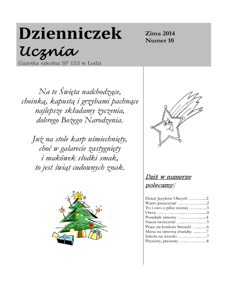 Dzienniczek Ucznia Zima 2014 Numer 10 Gazetka szkolna SP 153 w Łodzi Na te Święta nadchodzące, choinką, kapustą i grzybami pachnące najlepsze składamy życzenia, dobrego Bożego Narodzenia. Już na stole karp uśmiechnięty, choć w galarecie zastygnięty i makówek słodki smak, to jest świąt cudownych znak. Dziś w numerze polecamy: Dzień Języków Obcych ………....2 Warto przeczytać ………….…....2 To i owo o piłce nożnej …….... ...3 Owca ……….……....………........4 Poradnik zimowy …..………........4 Nasza twórczość …...………....…5 Prace na konkurs literacki …...….6 Menu na zimową chandrę ......…..7 Szkoła na wesoło …………....…..7 Prezenty, prezenty …...……….…8 Dzienniczek Ucznia, numer 10, zima 2014 Dzień języków obcych Europejski Dzień Języków obchodzony jest 26 września. W tym roku nasza szkoła przyłączyła się do jego obchodów. Nasi nauczyciele zaproponowali, żebyśmy z okazji Dnia Języków Obcych, wybudujemy własną wieżę Babel. Miała ona symbolizować to, że każdy kraj ma swój język i swoją kulturę, którą należy szanować. Budowę –a właściwie przygotowania do niej – rozpoczęliśmy już 19 wrześni –tydzień przed świętem. Na godzinach wychowawczych klasy okleiły ogromne, gumowe klocki – symbolizujące cegły z których miała być zbudowana wieża – wyrazami i zdaniami w różnych językach. Nasza klasa wylosowała język francuski. Nasze „cegły” pokryły się wyrażeniami i zdaniami w tym języku.. 26 września w naszej szkole odbył się uroczysty apel który uczcił Europejski Dzień Języków. Późnie wspólnie zaczęliśmy budować wieżę. Podczas budowania każda klasa dopingowała budowniczych we własnym języku. Jedna klasa po francusku, inna po niemiecku, a jeszcze inna po hiszpańsku. Gdzieś wśród tych języków słychać było język polski. A wieża rosła i rosła… Na koniec była piosenka zaśpiewana przez koleżanki z VI b. Nasza szkoła brała również udział w konkursie na najlepszy film z obchodów Europejskiego Dnia Języków. Dlatego przez cały czas Warto przeczytać Ostatnio zafascynowały mnie książki o niezwykłych przygodach pewnego chłopca. „Złodziej Pioruna”, z serii „Percy Jackson i Bogowie Olimpijscy” autorstwa Ricka Riordana, jest pierwszym tomem niesamowitych, bestsellerowych powieści opowiadających o nastolatku, który w przypadkowy sposób dowiaduje się, że jest półbogiem, synem Posejdona. Akcja rozgrywa się na pograniczu świata mitologicznego i realnego, przeplatając je na przemian. Poznanie świata równoległego rozpoczyna się od wycieczki szkolnej na nowojorski Manhattan do muzeum starożytności. Nauczycielka matematyki - pani Dodds prosi Percy’ego o rozmowę na osobności . Wtedy Percy dowiaduje się , że jest posądzony o kradzież czegoś ważnego i pani Dodds nagle zmienia się w „pomarszczoną wiedźmę ze skrzydłami nietoperza, pazurami i pyskiem pełnych żółtych zębów….” 2|S tr o na Powieść ta nadaje się dla osób, które cenią dobre książki typu fantasy i science fiction, lubiących fantazjować, gdzie wartka akcja i ciekawy humor sprawią, że czytelnik nie będzie mógł się od niej oderwać. To pierwszy etap do sięgnięcia po następne części… gdzie wszystko jest możliwe… Jeśli spodoba się Wam historia o Percym, może przeczytacie inne książki tego autora: "Morze potworów", " Klątwa Tytana", "Bitwa w Labiryncie" czy "Kroniki Rodu Kane". Na podstawie opowieści o Percym Jacksonie zrealizowano dwa filmy: "Percy Jackson i bogowie olimpijscy. Złodziej pioruna" oraz "Percy Jackson. Morze potworów". Przyjemnej lektury w długie zimowe wieczory. Nie znacie? To przeczytajcie! Emilia Pękacka 6 b przygotowań i uroczystości towarzyszyła nam kamera. Konkurs ten organizowało Stowarzyszenie Lifelong Learning we współpracy z British Centre – Autoryzowanym Centrum Egzaminacyjnym. W konkursie wzięło udział 15 szkół. Zajęliśmy pierwsze miejsce! Aż 601 osobom spodobał się nasz film. Nauka języków obcych jest bardzo ważna ponieważ jest to okno na świat. Można porozumieć się z kolegami z innych krajów, poznać kulturę innego państwa albo kibicować zagranicznym piłkarzom w ich ojczystym języku. Znajomość języków obcych może nam pomóc w przyszłej pracy i w codziennym życiu. Mikołaj Sławiński 5b Dzienniczek Ucznia, numer 10, zima 2014 To i owo o piłce nożnej Interesuję się piłką nożną, zbieram karty z podobiznami piłkarzy z ligii światowej. Bardzo lubię Cristiano Ronaldo, który otworzył swoje muzeum w rodzinnym Funchal na Maderze. W muzeum o powierzchni 400 metrów kwadratowych znajduje się 150 trofeów, począwszy od pierwszego, jakie wygrał ze skromnym klubem Andorinha, w którym stawiał pierwsze kroki, aż po Złotą Piłkę z 2008 roku i trofeum Pichichi. Są też zdjęcia oraz filmy z całej dotychczasowej kariery, a także m.in. replika pucharu Ligi Mistrzów, zdobytego z Manchesterem United w 2008 roku, pucharu Króla, zdobytego z Realem Madryt w 2011, czy trofeum za mistrzostwo Hiszpanii z 2012 roku. W środku znajduje się również dwumetrowa woskowa figura piłkarza. Wyliczanka Przemysław Tytoń-mój idol Przemysław Tytoń urodził się 4 stycznia 1987 roku w Zamościu. Swoją karierę rozpoczął w Hetmanie Zamość na pozycji bramkarza. W sezonie 2004/2005 przeszedł do klubu Górnika Łęczna, gdzie przez dwa sezony grał w ekstraklasie. Następnie zdobył debiut, w którym Górnik Łęczna grał z Groclinem Dyskobolią Grodziskiem Wielkopolskim (1:1). Obronił w tym meczu 3 strzały od Pawła Niezmorskiego, 4 strzały od Alana Kostrzowskiego i 2 strzały od Sergio Busqetsa (wypożyczonego z FC Barcelony). Od sezonu 2007/2008 był zawodnikiem holenderskiego klubu Rody JC Kerkrade. Debiut w tym klubie zdobył w sezonie 2009/2010 w meczu z Realem Madry t(2:0). W tym meczu obronił Jaku