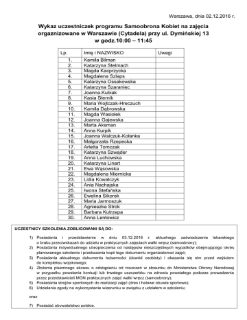Warszawa, dnia 02.12.2016 r. Wykaz uczestniczek programu Samoobrona Kobiet na zajęcia orgaznizowane w Warszawie (Cytadela) przy ul. Dymińskiej 13 w godz.10:00 – 11:45 Imię i NAZWISKO Lp. 1. 2. 3. 4. 5. 6. 7. 8. 9. 10. 11. 12. 13. 14. 15. 16. 17. 18. 19. 20. 21. 22. 23. 24. 25. 26. 27. 28. 29. 30. Uwagi Kamila Bilman Katarzyna Stelmach Magda Kacprzycka Magdalena Szlaps Katarzyna Ossakowska Katarzyna Szaraniec Joanna.Kubiak Kasia Sternik Maria Wojtczak-Hreczuch Kamila Dąbrowska Magda Wasiołek Joanna Gajewska Marta Aksman Anna Kurpik Joanna Walczuk-Kołanka Małgorzata Rzepecka Arletta Tomczak Katarzyna Szwąder Anna Luchowska Katarzyna Linart Ewa Wąsowska Magdalena Miernicka Lidia Kowalczyk Ania Nachajska Iwona Stefańska Ewelina Sikorek Maria Jarmoszuk Agnieszka Strok Barbara Kutrzepa Anna Lentowicz UCZESTNICY SZKOLENIA ZOBLIGOWANI SĄ DO: 1) Posiadania i przedstawienie w dniu 03.12.2016 r. aktualnego zaświadczenia lekarskiego o braku przeciwskazań do udziału w praktycznych zajęciach walki wręcz (samoobrony); 2) Posiadania indywidualnego ubezpieczenia od następstw nieszczęśliwych wypadków obejmującego okres planowanego szkolenia i przekazania kopii tego dokumentu organizatorowi zajęć; 3) Posiadania aktualnego dokumentu tożsamości (dowód osobisty) i okazania się nim przed wejściem do kompleksu wojskowego; 4) Złożenia pisemnego akcesu o odstąpieniu od roszczeń w stosunku do Ministerstwa Obrony Narodowej w przypadku powstania kontuzji lub trwałego uszczerbku na zdrowiu powstałego podczas prowadzenia przez przedstawicieli MON praktycznych zajęć walki wręcz (samoobrony); 5) Posiadania strojów sportowych do realizacji zajęć (dres i halowe obuwie sportowe); 6) Udzielania zgody na wykorzystanie wizerunku w związku z udziałem w szkoleniu; oraz 7) Posiadać obywatelstwo polskie. Warszawa, dnia 02.12.2016 r. Wykaz uczestniczek programu Samoobrona Kobiet na zajęcia orgaznizowane w Warszawie (Cytadela) przy ul. Dymińskiej 13 w godz.12:00 – 13:45 Imię i NAZWISKO Lp. 1. 2. 3. 4. 5. 6. 7. 8. 9. 10. 11. 12. 13. 14. 15. 16. 17. 18. 19. 20. 21. 22. 23. 24. 25. 26. 27. 28. 29. 30. Uwagi Mariola Juszczuk Renata Gromada Beata Bukowska Maria Bukowska Emilia Muciek Ilona Waleniak Magdalena Centkowska Magda Mrozowska Anna Wojtych Aleksandra Jach Kamila Elmerych Anna Kaczor Magdalena Kaczor Monika Sadurska Szycko Paulina Agnieszka Bernat-Gurbała Kinga Wojaczek Monika Rosińska Beata Prylińska Agata Popkowska Kasia Gmitruk Katarzyna Czerwińska Anna Marciniak Małgorzata Wierzbicka Elżbieta Jagodzińska Agnieszka Szczutowska Agnieszka Łowicka Milena BAWEJ Katarzyna Piechowska Monika Rosińska UCZESTNICY SZKOLENIA ZOBLIGOWANI SĄ DO: 1) Posiadania i przedstawienie w dniu 03.12.2016 r. aktualnego zaświadczenia lekarskiego o braku przeciwskazań do udziału w praktycznych zajęciach walki wręcz (samoobrony); 2) Posiadania indywidualnego ubezpieczenia od następstw nieszczęśliwych wypadków obejmującego okres planowanego szkolenia i przekazania kopii tego dokumentu organizatorowi zajęć; 3) Posiadania aktualnego dokumentu tożsamości (dowód osobisty) i okazania się nim przed wejściem do kompleksu wojskowego; 4) Złożenia pisemnego akcesu o odstąpieniu od roszczeń w stosunku do Ministerstwa Obrony Narodowej w przypadku powstania kontuzji lub trwałego uszczerbku na zdrowiu powstałego podczas prowadzenia przez przedstawicieli MON praktycznych zajęć walki wręcz (samoobrony); 5) Posiadania strojów sportowych do realizacji zajęć (dres i halowe obuwie sportowe); 6) Udzielania zgody na wykorzystanie wizerunku w związku z udziałem w szkoleniu; oraz 7) Posiadać obywatelstwo polskie. Warszawa, dnia 02.12.2016 r. Wykaz uczestniczek programu Samoobrona Kobiet na zajęcia orgaznizowane w Warszawie (Cytadela) przy ul. Dymińska 13 w godz.14:00 – 15:45 Imię i NAZWISKO Lp. 1. 2. 3. 4. 5. 6. 7. 8. 9. 10. 11. 12. 13. 14. 15. 16. 17. 18. 19. 20. 21. 22. 23. 24. 25. 26. 27. 28. 29. 30. Uwagi Ewa Bartczak Anna Kaczor Barbara Korytkowska Sabina Nowak Kumor Joanna Iza Pucyńska Diana Kozińska Estera Wachowiak Katarzyna Zgorzala Renata Niedziolka Anna Janiszewska Dorota Jozenas Maja Myrcha Ilona Najko Martyna Slawinska Monika Gochnio. Barbara Gochnio Katarzyna Stępień Edyta Bucior Emila Ksok Ewa Świtek Paulina Rosłoń Aleksandra Sławińska Aleksandra Kłykocińka Beata Tatol Olga Kośnik Karolina Tokarska- Leszczuk Justyna Strzelecka Anna Przybylska Edyta Rodak UCZESTNICY SZKOLENIA ZOBLIGOWANI SĄ DO: 1) Posiadania i przedstawienie w dniu 03.12.2016 r. aktualnego zaświadczenia lekarskiego o braku przeciwskazań do udziału w praktycznych zajęciach walki wręcz (samoobrony); 2) Posiadania indywidualnego ubezpieczenia od następstw nieszczęśliwych wypadków obejmującego okres planowanego szkolenia i przekazania kopii tego dokumentu organizatorowi zajęć; 3) Posiadania aktualnego dokumentu tożsamości (dowód osobisty) i okazania się nim przed wejściem do kompleksu wojskowego; 4) Złożenia pisemnego akcesu o odstąpieniu od roszczeń w stosunku do Ministerstwa Obrony Narodowej w przypadku powstania kontuzji lub trwałego uszczerbku na zdrowiu powstałego podczas prowadzenia przez przedstawicieli MON praktycznych zajęć walki wręcz (samoobrony); 5) Posiadania strojów sportowych do realizacji zajęć (dres i halowe obuwie sportowe); 6) Udzielania zgody na wykorzystanie wizerunku w związku z udziałem w szkoleniu; oraz 7) Posiadać obywatelstwo polskie.