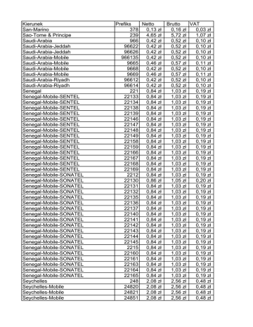 Kierunek San-Marino Sao-Tome & Principe Saudi-Arabia Saudi-Arabia-Jeddah Saudi-Arabia-Jeddah Saudi-Arabia-Mobile Saudi-Arabia-Mobile Saudi-Arabia-Mobile Saudi-Arabia-Mobile Saudi-Arabia-Riyadh Saudi-Arabia-Riyadh Senegal Senegal-Mobile-SENTEL Senegal-Mobile-SENTEL Senegal-Mobile-SENTEL Senegal-Mobile-SENTEL Senegal-Mobile-SENTEL Senegal-Mobile-SENTEL Senegal-Mobile-SENTEL Senegal-Mobile-SENTEL Senegal-Mobile-SENTEL Senegal-Mobile-SENTEL Senegal-Mobile-SENTEL Senegal-Mobile-SENTEL Senegal-Mobile-SENTEL Senegal-Mobile-SENTEL Senegal-Mobile-SONATEL Senegal-Mobile-SONATEL Senegal-Mobile-SONATEL Senegal-Mobile-SONATEL Senegal-Mobile-SONATEL Senegal-Mobile-SONATEL Senegal-Mobile-SONATEL Senegal-Mobile-SONATEL Senegal-Mobile-SONATEL Senegal-Mobile-SONATEL Senegal-Mobile-SONATEL Senegal-Mobile-SONATEL Senegal-Mobile-SONATEL Senegal-Mobile-SONATEL Senegal-Mobile-SONATEL Senegal-Mobile-SONATEL Senegal-Mobile-SONATEL Senegal-Mobile-SONATEL Senegal-Mobile-SONATEL Seychelles Seychelles-Mobile Seychelles-Mobile Seychelles-Mobile Prefiks Netto 378 0,13 zł 239 4,65 zł 966 0,42 zł 96622 0,42 zł 96626 0,42 zł 966135 0,42 zł 9665 0,46 zł 9668 0,42 zł 9669 0,46 zł 96612 0,42 zł 96614 0,42 zł 221 0,84 zł 22133 0,84 zł 22134 0,84 zł 22138 0,84 zł 22139 0,84 zł 22146 0,84 zł 22147 0,84 zł 22148 0,84 zł 22149 0,84 zł 22158 0,84 zł 22159 0,84 zł 22166 0,84 zł 22167 0,84 zł 22168 0,84 zł 22169 0,84 zł 2212 0,84 zł 22130 0,86 zł 22131 0,84 zł 22132 0,84 zł 22135 0,84 zł 22136 0,84 zł 22137 0,84 zł 22140 0,84 zł 22141 0,84 zł 22142 0,84 zł 22143 0,84 zł 22144 0,84 zł 22145 0,84 zł 2215 0,84 zł 22160 0,84 zł 22161 0,84 zł 22163 0,84 zł 22164 0,84 zł 22165 0,84 zł 248 2,08 zł 24820 2,08 zł 24821 2,08 zł 24851 2,08 zł Brutto VAT 0,16 zł 0,03 zł 5,72 zł 1,07 zł 0,52 zł 0,10 zł 0,52 zł 0,10 zł 0,52 zł 0,10 zł 0,52 zł 0,10 zł 0,57 zł 0,11 zł 0,52 zł 0,10 zł 0,57 zł 0,11 zł 0,52 zł 0,10 zł 0,52 zł 0,10 zł 1,03 zł 0,19 zł 1,03 zł 0,19 zł 1,03 zł 0,19 zł 1,03 zł 0,19 zł 1,03 zł 0,19 zł 1,03 zł 0,19 zł 1,03 zł 0,19 zł 1,03 zł 0,19 zł 1,03 zł 0,19 zł 1,03 zł 0,19 zł 1,03 zł 0,19 zł 1,03 zł 0,19 zł 1,03 zł 0,19 zł 1,03 zł 0,19 zł 1,03 zł 0,19 zł 1,03 zł 0,19 zł 1,05 zł 0,20 zł 1,03 zł 0,19 zł 1,03 zł 0,19 zł 1,03 zł 0,19 zł 1,03 zł 0,19 zł 1,03 zł 0,19 zł 1,03 zł 0,19 zł 1,03 zł 0,19 zł 1,03 zł 0,19 zł 1,03 zł 0,19 zł 1,03 zł 0,19 zł 1,03 zł 0,19 zł 1,03 zł 0,19 zł 1,03 zł 0,19 zł 1,03 zł 0,19 zł 1,03 zł 0,19 zł 1,03 zł 0,19 zł 1,03 zł 0,19 zł 2,56 zł 0,48 zł 2,56 zł 0,48 zł 2,56 zł 0,48 zł 2,56 zł 0,48 zł Seychelles-Mobile Seychelles-Mobile Seychelles-Mobile Seychelles-Mobile Seychelles-Mobile Seychelles-Mobile Seychelles-Mobile Seychelles-Mobile Seychelles-Mobile Seychelles-Mobile Seychelles-Mobile Seychelles-Mobile Seychelles-Mobile Seychelles-Mobile Seychelles-Mobile Seychelles-Mobile Seychelles-Mobile Seychelles-Mobile Seychelles-Mobile Seychelles-Mobile Seychelles-Mobile Sierra-Leone Sierra-Leone-Mobile Sierra-Leone-Mobile Sierra-Leone-Mobile Sierra-Leone-Mobile Sierra-Leone-Mobile Sierra-Leone-Mobile Sierra-Leone-Mobile Sierra-Leone-Mobile Singapore Singapore-Mobile Singapore-Mobile Slovakia Slovakia-Bratislava Slovakia-Mobile-O2 Slovakia-Mobile-O2 Slovakia-Mobile-O2 Slovakia-Mobile-O2 Slovakia-Mobile-Orange Slovakia-Mobile-Orange Slovakia-Mobile-Orange Slovakia-Mobile-Orange Slovakia-Mobile-Orange Slovakia-Mobile-Orange Slovakia-Mobile-Orange Slovakia-Mobile-Orange Slovakia-Mobile-Orange Slovakia-Mobile-T-Mobile Slovakia-Mobile-T-Mobile 24852 24853 24854 24855 24856 24857 24858 24859 248702 248703 248707 248709 24871 24872 24874 248751 248752 248753 24876 24877 24878 232 23223 23230 23233 23235 23240 23250 23276 23277 65 658 659 421 4212 421940 421944 421948 421949 421905 421906 421907 421908 421915 421916 421917 421918 421919 421901 421902 2,08 zł 2,08 zł 2,08 zł 2,08 zł 2,08 zł 2,08 zł 2,08 zł 2,08 zł 2,08 zł 2,08 zł 2,08 zł 2,08 zł 2,08 zł 2,08 zł 2,08 zł 2,08 zł 2,08 zł 2,08 zł 2,08 zł 2,08 zł 2,08 zł 2,16 zł 2,16 zł 2,15 zł 2,12 zł 2,16 zł 2,15 zł 2,15 zł 2,13 zł 2,12 zł 0,04 zł 0,04 zł 0,04 zł 0,08 zł 0,08 zł 0,59 zł 0,59 zł 0,59 zł 0,59 zł 0,53 zł 0,53 zł 0,53 zł 0,53 zł 0,53 zł 0,53 zł 0,53 zł 0,53 zł 0,53 zł 0,53 zł 0,53 zł 2,56 zł 2,56 zł 2,56 zł 2,56 zł 2,56 zł 2,56 zł 2,56 zł 2,56 zł 2,56 zł 2,56 zł 2,56 zł 2,56 zł 2,56 zł 2,56 zł 2,56 zł 2,56 zł 2,56 zł 2,56 zł 2,56 zł 2,56 zł 2,56 zł 2,66 zł 2,66 zł 2,65 zł 2,61 zł 2,66 zł 2,65 zł 2,65 zł 2,62 zł 2,61 zł 0,05 zł 0,05 zł 0,05 zł 0,09 zł 0,09 zł 0,73 zł 0,73 zł 0,73 zł 0,73 zł 0,65 zł 0,65 zł 0,65 zł 0,65 zł 0,65 zł 0,65 zł 0,65 zł 0,65 zł 0,65 zł 0,65 zł 0,65 zł 0,48 zł 0,48 zł 0,48 zł 0,48 zł 0,48 zł 0,48 zł 0,48 zł 0,48 zł 0,48 zł 0,48 zł 0,48 zł 0,48 zł 0,48 zł 0,48 zł 0,48 zł 0,48 zł 0,48 zł 0,48 zł 0,48 zł 0,48 zł 0,48 zł 0,50 zł 0,50 zł 0,50 zł 0,49 zł 0,50 zł 0,50 zł 0,50 zł 0,49 zł 0,49 zł 0,01 zł 0,01 zł 0,01 zł 0,02 zł 0,02 zł 0,14 zł 0,14 zł 0,14 zł 0,14 zł 0,12 zł 0,12 zł 0,12 zł 0,12 zł 0,12 zł 0,12 zł 0,12 zł 0,12 zł 0,12 zł 0,12 zł 0,12 zł Slovakia-Mobile-T-Mobile Slovakia-Mobile-T-Mobile Slovakia-Mobile-T-Mobile Slovakia-Mobile-T-Mobile Slovakia-Mobile-T-Mobile Slovakia-Mobile-T-Mobile Slovakia-NGN Slovenia Slovenia-Mobile Slovenia-Mobile Slovenia-Mobile Slovenia-Mobile Slovenia-Mobile Slovenia-Mobile Slovenia-Mobile Slovenia-Mobile Slovenia-Mobile Slovenia-Mobile Slovenia-Mobile Slovenia-Mobile Slovenia-Mobile Slovenia-Mobile Slovenia-Mobile Slovenia-Mobile-Mobitel Slovenia-Mobile-Mobitel Slovenia-Mobile-Mobitel Slovenia-Mobile-Mobitel Slovenia-Mobile-Mobitel Slovenia-Mobile-SiMobil Slovenia-Mobile-SiMobil Slovenia-Mobile-SiMobil Slovenia-OLO Slovenia-OLO Slovenia-OLO Slovenia-OLO Slovenia-OLO Slovenia-OLO Slovenia-OLO Slovenia-OLO Slovenia-OLO Slo