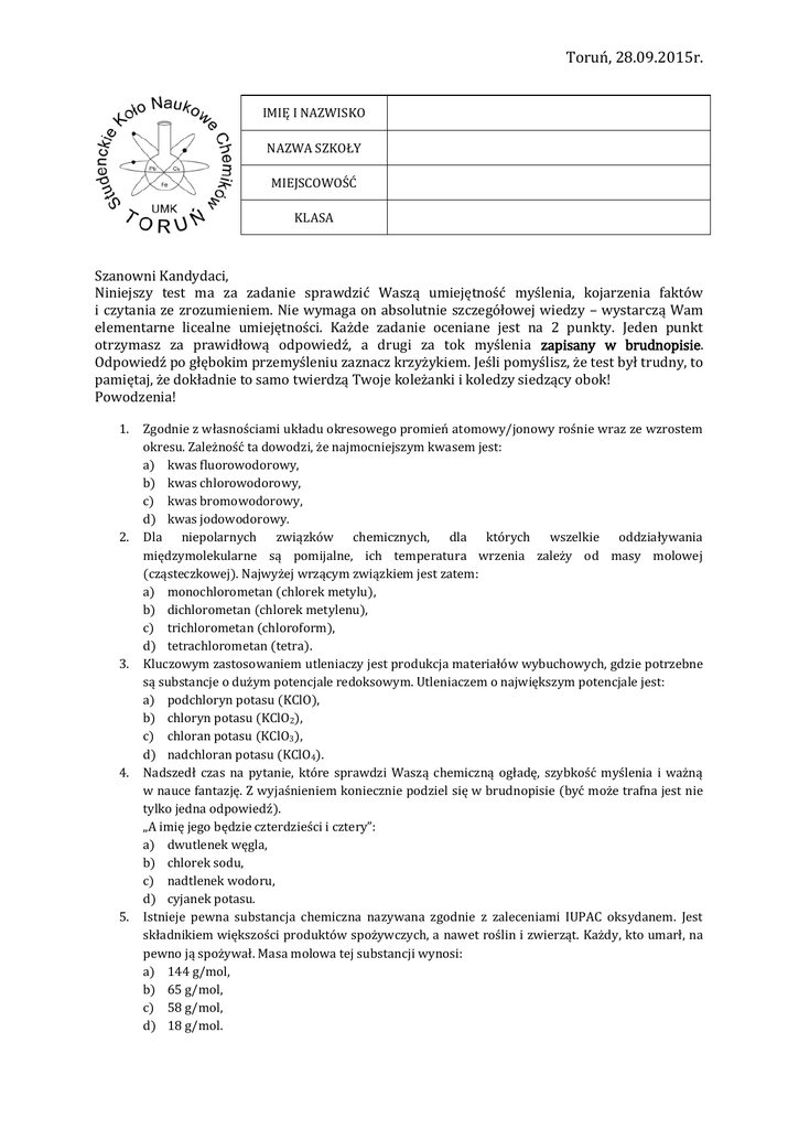 Toruń, 28.09.2015r. IMIĘ I NAZWISKO NAZWA SZKOŁY MIEJSCOWOŚĆ KLASA Szanowni Kandydaci, Niniejszy test ma za zadanie sprawdzić Waszą umiejętność myślenia, kojarzenia faktów i czytania ze zrozumieniem. Nie wymaga on absolutnie szczegółowej wiedzy – wystarczą Wam elementarne licealne umiejętności. Każde zadanie oceniane jest na 2 punkty. Jeden punkt otrzymasz za prawidłową odpowiedź, a drugi za tok myślenia zapisany w brudnopisie. Odpowiedź po głębokim przemyśleniu zaznacz krzyżykiem. Jeśli pomyślisz, że test był trudny, to pamiętaj, że dokładnie to samo twierdzą Twoje koleżanki i koledzy siedzący obok! Powodzenia! 1. 2. 3. 4. 5. Zgodnie z własnościami układu okresowego promień atomowy/jonowy rośnie wraz ze wzrostem okresu. Zależność ta dowodzi, że najmocniejszym kwasem jest: a) kwas fluorowodorowy, b) kwas chlorowodorowy, c) kwas bromowodorowy, d) kwas jodowodorowy. Dla niepolarnych związków chemicznych, dla których wszelkie oddziaływania międzymolekularne są pomijalne, ich temperatura wrzenia zależy od masy molowej (cząsteczkowej). Najwyżej wrzącym związkiem jest zatem: a) monochlorometan (chlorek metylu), b) dichlorometan (chlorek metylenu), c) trichlorometan (chloroform), d) tetrachlorometan (tetra). Kluczowym zastosowaniem utleniaczy jest produkcja materiałów wybuchowych, gdzie potrzebne są substancje o dużym potencjale redoksowym. Utleniaczem o największym potencjale jest: a) podchloryn potasu (KClO), b) chloryn potasu (KClO2), c) chloran potasu (KClO3), d) nadchloran potasu (KClO4). Nadszedł czas na pytanie, które sprawdzi Waszą chemiczną ogładę, szybkość myślenia i ważną w nauce fantazję. Z wyjaśnieniem koniecznie podziel się w brudnopisie (być może trafna jest nie tylko jedna odpowiedź). „A imię jego będzie czterdzieści i cztery”: a) dwutlenek węgla, b) chlorek sodu, c) nadtlenek wodoru, d) cyjanek potasu. Istnieje pewna substancja chemiczna nazywana zgodnie z zaleceniami IUPAC oksydanem. Jest składnikiem większości produktów spożywczych, a nawet roślin i zwierząt. Każdy, kto umarł, na pewno ją spożywał. Masa molowa tej substancji wynosi: a) 144 g/mol, b) 65 g/mol, c) 58 g/mol, d) 18 g/mol. Toruń, 28.09.2015r. 6. Absorbancja (A) jest liniową funkcją stężenia (C). Dla C = x absorbancja wyniosła y. Wartość A dla roztworu dwukrotnie rozcieńczonego wyniesie zaś: a) 2y, b) y, c) 0,5y. 7. Szybkość ( ) zapisanej niżej reakcji chemicznej opisać można zależnością matematyczną nazywaną równaniem kinetycznym. Korzystając z zapisanej równości oblicz jak zmienić należy stężenie reagenta A, aby szybkość reakcji wzrosła czterokrotnie. A C C =k A t A należy zatem: a) zmniejszyć dwukrotnie, b) zmniejszyć czterokrotnie, c) zwiększyć dwukrotnie, d) zwiększyć czterokrotnie. 8. Zgodnie z regułą van’t Hoffa każdy wzrost temperatury układu reakcyjnego o 10 K powoduje 2 – 4-krotny wzrost szybkości reakcji. Zakładając, że dla badanej reakcji wzrost ten jest trzykrotny, szybkość reakcji po wzroście temperatury o 30 oC zwiększy się: a) trzykrotnie, b) dziewięciokrotnie, c) dwudziestosiedmiokrotnie. 9. W laboratorium chemii fizycznej profesor próbuje ustalić pewną wielkość fizykochemiczną (S). Wiadomo, że w warunkach doświadczenia jest ona liniową funkcją temperatury (T) i napięcia prądu elektrycznego (U). Niestety okazało się, że w laboratorium nie ma odpowiedniego woltomierza. Profesor jednak, znając moc (P) badanego układu i posiadając amperomierz do pomiaru natężenia prądu (I), jest w stanie za pomocą prostego wzoru (P = UI) zakończyć eksperyment sukcesem. Pozostaje jednak pewna wątpliwość – ostatecznie wielkość P jest: a) wprost proporcjonalna do I, b) odwrotnie proporcjonalna do I, c) logarytmiczną funkcją I. 10. Spektroskopia jądrowego rezonansu magnetycznego dla protonów (1H NMR) jest metodą instrumentalną analizy chemicznej, pozwalającą na określenie struktury chemicznej związku organicznego przez określenie ilości „typów” nierozróżnialnych geometrycznie atomów wodoru w cząsteczce ustalanych w zależności od ilości sygnałów na widmie NMR (jeden „typ” atomów – jeden sygnał). Korzystając ze znajomości elementarnej geometrii, określ ilość sygnałów na widmie 1H NMR metanu (CH4). Wynosi ona: a) 1, b) 2, c) 4. Wyrażam zgodę na przetwarzanie podanych przeze mnie danych osobowych oraz na umieszczenie ich na podanej do wiadomości publicznej liście zakwalifikowanych i niezakwalifikowanych kandydatów. …………………………………………………………………………. DATA I PODPIS