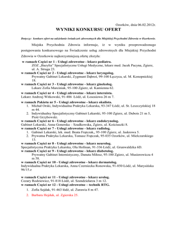Ozorków, dnia 06.02.2012r. WYNIKI KONKURSU OFERT Dotyczy: konkurs ofert na udzielanie świadczeń zdrowotnych dla Miejskiej Przychodni Zdrowia w Ozorkowie. Miejska Przychodnia Zdrowia informuje, iż w wyniku przeprowadzonego postępowania konkursowego na Świadczenie usług zdrowotnych dla Miejskiej Przychodni Zdrowia w Ozorkowie najkorzystniejszą ofertę złożyła: w ramach Części nr 1 - Usługi zdrowotne - lekarz pediatra. ZOZ „Bazylia” Specjalistyczne Usługi Medyczne, lekarz med. Jacek Pacyna, Zgierz, ul. A. Struga 23. w ramach Części nr 2 - Usługi zdrowotne - lekarz laryngolog. Prywatny Gabinet Lekarski, Zygmunt Dąbroś, 99-100 Łęczyca, ul. M. Konopnickiej 18. w ramach Części nr 3 - Usługi zdrowotne - lekarz ginekolog. Lekarz Zofia Marciniak, 95-100 Zgierz, ul. Kamienna 62. w ramach Części nr 4 - Usługi zdrowotne - lekarz internista. Lekarz Andrzej Witkowski, 91-486 Łódź, ul. Łososiowa 26 m 7. w ramach Pakietu nr 5 - Usługi zdrowotne - lekarz okulista. 1. Michał Orski, Indywidualna Praktyka Lekarska, 93-347 Łódź, ul. St. Leszczyńskiej 18 m 44. 2. Indywidualny Specjalistyczny Gabinet Lekarski, 95-100 Zgierz, ul. Dubois 21 m 5, Piotr Grzybowski. w ramach Części nr 6 - Usługi zdrowotne - lekarz endokrynolog. Gabinet Lekarski, Anna Gonerska – Szadkowska, Zgierz, ul. Kościuszki 8. w ramach Części nr 7 - Usługi zdrowotne - lekarz radiolog. 1. Gabinet Lekarski, lek. med. Beata Frątczak,, 95-100 Zgierz, ul. Jaskrowa 5. 2. Prywatna Praktyka Lekarska, Tomasz Frątczak, 95-035 Ozorków, ul. Mielczarskiego 13. w ramach Części nr 8 - Usługi zdrowotne - lekarz neurolog. Specjalistyczna Praktyka Lekarska, Ola Hofman, 91-336 Łódź, ul. Grunwaldzka 6D. w ramach Części nr 9 - Usługi zdrowotne - lekarz diabetolog. Prywatny Gabinet Internistyczny, Danuta Miłosz, 95-100 Zgierz, ul. Musierowicza 4 m 58. w ramach Części nr 10 - Usługi zdrowotne - lekarz dermatolog. Indywidualna Praktyka Lekarska, Anna Czerniecka Ronowska, 91-850 Łódź, ul. Marysińska 96/15.z w ramach Części nr 11 - Usługi zdrowotne - lekarz urolog. Cezary Rodziewicz, 91-818 Łódź, ul. Szendzielarza 3 m 12. w ramach Części nr 12 - Usługi zdrowotne – technik RTG. 1. Zofia Sejdak, 91-463 łódź, ul. Żurawia 8 m 47. 2. Barbara Hejduk, ul. Zgierska 25. Lekarz Ewa Serwa, 95-035 Ozorków, ul. Lipowa 4/4. w ramach Część nr 13 - Usługi zdrowotne - technik dentystyczny. Nie wpłynęła żadna oferta. w ramach Część nr 14 - Usługi zdrowotne - lekarz ortopeda. Indywidualna Specjalistyczna Praktyka Lekarska Przemysław Długosz, 95-100 Zgierz, ul. Staffa 18/36. w ramach Część nr 15 - Usługi zdrowotne - lekarz ortopeda. Indywidualna Praktyka Lekarska Karol Krajewski, Pabianice, ul. Popławska 56 m 8. w ramach Część nr 16 - Usługi zdrowotne - lekarz chirurg. Specjalistyczna Praktyka Lekarska, Wiesław Woźniak, ul. Cmentarna 11, 95-035 Ozorków. Z poważaniem