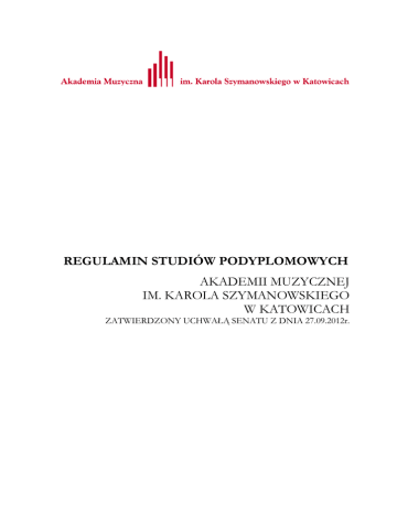 REGULAMIN STUDIÓW PODYPLOMOWYCH AKADEMII MUZYCZNEJ IM. KAROLA SZYMANOWSKIEGO W KATOWICACH ZATWIERDZONY UCHWAŁĄ SENATU Z DNIA 27.09.2012r. PRZEPISY OGÓLNE §1 1. Studia Podyplomowe w Akademii Muzycznej im. Karola Szymanowskiego w Katowicach, zwanej dalej Uczelnią, funkcjonują w oparciu o art.8 a, ustawy z dnia 27.07.2005r.–Prawo o szkolnictwie wyższym-(Dz.U.2012 poz.572). 2. Regulamin studiów podyplomowych, zwany dalej Regulaminem określa organizację, zasady rekrutacji, tok studiów oraz związane z nimi prawa i obowiązki osób uczęszczających na studia podyplomowe, zwanych dalej Słuchaczami. §2 1. O przyjęcie na studia podyplomowe, mogą ubiegać się kandydaci posiadający kwalifikacje drugiego stopnia. 2. Rekrutacja na studia podyplomowe odbywa się dwa razy w roku w ramach przesłuchania obejmującego: a) przedstawienie pracy artystycznej w postaci koncertu, recitalu lub innej formie w zależności od danej specjalności, b) rozmowę kwalifikacyjną. 3. Szczegółowe warunki oraz terminy rekrutacji na studia podyplomowe określa wydawany corocznie „Informator dla kandydatów na I rok studiów”. ORGAZNIACJA STUDIÓW PODYPLOMOWYCH §3 1. Szczegółową organizację roku akademickiego określa zarządzeniem Rektor. 2. Studia podyplomowe trwają cztery semestry i funkcjonują w ramach podstawowych jednostek organizacyjnych Uczelni, zwanych dalej Wydziałami. Plan studiów podyplomowych zatwierdza właściwa Rada Wydziału. 3. Plan studiów podyplomowych obejmuje wykaz przedmiotów wraz z ilością godzin formą zaliczenia oraz ilością punktów ECTS. §4 Rektor na wiosek Dziekana wyznacza Kierownika, który odpowiada za organizację, planowanie i koordynację studiów podyplomowych. TOK STUDIÓW PODYPLOMOWYCH §5 1. Rozpoczęcie studiów podyplomowych poprzedzone jest zawarciem umowy z uczelnią o warunkach odpłatności za studia podyplomowe. 2. Przydziału dydaktycznego dokonuje Kierownik studiów podyplomowych, uwzględniając w miarę możliwości sugestie słuchacza i opinię pedagoga prowadzącego daną klasę lub grupę. 3. Okresem zaliczeniowym jest semestr. 4. Zaliczenia przedmiotu dokonuje pedagog prowadzący przedmiot poprzez odpowiedni wpis do karty okresowych osiągnięć słuchacza. 5. Zaliczenia semestru dokonuje Dziekan poprzez wpis do karty okresowych osiągnięć słuchacza. 6. Warunkiem zaliczenia semestru jest: a) zaliczenie przedmiotów oraz uzyskanie punktów ECTS przewidzianych planem studiów b) złożenie przez słuchacza karty okresowych osiągnięć w dziekanacie w terminie 14 dni od dnia zakończenia sesji zaliczeniowej. 7. W uzasadnionych przypadkach Dziekan może wyrazić zgodę na przedłużenie terminu określonego w pkt. 6 lit. b. 8. W Akademii stosuje się następująca skalę ocen: 25 - 24 A - celujący B - bardzo dobry 23 - 21 C+ - dobry plus 20 - 19 C - dobry 18 - 16 D - zadowalający 15 - 13 E - dostateczny 12 - 10 F - niedostateczny 9 - 0 9. Zaliczenie bez oceny wpisywane jest przy użyciu skrótu „zal.” 10. Słuchacz, który nie zaliczył przedmiotu w sesji zaliczeniowej może przystąpić do zaliczenia w sesji poprawkowej. 11. Nieprzystąpienie do zaliczenia w sesji poprawkowej jest równorzędne z niezaliczeniem przedmiotu. 12. Jeżeli podstawą niezaliczenia przedmiotu była nieobecność słuchacza na zajęciach, pedagog prowadzący przedmiot może wyznaczyć inną formę zaliczenia np.: sprawdzian wiedzy. §6 1. Słuchacz studiów podyplomowych zostaje skreślony z listy słuchaczy w przypadku: a) niepodjęcia studiów b) rezygnacji ze studiów c) niezłożenia w terminie pracy dyplomowej lub egzaminu dyplomowego 2. Słuchacz studiów podyplomowych, może zostać skreślony z listy słuchaczy w przypadku: a) stwierdzenia braków postępów w nauce b) nieuzyskania zaliczenia semestru lub roku w określonym terminie c) niewniesienia opłat związanych z odbywanie studiów. 3. Skreślenia dokonuje Dziekan. 4. Od decyzji o skreśleniu słuchaczowi przysługuje odwołanie do Rektora. Odwołanie od decyzji wnosi się za pośrednictwem Dziekana, w terminie 14 dni od doręczenia decyzji o skreśleniu. WZNOWIENIE STUDIÓW §7 1. Osoba, która została skreślona z listy słuchaczy, może ubiegać się o ponowne przyjęcie na studia. 2. Decyzję o wznowieniu studiów podyplomowych podejmuje Dziekan. 3. Wznowienie studiów następuje na kolejnym semestrze następującym po semestrze zaliczonym przed skreśleniem. URLOP §8 1. Słuchaczowi w szczególnych wypadkach może być udzielony urlop roczny. 2. Urlopu udziela Dziekan na wniosek słuchacza zaopiniowany przez pedagoga prowadzącego. §9 1. Warunkiem ukończenia studiów podyplomowych jest: a) zaliczenie zajęć objętych planem studiów b) publiczne przedstawienie pracy artystycznej w postaci koncertu, recitalu lub w innej formie w zależności od danej specjalności c) obrona pracy pisemnej. 2. Słuchacz jest zobowiązany złożyć pisemną pracę w formie wydruku oraz w formie elektronicznej najpóźniej na dwa tygodnie przez wyznaczonym przez Kierownika Katedry terminem obrony pracy pisemnej. 3. Słuchacz jest zobowiązany do złożenia egzaminu końcowego: a) do dnia 30 czerwca ostatniego roku studiów – jeżeli studia podyplomowe kończą się w semestrze letnim b) do dnia 28 lutego ostatniego roku studiów- jeżeli studia podyplomowe kończą się w semestrze zimowym. 4. Komisję egzaminacyjną celem przeprowadzenia egzaminu końcowego powołuje Kierownik Katedry. 5. Ostateczną ocenę studiów ustala komisja egzaminacyjna, biorąc pod uwagę oceny z każdego elementu egzaminu końcowego. 6. W przypadku uzyskania z egzaminu końcowego oceny niedostatecznej lub gdy słuchacz nie przystąpi do egzaminu w ustalonym terminie, Dziekan wyznacza drugi termin jako ostateczny, nie później jednak niż do 30 września- jeśli studia kończą się w semestrze letnim lub do 31 marca- jeśli studia kończą się w semestrze zimowym. 7. Ponowne uzyskanie oceny niedostatecznej lu