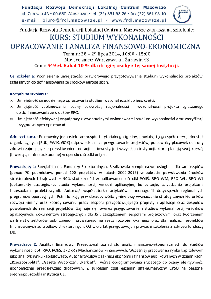 Fundacja Rozwoju Demokracji Lokalnej Centrum Mazowsze zaprasza na szkolenie: KURS: STUDIUM WYKONALNOŚCI OPRACOWANIE I ANALIZA FINANSOWO-EKONOMICZNA Termin: 28 – 29 lipca 2014, 10:00 - 15:00 Miejsce zajęć: Warszawa, ul. Żurawia 43 Cena: 549 zł. Rabat 10 % dla drugiej osoby z tej samej Instytucji. Cel szkolenia: Podniesienie umiejętności prawidłowego przygotowywania studium wykonalności projektów, zgłaszanych do dofinansowania ze środków europejskich. Korzyści ze szkolenia: • Umiejętność samodzielnego opracowania studium wykonalności/lub jego części. • Umiejętność zaplanowania, oceny celowości, racjonalności i wykonalności projektu zgłaszanego do dofinansowania ze środków RPO. • Umiejętność efektywnej współpracy z ewentualnymi wykonawcami studium wykonalności oraz weryfikacji przygotowanych opracowań. Adresaci kursu: Pracownicy jednostek samorządu terytorialnego (gminy, powiaty) i jego spółek czy jednostek organizacyjnych (PUK, PWIK, GOK) odpowiedzialni za przygotowanie projektów, pracownicy placówek ochrony zdrowia zajmujący się pozyskiwaniem dotacji na inwestycje i wszystkich instytucji, które planują swój rozwój (inwestycje infrastrukturalne) w oparciu o środki unijne. Prowadzący 1: Specjalista ds. Funduszy Strukturalnych. Realizowała kompleksowe usługi dla samorządów (ponad 70 podmiotów, ponad 100 projektów w latach 2009-2013) w zakresie pozyskiwania środków strukturalnych i krajowych – 90% skuteczności w aplikowaniu o środki POiIŚ, RPO WM, RPO WŁ, RPO WL (dokumenty strategiczne, studia wykonalności, wnioski aplikacyjne, konsultacje, zarządzanie projektami i zespołami projektowymi). Autorka/ współautorka artykułów i monografii dotyczących regionalnych programów operacyjnych. Pełni funkcję przy doradcy wójta gminy przy wyznaczaniu strategicznych kierunków rozwoju Gminy oraz koordynowaniu pracy zespołu przygotowującego projekty i aplikacje oraz zespołów powołanych do realizacji projektów. Zajmuje się również przygotowaniem studiów wykonalności, wniosków aplikacyjnych, dokumentów strategicznych dla JST, zarządzaniem zespołami projektowymi oraz tworzeniem partnerstw sektorów publicznego i prywatnego na rzecz rozwoju lokalnego oraz dla realizacji projektów finansowanych ze środków strukturalnych. Od wielu lat przygotowuje i prowadzi szkolenia z zakresu funduszy UE. Prowadzący 2: Analityk finansowy. Przygotował ponad sto analiz finansowo-ekonomicznych do studiów wykonalności dot. RPO, POIiŚ, ZPORR i Mechanizmów Finansowych. Wcześniej pracował na rynku kapitałowym jako analityk rynku kapitałowego. Autor artykułów z zakresu ekonomii i finansów publikowanych w dziennikach: „Rzeczpospolita”, „Gazeta Wyborcza”, „Parkiet”. Twórca oprogramowania służącego do oceny efektywności ekonomicznej przedsięwzięć drogowych. Z sukcesem zdał egzamin alfa-numeryczny EPSO na personel średniego szczebla instytucji UE. Program: Dzień I Opracowywania studiów wykonalności 1. Cel opracowywania studium wykonalności – co trzeba wykazać w dokumencie? 2. Matryca logiczna projektu-drzewo problemów, drzewo celów. 3. Jak prawidłowo wykazać zgodność projektu z dokumentami strategicznymi wyższego rzędu i programem operacyjnym? 4. Polityki horyzontalne UE jednym z ważniejszych elementów studium wykonalności. 5. Analiza społeczno-gospodarcza – jak wybrać najważniejsze informacje? 6. Analiza instytucjonalna i trwałość projektu – definicje. 7. Identyfikacja projektu a opis techniczny. 8. Opis alternatywnych wariantów realizacji projektu – przykładowe rozwiązania. 9. Analiza oddziaływania na środowisko. 10. Odniesienie do kryteriów szczegółowych – gdzie w studium wykonalności zawrzeć informacje. 11. Wnioski. Dzień II Zagadnienia analizy finansowo – ekonomicznej do studiów wykonalności 1. Wartość pieniądza w czasie. • Wartość pieniądza w czasie – praktyka: • Dyskontowanie przyszłych wartości, stopy dyskontowe. • Dyskonto w analizie f-e – wyliczanie luki finansowej. 2. Struktura analizy finansowo-ekonomicznej – wspólny rdzeń dla wszystkich priorytetów: analiza finansowa; analiza ekonomiczna; badanie wrażliwości na czynniki ryzyka. 3. Funkcje matematyczne i logiczne w Excelu. 4. Funkcje w Excelu – na przykładowej analizie. 5. Przykładowa analiza – prosta i krótka – krok po kroku. • Przykładowa analiza skomplikowana – rozdział po rozdziale (ogólnie). 6. Podstawowe błędy: • Wnioskodawców, • Instytucji oceniających. ZGŁOSZENIE KURS: STUDIUM WYKONALNOŚCI OPRACOWANIE I ANALIZA FINANSOWO-EKONOMICZNA Termin: 28 – 29 lipca 2014, 10:00 - 15:00 Miejsce zajęć: Warszawa, ul. Żurawia 43 Cena: 549 zł. Rabat 10 % dla drugiej osoby z tej samej Instytucji. Instytucja: ............................................................................................................................................ Adres: .................................................................................................................................................. NIP: ...................................................................................................................................................... L.p. Imię i nazwisko Wydział tel. e-mail 1........................................................................................................................................................... 2........................................................................................................................................................... ........................................................... Podpis osoby delegującej Zgłoszenie na szkolenie Zgłoszenia prosimy przesyłać do 21 lipca 2014 r. fax: (22) 351 93 10, e-mail: [email protected] lub wybrać opcje zapisu przez stronę www.frdl.mazowsze.pl Ewentualną rezygnację ze szkolenia można zgłosić najpóźniej na dwa dni robocze prz