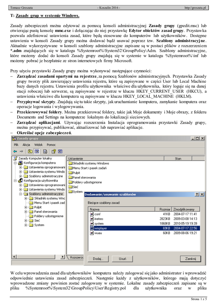 Tomasz Greszata - Koszalin 2016 - http://greszata.pl T: Zasady grup w systemie Windows. Zasady zabezpieczeń można edytować za pomocą konsoli administracyjnej Zasady grupy (gpedit.msc) lub otwierając pustą konsolę mmc.exe i dołączając do niej przystawkę Edytor obiektów zasad grupy. Przystawka pozwala zdefiniować ustawienia zasad, które będą stosowane do komputerów lub użytkowników . Dostępne ustawienia w konsoli Zasady grupy można dodawać bądź usuwać poprzez tzw. Szablony administracyj ne . Aktualnie wykorzystywane w konsoli szablony administracyjne zapisane są w postaci plików z rozszerzeniem *.adm znajdujących się w katalogu %Systemroot%\System32\GroupPolicy\Adm. Szablony administracyjne, które możemy dodać do konsoli Zasady grupy znajdują się w systemie w katalogu %Systemroot% \inf lub możemy pobrać je bezpłatnie ze stron internetowych firmy Microsoft. Przy użyciu przystawki Zasady grupy można wykonywać następujące czynności: Zarządzać zasadami opartymi na rejestrze, za pomocą Szablonów administracyjnych. Przystawka Zasady grupy tworzy plik zawierający ustawienia rejestru, które są zapisywane w części User lub Local Machine bazy danych rejestru. Ustawienia profilu użytkownika właściwe dla użytkownika, który loguje się na danej stacji roboczej lub serwerze, są zapisywane w rejestrze w kluczu HKEY_CURRENT_USER (HKCU), a ustawienia właściwe dla komputera są zapisywane w kluczu HKEY_LOCAL_MACHINE (HKLM). Przypisywać skrypty. Znajdują się tu takie skrypty, jak uruchamianie komputera, zamykanie komputera oraz operacje logowania i wylogowywania. Przekierowywać foldery. Można przekierować foldery, takie jak Moje dokumenty i Moje obrazy, z folderu Documents and Settings na komputerze lokalnym do lokalizacji sieciowych. Zarządzać aplikacjami. Używając rozszerzenia Instalacja oprogramowania przystawki Zasady grupy, można przypisywać, publikować, aktualizować lub naprawiać aplikacje. Określać opcje zabezpieczeń. W celu wprowadzenia zasad dla użytkowników komputera należy zalogować się jako administrator i wprowadzić odpowiednie ustawienia zasad zabezpieczeń. Następnie każdy z użytkowników, którego mają dotyczyć wprowadzone zmiany powinien zostać zalogowany w systemie. Lokalne zasady zabezpieczeń zapisane są w pliku %Systemroot%\System32\GroupPolicy\User\Registry.pol dla użytkownika oraz w pliku Strona 1 z 5 Tomasz Greszata - Koszalin 2016 - http://greszata.pl %Systemroot%\System32\GroupPolicy\Machine\Registry.pol dla komputera. Jeżeli chcemy, aby ograniczenia nie dotyczyły administratora należy po przeprowadzeniu aktualizacji zasad dla użytkowników (logowanie) zalogować się na konto administratora, skopiować plik registry.pol, powrócić do edytora zasad zabezpieczeń i cofnąć ograniczenia, zamknąć edytor zasad grup i skopiowanym wcześniej plikiem zastąpić nowy registry.pol (po zamknięciu konsoli powstał nowy plik). W przypadku problemów z zabezpieczeniami (np. niepoprawna konfiguracja) można przywrócić ustawienia domyślne zasad grup. W tym celu należy usunąć istniejący plik registry.pol lub zmienić jego nazwę i ponownie uruchomić komputer. System ochrony plików spowoduje przywrócenie domyślnego pliku registry.pol . Za pomocą przystawki Ustawienia zabezpieczeń można modyfikować zasady zabezpieczeń jednostki organizacyjnej, domeny lub lokacji z dowolnego komputera dołączonego do domeny. Ustawienia zabezpieczeń pozwalają administratorowi zabezpieczeń modyfikować ustawienia zabezpieczeń przypisane do obiektu zasad grupy. Wyróżniamy następujące narzędzia zasad zabezpieczeń: Szablony zabezpieczeń - W szablonie można zdefiniować zasady zabezpieczeń. Szablony można stosować do obiektu zasad grupy lub do zabezpieczeń komputera lokalnego. Przykładowe ustawienia zabezpieczeń zdefiniowane są w szablonach zabezpieczeń zapisanych w katalogu %Systemroot%\Security\Templates. Konfiguracja i analiza zabezpieczeń - Tego narzędzia można używać do konfigurowania komputera za pomocą szablonu zabezpieczeń lub do porównywania aktualnych ustawień komputera z ustawieniami zdefiniowanymi w szablonie zabezpieczeń. Niezbędne bazy danych lub szablony zabezpieczeń znajdziemy w katalogu: c:\Windows\security. Przystawka konfiguracja i analiza zabezpieczeń umożliwia przywrócenie ustawień zasad zabezpieczeń. Strona 2 z 5 Tomasz Greszata - Koszalin 2016 - http://greszata.pl Zasady zabezpieczeń lokalnych - Tego narzędzia można używać do edytowania poszczególnych ustawień zabezpieczeń na komputerze lokalnym. Lokalne zasady zabezpieczeń zapisane są w pliku %Systemroot%\System32\GroupPolicy\User\Registry.pol dla użytkownika oraz w pliku %Systemroot%\System32\GroupPolicy\Machine\Registry.pol dla komputera. Strona 3 z 5 Tomasz Greszata - Koszalin 2016 - http://greszata.pl Polecenie secedit - Tego narzędzia można używać do automatyzowania zadań związanych z konfiguracją i analizą zabezpieczeń systemu przez porównanie bieżącej konfiguracji z szablonami zabezpieczeń za pomocą wiersza poleceń. secedit /? secedit /configure /DB Nazwa_pliku /CFG "%windir%\Security\Templates\Setup security.inf" [/overwrite][/areasObszar1 Obszar2...] [/logŚcieżka_dziennika] [/quiet] Porada: Do działań administracyjnych warto przygotować globalną konsolę administracyjną (za pomocą konsoli mmc). Taka konsola powinna zawierać następujące przystawki: .NET Framework Configuration, Dzienniki wydajności i alerty, Group Policy Management, Konfiguracja i analiza zabezpieczeń, Menedżer autoryzacji, Monitor sieci bezprzewodowej, Pulpity zdalne, Rozproszony system plików (DFS), Szablony zabezpieczeń, Przystawki do zarządzania Active Directory, Urząd certyfikacji, Usługi składowe, Wynikowy zestaw zasad. W celu przygotowania konsoli należy wykonać: Start => Uruchom => mmc /a %SystemRoot%\system32\compmgmt.msc Spowoduje to uruchomienie konsoli Zarządzanie