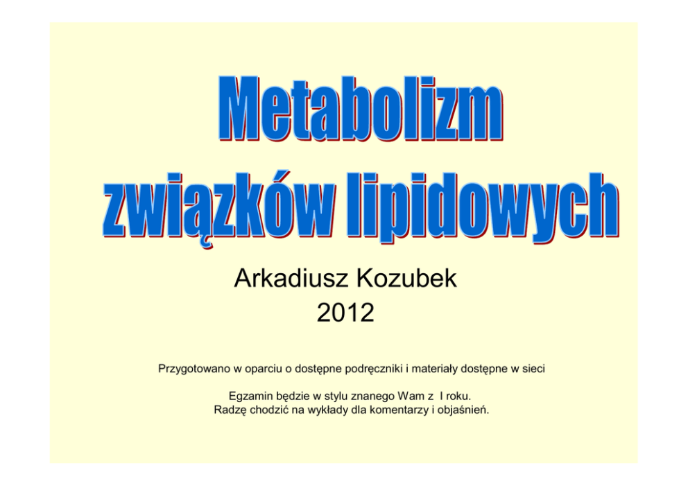Arkadiusz Kozubek 2012 Przygotowano w oparciu o dostępne podręczniki i materiały dostępne w sieci Egzamin będzie w stylu znanego Wam z I roku. Radzę chodzić na wykłady dla komentarzy i objaśnień. Związki lipidowe LIPIDY – ZWIĄZKI LIPIDOWE – tłuszcze i związki tłuszczopodobne definicje Po co(p. one są? i omówienie na poprzednim cyklu wykładowym) pełnią w organizmach żywych trzy główne funkcje: -Pełnią funkcje strukturalne - Uczestniczą w przekazywaniu informacji - Są źródłem energii, szczególnie te dostarczane z pokarmem Składnik Energia kJ/g suchej masy Sucha masa (g Dostępna (kJ) energia Kwasy tłuszczowe (tkanka tłuszczowa) 37 15 000 555 000 Białko (mięśnie) 17 6 000 102 000 Glikogen (mięśnie) 16 120 1 920 Glikogen (wątroba) 16 70 1 120 Glukoza (płyny ustrojowe) 16 20 320 2 I. Katabolizm I.A. Katabolizm triglicerydów (tłuszczów prostych) i fosfolipidów Tłuszczowce występują w pożywieniu zwierząt jako „tłuste” elementy składowe diety (n.p. tkanka tłuszczowa mięsa, tłuszcze nabiału) oraz jako dodawane do diety tłuszcze (n.p. masło, smalec, oleje, margaryny) Spożywane z pokarmem podlegają przemianom metabolicznym dzięki którym organizm będzie mógł je wykorzystać jako źródło energii 3 Ogólne etapy wprowadzania triglicerydów pokarmowych do organizmu zwierzęcia Tłuszcze z pożywienia są degradowane do monoglicerydów i wolnych kwasów tłuszczowych w dwunastnicy a w komórkach nabłonka tworzą ponownie triglicerydy, które kondensują z lipoproteinami dając chylomikrony, które docierają do wątroby, płuc, serca, mięśni i innych organów. 4 Hydroliza trójglicerydów w tkance tłuszczowej (lipoliza) jest regulowana hormonalnie 5 Lipazy 6 Lipazy 7 Fosfolipazy 8 Fosfolipazy 9 Fosfolipazy A2 10 Fosfolipazy A2 11 Fosfolipazy A2 12 Fosfolipazy A2 Kinetyka działania – specyfika w stosunku do innych enzymów gdyż substrat nie jest rozpuszczalny w wodzie 13 Fosfolipazy A2 14 Fosfolipazy C 15 Udział fosfolipaz w sygnalizacji komórkowej 16 Fosfolipazy D 17 Fosfolipazy D 18 19 Dalsze etapy katabolizmu glicerydów Trawienie triglicerydów przebiega poprzez diglycerydy. Powstają one głównie podczas trawienia triglicerydów w żołądku i dwunastnicy. U ludzi lipaza żołądkowa preferencyjnie hydrolizuje wiązanie estrowe w pozycji sn-3 dając sn-1,2-diacyloglicerole. W środowisku kwaśnym ulegają one izomeryzacji do sn-1,3-diacylogliceroli, które znowu są hydrolizowane w pozycji sn-3 dając w konsekwencji monoacyloglicerole powszechnie wykazywane w treści żołądkowej. W dwunastnicy lipaza trzustkowa hydrolizuje wiązania sn-1 i sn-3 dając mieszaninę sn-2,3 i sn-1,2-diacylogliceroli. One również ulegają chemicznej izomeryzacji co w konsekwencji prowadzi do całkowitego zhydrolizowania tych tłuszczów. 20 Los glicerolu Uwolniony glicerol wchodzi w szlak Glikolizy a następnie Cyklu Kwasu Cytrynowego 21 Los wolnych kwasów tłuszczowych I Szczególna rola kwasu arachidonowego 22 Los wolnych kwasów tłuszczowych II Aby mogły być źródłem energii konieczna jest ich metaboliczna aktywacja Kwasy tłuszczowe są aktywowane metabolicznie w zewnętrzej błonie mitochondrialnej lub na powierzchni retikulum przez dołączenie CoA. Reakcję katalizuje syntetaza acylo-CoA Uaktywniony metabolicznie kwas tłuszczowy Dalsze etapy katabolizmu kwasów tłuszczowych odbywają się w matriks mitochondrialnej 23 Uaktywniony metabolicznie kwas tłuszczowy 24 25 Los kwasów tłuszczowych w mitochondriach Najpierw zaktywowane kwasy muszą zostać przeniesione z cytosolu do mitochondriów. Do tego celu służy tzw. Prom karnitynowy 26 Degradacja kwasów tłuszczowych w mitochondriach – β-oksydacja Reakcje: ! 1 - utlenienie 2 - uwodnienie 3 - utlenienie 4 - tioliza 27 Degradacja kwasów tłuszczowych w mitochondriach – β-oksydacja Dehydrogenaza acylo-CoA 28 Dehydrogenaza acylo-CoA FAD FAD przekazuje elektrony na flawoproteinę przekazującą elektrony (ETF). Elektrony te przy udziale swoistego białka żelazowo-siarkowego są użyte do redukcji ubichinonu włączającego je w mitochondrialny łańcuch transportu elektronów – zysk 1,5 cząsteczki ATP 29 Ostatnia reakcja - tioliza Do cyklu kwasu cytrynowego Do ponownej obróbki - zawrócenie do etapu I 30 Bilans β-oksydacji Woda metaboliczna 31 β-oksydacja kwasów nienasyconych β-oksydacja kwasu olejowego (18:1 delta 9) konieczny jest dodatkowy enzym – izomeraza enoilo-CoA, który zmienia konfigurację wiązania podwójnego z cis na trans 32 Cały proces przebiega tak 33 w przypadku wielonienasyconych kwasów tłuszczowych (tu kwas linolowy 18:2 delta 9,12) konieczne są dwa dodatkowe enzymy: izomeraza enoilo-CoA reduktaza 2,4-dienoilo-CoA 34 β-oksydacja kwasów nieparzystowęglowych (częstych u roślin i organizmów morskich) Wymagana jest obecność dodatkowych trzech enzymów: Karboksylazy propionylo-CoA (biotyna) Epimerazy metylomalonylo-CoA Mutazy metylomalonylo-CoA (B12) 35 β-oksydacja kwasów nieparzystowęglowych Najpierw zachodzi odpowiednia liczba cyklów β-oksydacji aż do pozostania „resztki” Produkt wchodzi do CKTK lub po przekształceniu w jabłczan i przejściu do cytosolu jest dekarboksylowany do pirogronianu, który potem zostanie spalony 36 β-oksydacja w peroksysomach i glioksysomach różni się od mitochondrialnej tylko pierwszą reakcją – występuje tu oksydaza (dehydrogenaza) acylo-CoA (inna od tej występującej w normalnej β-oksydacji) Elektrony nie wędrują bowiem przez łańcuch oddechowy a trafiają bezpośrednio na tlen dając H2O2 Z tego względu uzyskuje się z kwasu tłuszczowego mniej cząsteczek ATP (FAD vs NAD) 37 Cały proces wygląda jak na schemacie 38 α-oksydacja kwasów rozgałęzionych W tłuszczu mleka przeżuwaczy (krowy, owce) i produktach nabiałowych występuje kwas fitanowy, produkt utleniania fitolu (z chlorofilu). Obecność grupy metylowej przy węglu C-3 blokuje β-oksydację, konieczną jes