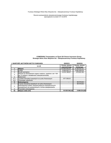 Fundusz Strategia Wielu Klas Aktywów bis - Ubezpieczeniowy Fundusz Kapitałowy Roczne sprawozdanie ubezpieczeniowego funduszu kapitałowego sporządzone na dzień 31-12-2016 COMPENSA Towarzystwo na Życie SA Vienna Insurance Group Strategia Wielu Klas Aktywów bis - Ubezpieczeniowy Fundusz Kapitałowy I. WARTOŚĆ AKTYWÓW NETTO FUNDUSZU (w zł) I. 1. 2. 3. 4. 4.1. 4.2. II. 1. 2. 3. III. Aktywa Lokaty Środki pieniężne Aktywa za zezwoleniem organu nadzoru, zgodnie z art. 154 ust. 9 ustawy o działalności ubezpieczeniowej Należności Z tytułu transakcji zawartych na rynku finansowym Pozostałe należności Zobowiązania Z tytułu transakcji zawartych na rynku finansowym Zobowiązania wobec ubezpieczających,ubezpieczonych, uposażonych lub uprawnionych z umów ubezpieczenia Pozostałe zobowiązania Aktywa netto (I-II) XII/2015 Koniec okresu poprzedniego 10 535 542,22 5 939 042,14 4 019 169,57 XII/2016 Koniec okresu bieżącego 5 155 431,21 4 682 809,29 472 621,92 577 330,51 - 10 535 542,22 60 516,52 60 516,52 5 094 914,69 Fundusz Strategia Wielu Klas Aktywów bis - Ubezpieczeniowy Fundusz Kapitałowy Roczne sprawozdanie ubezpieczeniowego funduszu kapitałowego sporządzone na dzień 31-12-2016 II. ZMIANY WARTOŚCI AKTYWÓW NETTO FUNDUSZU (w zł) A. Aktywa netto funduszu na początek okresu B. Stan netto z działalności operacyjnej (I-II) I. Zwiększenia funduszu 1. Tytułem składek zwiększających wartość funduszu Pozostałe przychody 2. 3. Pozostałe zwiększenia II. Zmniejszenia funduszu 1. Tytułem wykupu 2. Tytułem wypłat pozostałych świadczeń ubezpieczeniowych Tytułem opłat za ryzyko ubezpieczeniowe oraz innych opłat 3. potrącanych z funduszu 4. Tytułem zwrotu składek ubezpieczeniowych Tytułem opłat za zarządzanie funduszem oraz innych opłat 5. tytułem administrowania funduszem 6. Pozostałe koszty 7. Pozostałe zmniejszenia C. Wynik netto z działalności inwestycyjnej Aktywa netto funduszu na koniec okresu D. sprawozdawczego XII/2015 Okres poprzedni 13 073 219,86 -3 203 143,30 0,00 0,00 0,00 0,00 3 203 143,30 2 962 785,49 0,00 XII/2016 Okres bieżący 10 535 542,22 -5 895 864,94 0,00 0,00 0,00 0,00 5 895 864,94 5 425 054,78 0,00 0,00 0,00 0,00 0,00 240 357,82 159 131,70 0,00 0,00 665 465,66 0,00 311 678,46 455 237,41 10 535 542,22 5 094 914,69 III. LICZBA I WARTOŚĆ JEDNOSTEK ROZRACHUNKOWYCH Pozycja 1. Liczba jednostek rozrachunkowych: liczba jednostek rozrachunkowych na początek okresu 1.1 sprawozdawczego liczba jednostek rozrachunkowych na koniec okresu 1.2 sprawozdawczego 2. Wartość jednostki rozrachunkowej: wartość jednostki rozrachunkowej na początek okresu 2.1 sprawozdawczego minimalna wartość jednostki rozrachunkowej w okresie 2.2 sprawozdawczym maksymalna wartość jednostki rozrachunkowej w okresie 2.3 sprawozdawczym wartość jednostki rozliczeniowej na koniec okresu 2.4 sprawozdawczego XII/2015 Okres poprzedni XII/2016 Okres bieżący 1 194 979,91120 881 818,65 881 818,65 405 689,71 10,98648 11,94752 10,98648 10,17000 12,27122 12,55865 11,94752 12,55865 Fundusz Strategia Wielu Klas Aktywów bis - Ubezpieczeniowy Fundusz Kapitałowy Roczne sprawozdanie ubezpieczeniowego funduszu kapitałowego sporządzone na dzień 31-12-2016 IV. ZESTAWIENIE AKTYWÓW NETTO FUNDUSZU - półroczne XII/2016 Wartość bilansowa (w zł) I. 1. 2. 3. 4. 5. 6. 7. 8. 9. 10. 11. 12. II. III. IV. V. VI. 1 2 3 1 Lokaty (suma 1-12) Papiery wartościowe emitowane, poręczone lub gwarantowane przez Skarb Państwa lub organizacje międzynarodowe, których członkiem jest Rzeczpospolita Polska Obligacje emitowane lub poręczone przez jednostki samorządu terytorialnego lub związki jednostek samorządu terytorialnego Inne dłużne papiery wartościowe o stałej stopie dochodu Akcje Udziały Jednostki uczestnictwa i certyfikaty inwestycyjne w funduszach inwestycyjnych Instrumenty pochodne, o ile służą zmniejszeniu ryzyka związanego z innymi aktywami stanowiącymi pokrycie rezerw techniczno-ubezpieczeniowych Inne papiery wartościowe o zmiennej kwocie dochodu Pożyczki Nieruchomości Depozyty bankowe Pozostałe lokaty Aktywa za zezwoleniem organu nadzoru, zgodnie z art. 154 ust. 9 ustawy o działalności ubezpieczeniowej Środki pieniężne Należności Zobowiązania Aktywa netto (w tym) krajowe zagraniczne - kraje UE zagraniczne - kraje poza UE 2 4 682 809,29 902 833,64 Udział w aktywach netto funduszu (w %) 3 91,91% 17,72% 0,00% 77 133,60 3 434 646,17 1,51% 67,41% 268 195,88 5,26% 0,00% 472 621,92 60 516,52 5 094 914,69 4 589 696,37 265 848,13 239 370,19 9,28% 0,00% 1,19% 100,00% 90,08% 5,22% 4,70% Fundusz Strategia Wielu Klas Aktywów bis - Ubezpieczeniowy Fundusz Kapitałowy Roczne sprawozdanie ubezpieczeniowego funduszu kapitałowego sporządzone na dzień 31-12-2016 V. ZESTAWIENIE AKTYWÓW NETTO FUNDUSZU - roczne XII/2016 2 4 682 809,29 Udział w aktywach netto funduszu (w %) 3 91,91% 902 833,64 17,72% 902 833,64 17,72% 77 133,60 77 133,60 1,51% 1,51% 3 434 646,17 3 434 646,17 67,41% 67,41% 268 195,88 5,26% 268 195,88 5,26% 472 621,92 9,28% 0,00% 1,19% 100,00% 90,08% 5,22% 4,70% Wartość bilansowa (w zł) I. 1. 1.1 1.2 1.3 2. 3. 3.1 3.2 4. 4.1 4.2 5. 6. 6.1 6.2 6.2.1 6.2.2 7. 7.1 7.2 7.3 7.4 7.5 8. 9. 9.1 9.2 9.3 9.4 10. 11. 12. 1 Lokaty (suma 1-12) Papiery wartościowe emitowane, poręczone lub gwarantowane przez Skarb Państwa lub organizacje międzynarodowe, których członkiem jest Rzeczpospolita Polska Obligacje Bony skarbowe Inne Obligacje emitowane lub poręczone przez jednostki samorządu terytorialnego lub związki jednostek samorządu terytorialnego Inne dłużne papiery wartościowe o stałej stopie dochodu Notowane na rynku regulowanym Pozostałe Akcje Akcje notowane na rynku regulowanym Pozostałe akcje Udziały Jednostki uczestnictwa i certyfikaty inwestycyjne w funduszach inwestycyjnych Jednostki uczestnictwa Certyfikaty inwestycyjne Certyfikaty inwestycyjne funduszy inwestycyjnych dokonujących lokat wyłącznie w nieruchomości Certyfikaty inw