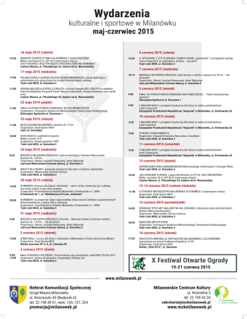 Wydarzenia kulturalne i sportowe w Milanówku maj-czerwiec 201 5 1 6 maja 201 5 (sobota) 1 9:30 6 czerwca 201 5 (sobota) KONCERT CHARYTATYWNY dla DOMINIKA | zespół PIĘCIOKĄT Bilety: normalny 29 zł, VIP 39 zł (rezerwacja miejsc) CAŁY DOCHÓD Z BILETÓW BĘDZIE PRZEZNACZONY NA DOMINIKA! 1 4:30 Teatr Letni MCK, ul. Kościelna 3 L’amour Maison, ul. Piłsudskiego 33, wejście od ul. Warszawskiej 7 czerwca 201 5 (niedziela) 1 7 maja 201 5 (niedziela) 1 7:00 POLSKA KAPELA LUDOWA FELIKSA DZIERŻANOWSKIEGO | panel dyskusyjny | potańcówka przy gramofonie do muzyki Polskiej Kapeli Ludowej 1 0:1 5 Teatr Letni MCK, ul. Kościelna 3 1 7:00 WIOSNA MIŁOŚCIĄ W POEZJI ZAKLĘTA | koncert zespołu BEZ ZGRZYTU w składzie: Hanna Kobylańska, Krzysztof Żurek, Wojciech Bartosiak, Seweryn Kowalski oraz Jacek Łocz. L’amour Maison, ul. Piłsudskiego 33, wejście od ul. Warszawskiej start pod Milanowskim Centrum Kultury, ul. Kościelna 3 9 czerwca 201 5 (wtorek) 9:00 FINAŁ VII POWIATOWEGO KONKURSU JĘZYKA NIEMIECKIEGO Organizator: Gimnazjum Społeczne Milanowskiego Towarzystwa Edukacyjnego 9:30 9:30 RAJD ULICAMI MILANÓWKA | dystans ok 1 7 km Organizator: Dział Sportu MCK 9:30 HAVA NAGILA | spektakl muzyczny Bilety w cenie 1 0 zł Organizator: Stowarzyszenie T-ART 1 1 czerwca 201 5 (czwartek) 24 maja 201 5 (niedziela) 9:30 1 2 czerwca 201 5 (piątek) ZAKOŃCZENIE ROKU AKADEMICKIEGO Milanowskiego Uniwersytetu Trzeciego Wieku Teatr Letni MCK, ul. Kościelna 3 KWIATY DLA MAMY | warsztaty plastyczne dla mam z dziećmi, kawiarenka Organizator: Milanowskie Centrum Kultury Teatr Letni MCK, ul. Kościelna 3 1 9:30 30 maja 201 5 (sobota) HARMIDER | impreza dla dzieci i młodzieży – sport, taniec, konkursy, gry i zabawy, warsztaty, pokaz mody i inne atrakcje Organizator: Przedsiębiorcze Kobiety Milanówka, Przedszkole nr 1 , MCK HARMIDER | w programie: Zgas i jego beatbox show oraz DJ Endless na gramofonach! Bitwa Breakdance, pokazy tańca, konkursy Organizator: Przedsiębiorcze Kobiety Milanówka, Przedszkole nr 1 , MCK Teatr Letni MCK, ul. Kościelna 3 1 3-1 4 czerwca 201 5 (sobota-niedziela) 1 1 :00 NIEDZIELA NA DWÓCH KÓŁKACH | Sromów – Muzeum ludowe (ruchome rzeźby) | dystans ok. 1 1 0 km – dla dorosłych Organizator: Sekcja Turystyki Rowerowej, Adam Matusiak 1 5 czerwca 201 5 (poniedziałek) 1 6:00 1 8:30 MARATON ARTYSTYCZNY Organizator: Gimnazjum Społeczne Milanowskiego Towarzystwa Edukacyjnego Teatr Letni MCK, ul. Kościelna 3 2 czerwca 201 5 (wtorek) 1 6 czerwca 201 5 (wtorek) STREETBALL | turniej dla dzieci i młodzieży z Milanówka o Puchar Burmistrza Miasta Organizator: Dział Sportu MCK Boisko sportowe SP nr 2, ul. Literacka 20 1 7:30 UROCZYSTA DEKORACJA ZWYCIĘZCÓW MILANOWSKIEJ LIGII SIÓDEMEK Zapraszamy na mecze finałowe od godziny 1 6.00 Organizator: Dział Sportu MCK Boisko „Orlik 201 2”, ul. Sportowa 3 czerwca 201 5 (środa) 9:001 3:00 WERNISAŻ WYSTAWY MALARSTWA NA JEDWABIU | dziecięce prace pod kierunkiem Barbary Matuszewskiej-Berg Organizator: Milanowskie Centrum Kultury Teatr Letni MCK, ul. Kościelna 3 start pod Milanowskim Centrum Kultury, ul. Kościelna 3 1 5:00 X OTWARTE MISTRZOSTWA MILANÓWKA W SCRABBLE | rozpoczęcie turnieju Organizator: Dział Sportu MCK Teatr Letni MCK, ul. Kościelna 3 31 maja 201 5 (niedziela) 9:00 JAZZ KONCERT & WOKAL | zagra dla Państwa A LITTLE JAZZ ORCHESTRA! Bilety: normalny 29 zł, VIP 39 zł (rezerwacja miejsc) L’amour Maison, ul. Piłsudskiego 33, wejście od ul. Warszawskiej Przedszkole Nr 1 , ul. Fiderkiewicza 43 oraz „Amfiteatr” 20:00 Z BIEGIEM WISŁY | przegląd Artystyczny dla dzieci w wieku przedszkolnym część plastyczna Europejskie Przedszkole Niepubliczne "Kasperek" w Milanówku, ul. Brwinowska 2d NIEDZIELA NA DWÓCH KÓŁKACH | rajd na orientację z Termami Mszczonów Dystans ok. 1 00 km Organizator: Sekcja Turystyki Rowerowej, Adam Matusiak start pod Milanowskim Centrum Kultury, ul. Kościelna 3 1 4:00 OTWARTY DZIEŃ EMERYTA Organizator: Związek Emerytów, Rencistów i Inwalidów Teatr Letni MCK, ul. Kościelna 3 Teatr Letni MCK, ul. Kościelna 3 1 2:00 Z BIEGIEM WISŁY | przegląd Artystyczny dla dzieci w wieku przedszkolnym część teatralna Europejskie Przedszkole Niepubliczne "Kasperek" w Milanówku, ul. Brwinowska 2d start: ul. Starodęby 8:30 Z BIEGIEM WISŁY | przegląd Artystyczny dla dzieci w wieku przedszkolnym część muzyczna 1 0 czerwca 201 5 (środa) 23 maja 201 5 (sobota) 1 8:00 FINAŁ VIII POWIATOWEGO KONKURSU ANATOMICZNEGO – "Ciało człowieka bez tajemnic" Europejskie Przedszkole Niepubliczne "Kasperek" w Milanówku, ul. Brwinowska 2d Gimnazjum Społeczne ul. Brzozowa 1 1 1 :00 NIEDZIELA NA DWÓCH KÓŁKACH | park linowy w Julinku | dystans ok.70 km – dla dorosłych Organizator: Sekcja Turystyki Rowerowej, Adam Matusiak Gimnazjum Społeczne ul. Brzozowa 1 22 maja 201 5 (piątek) 1 1 :00 3. SPOTKANIE Z CZYTELNIKAMI I SYMPATYKAMI „Jadwiżanki” | w programie występ Teatru Fijewskich ze spektaklem „Polska – ale jaka?” MALI STRAŻNICY PRZYRODY | finał konkursu dla przedszkoli i szkół EKO-TEATR 201 5 Organizator: Referat Środowiska i Gospodarki Zielenią UM Teatr Letni MCK, ul. Kościelna 3 X Festiwal Otwarte Ogrody 1 9-21 czerwca 201 5 www.milanowek.pl Referat Komunikacji Społecznej Urząd Miasta Milanówka ul. Kościuszki 45 (Budynek A) tel. 22 758 30 61 , wew. 1 20, 1 27, 224 [email protected] Milanowskie Centrum Kultury ul. Kościelna 3 tel. 22 755 32 34 [email protected] www.mckmilanowek.pl